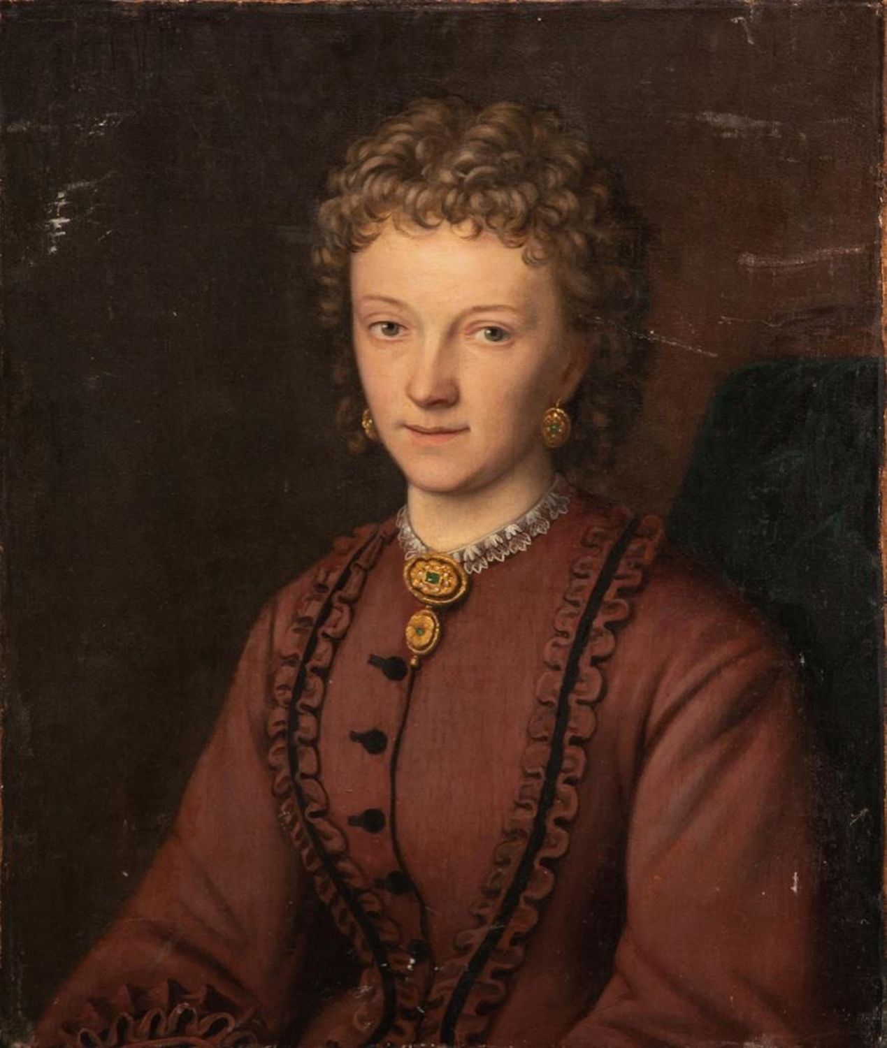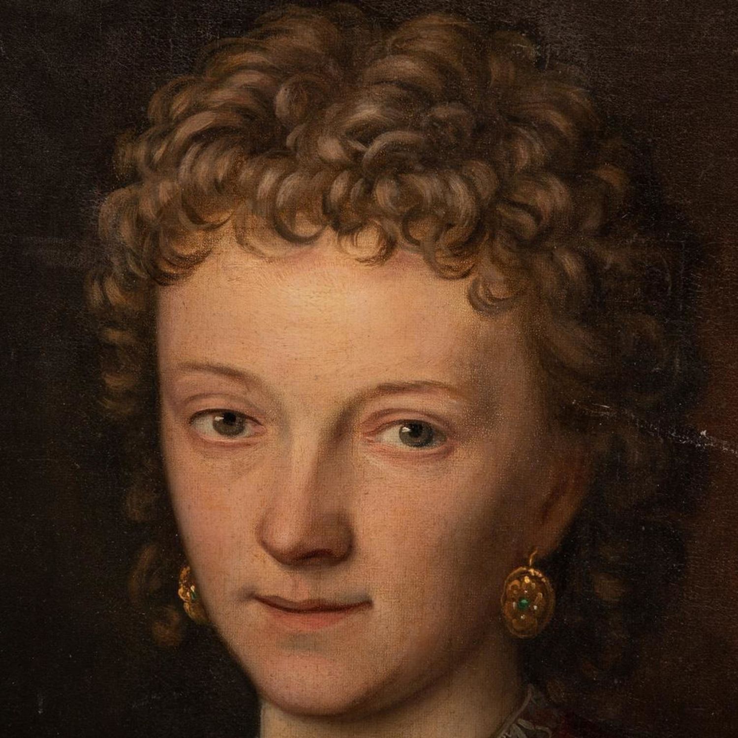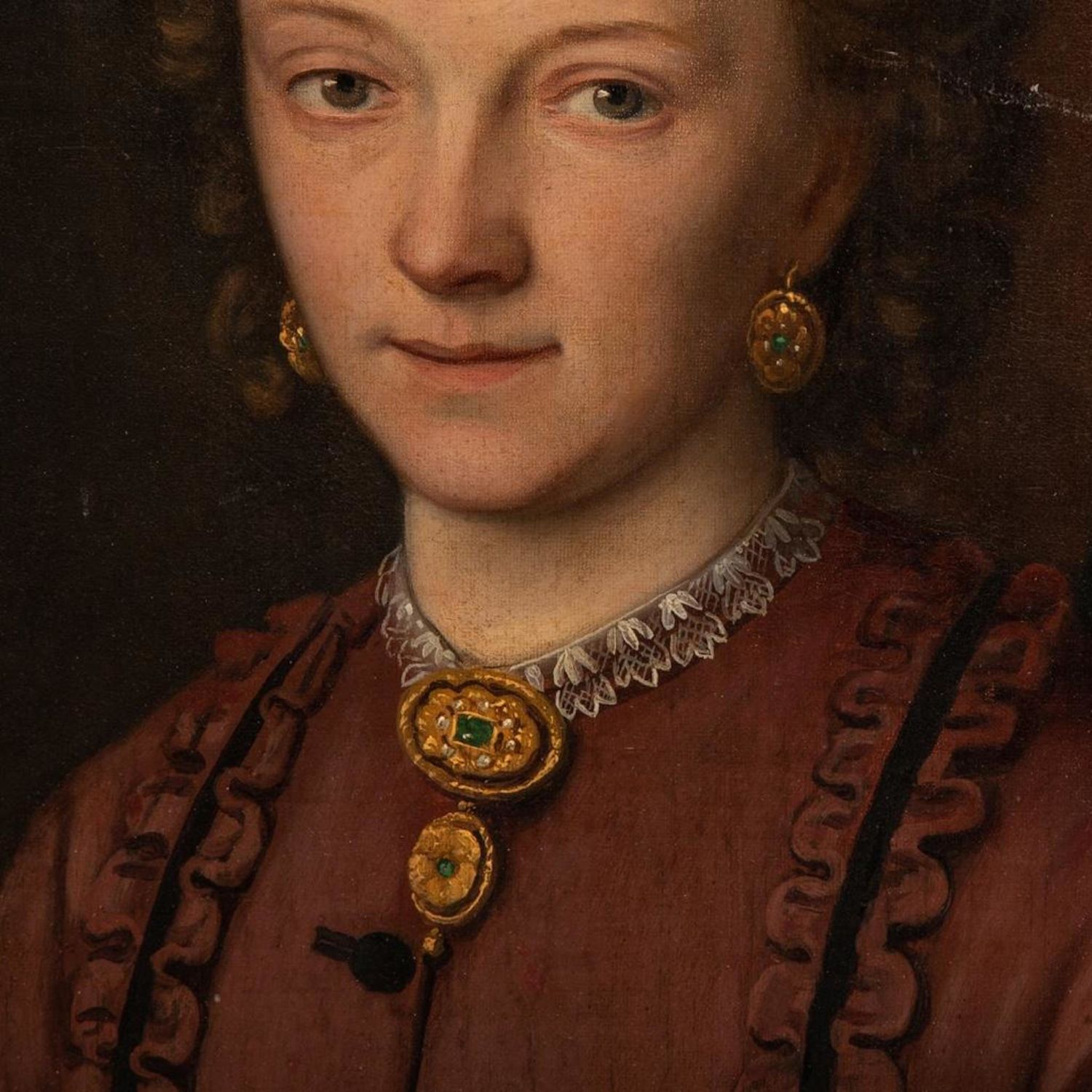 Oil painting Portrait of Girl wearing gold necklace. Circa 1800. Relined. Measures 19"W x 22.5"H in good condition overall