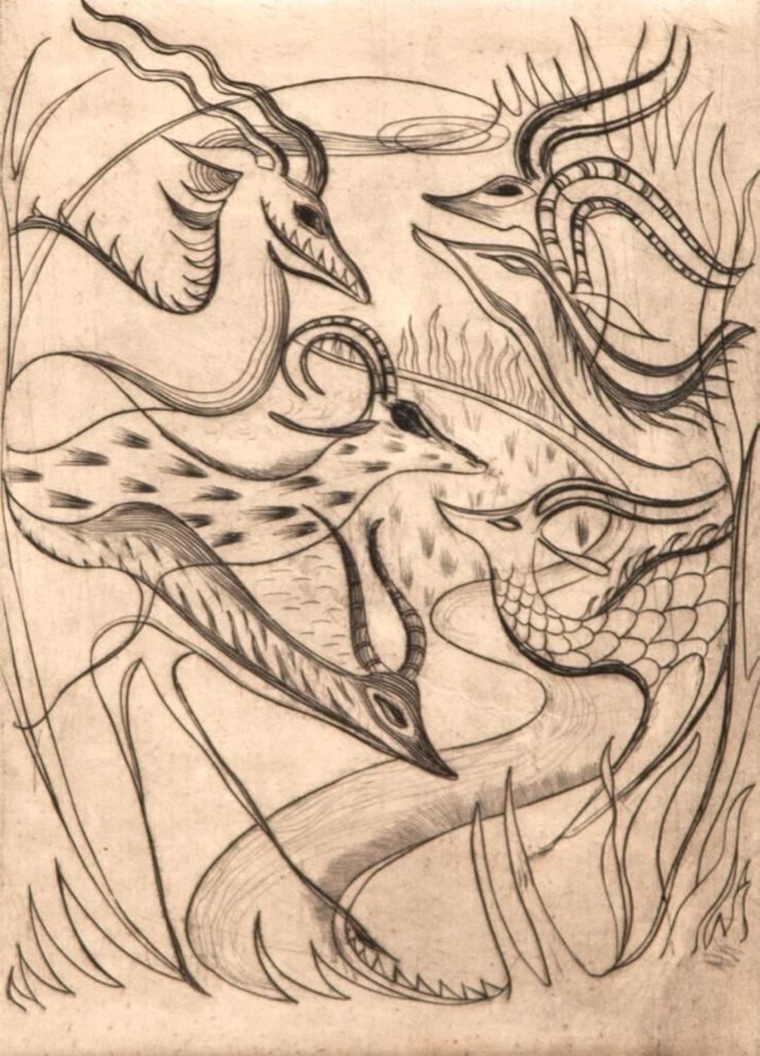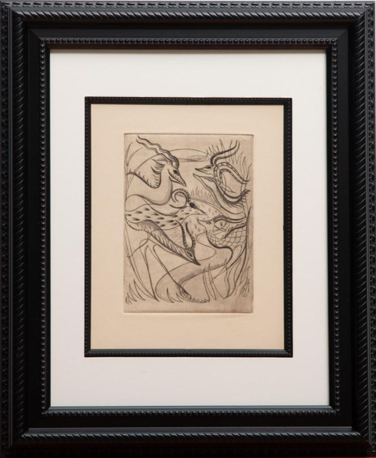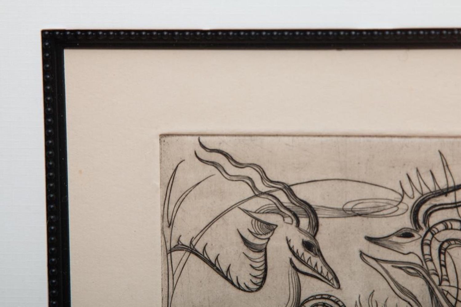 John Fenton Etching .Measures 14 1/2" x 17 1/2" Framed: 5" x 7" Visible art Approx. Painter, printmaker and teacher John Fenton was born in Mountaindale, New York. He moved with his family to Mount Vernon, New York, where he lived for some thirty years before settling permanently in Woodstock, New York. He attended The Art Student’s League of New York and Atelier 17, Paris. His work was the focus of a number of one-man shows during the 1950s and 1960s, and was exhibited in numerous museums and galleries including the Art Institute of Chicago, The Museum of Modern Art in New York, The Corcoran Gallery in Washington, D.C. And the Pennsylvania Academy.Fenton taught at New York University and Goddard College. His distinctly surrealist work won awards from the American Academy of Arts and Letters, the National Academy of Design, and numerous other institutions, and is included in the collections of the Smithsonian American Art Museum, the Corcoran Gallery among others. He died at Woodstock, New York.