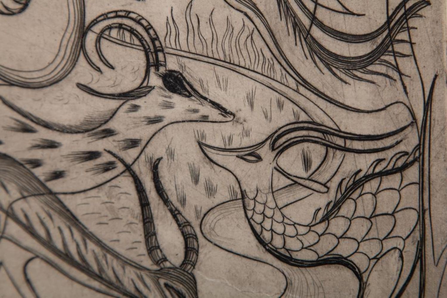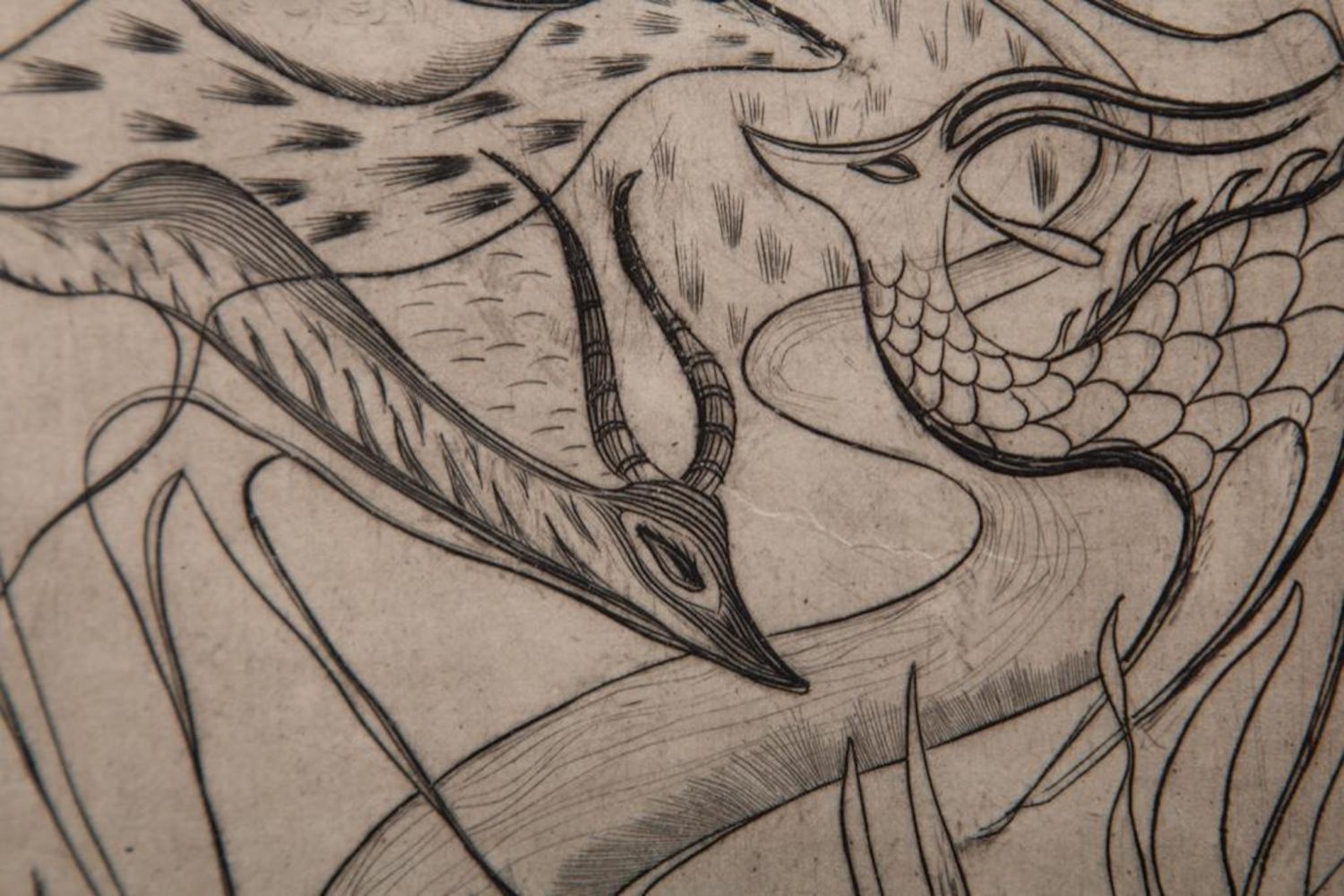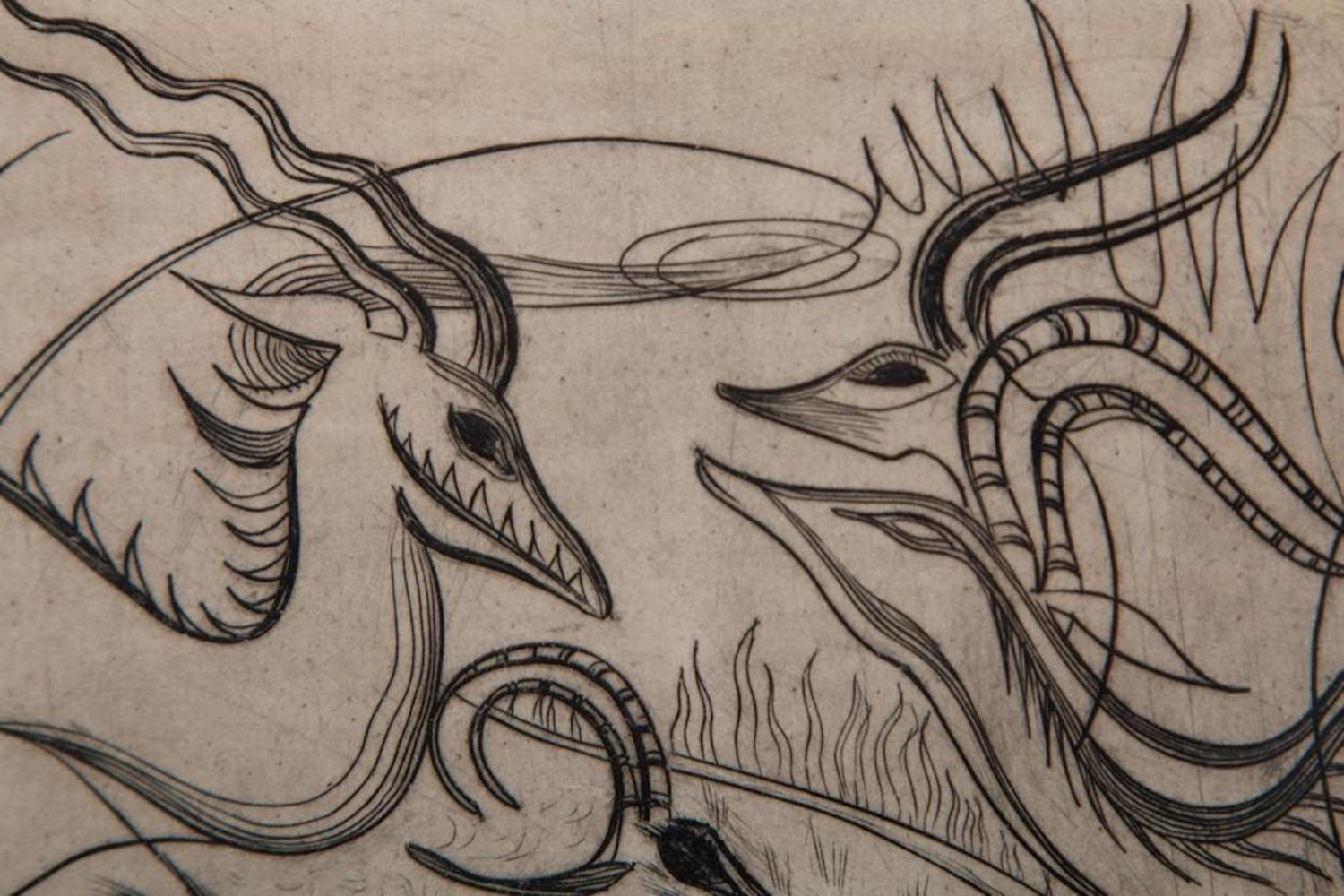 John Fenton Etching .Measures 14 1/2" x 17 1/2" Framed: 5" x 7" Visible art Approx. Painter, printmaker and teacher John Fenton was born in Mountaindale, New York. He moved with his family to Mount Vernon, New York, where he lived for some thirty years before settling permanently in Woodstock, New York. He attended The Art Student’s League of New York and Atelier 17, Paris. His work was the focus of a number of one-man shows during the 1950s and 1960s, and was exhibited in numerous museums and galleries including the Art Institute of Chicago, The Museum of Modern Art in New York, The Corcoran Gallery in Washington, D.C. And the Pennsylvania Academy.Fenton taught at New York University and Goddard College. His distinctly surrealist work won awards from the American Academy of Arts and Letters, the National Academy of Design, and numerous other institutions, and is included in the collections of the Smithsonian American Art Museum, the Corcoran Gallery among others. He died at Woodstock, New York.