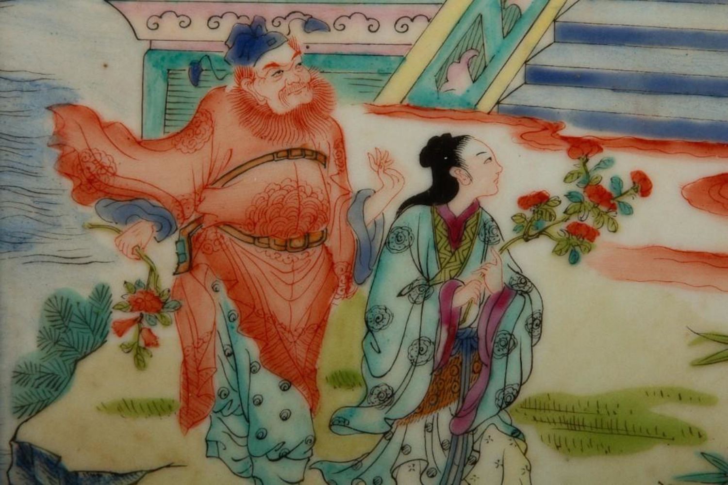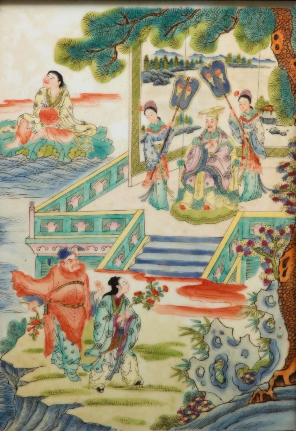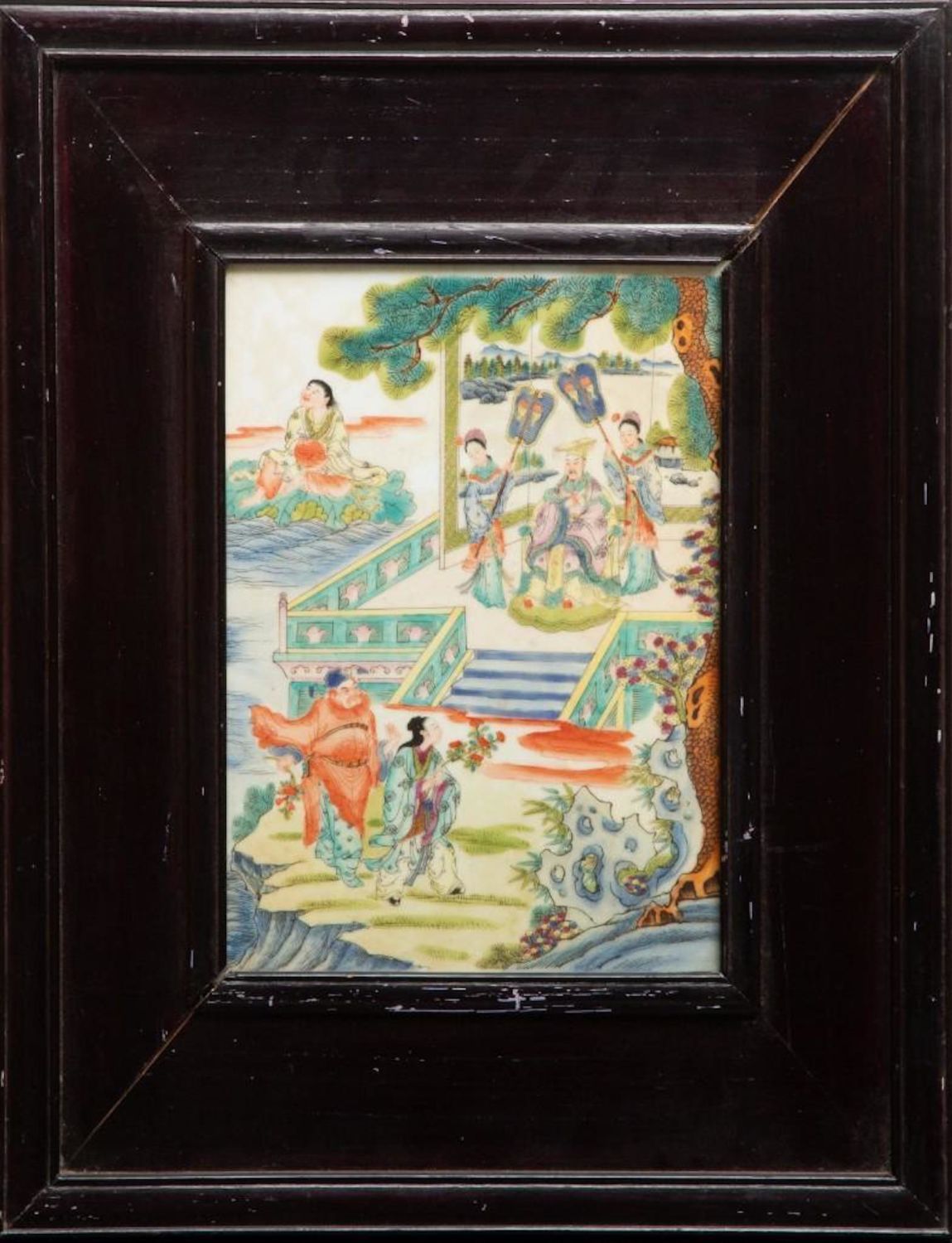 Antique Chinese Painting on Porcelain. Measures 9"W x 13"H visible approx. 14" x 21" Framed Approx in good condition overall