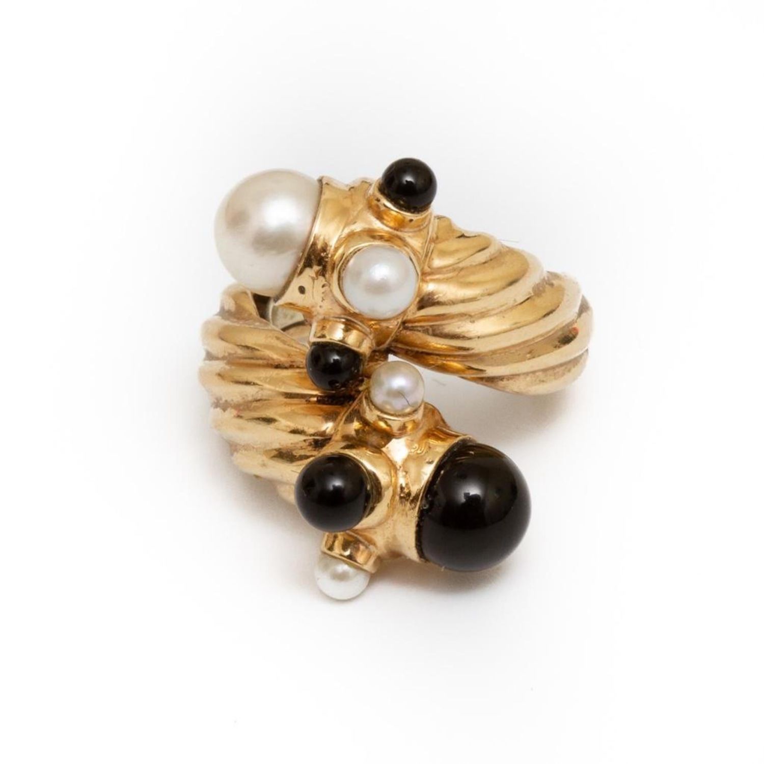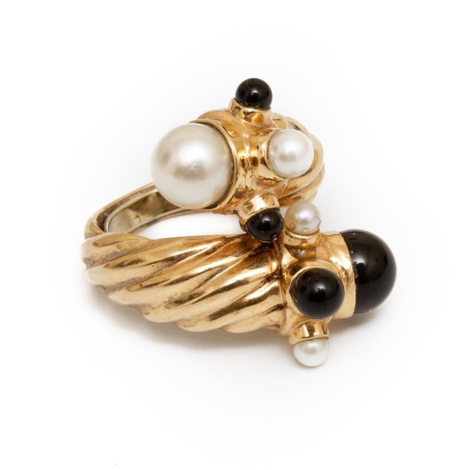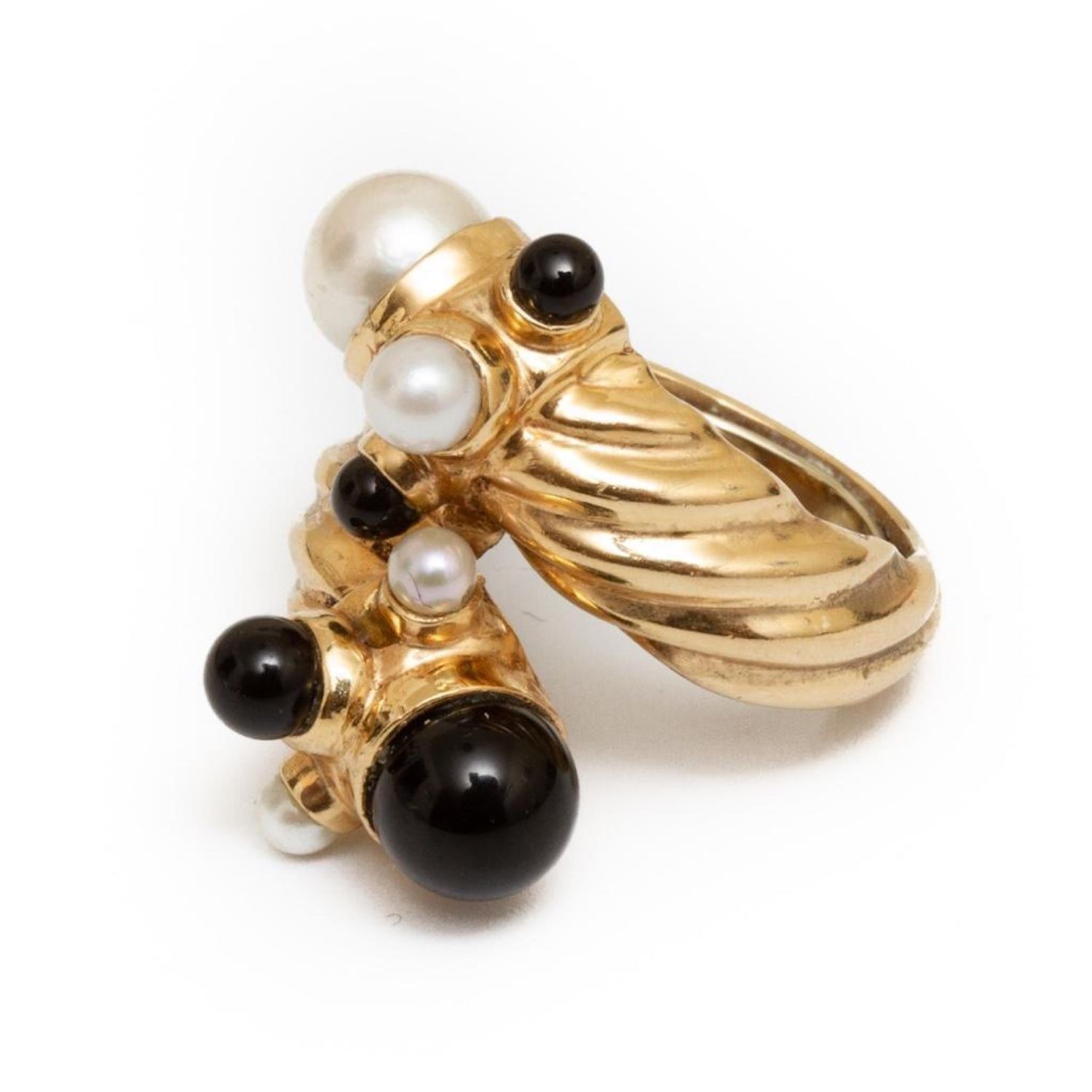 vintage 18k gold black onyx and pearl bypass ring approx size 6 and has a retainer signed RZ From a noted jewelry collection Park Avenue New York in good condition overall