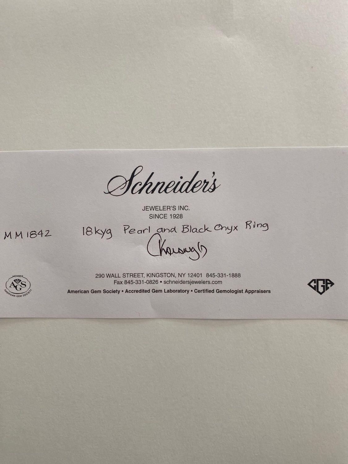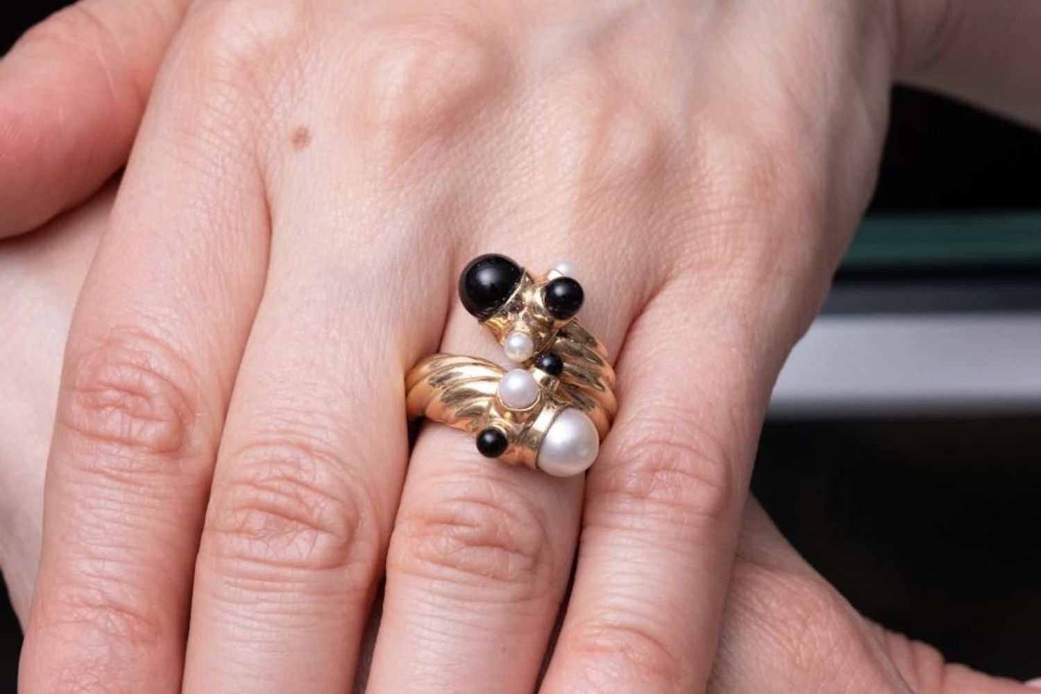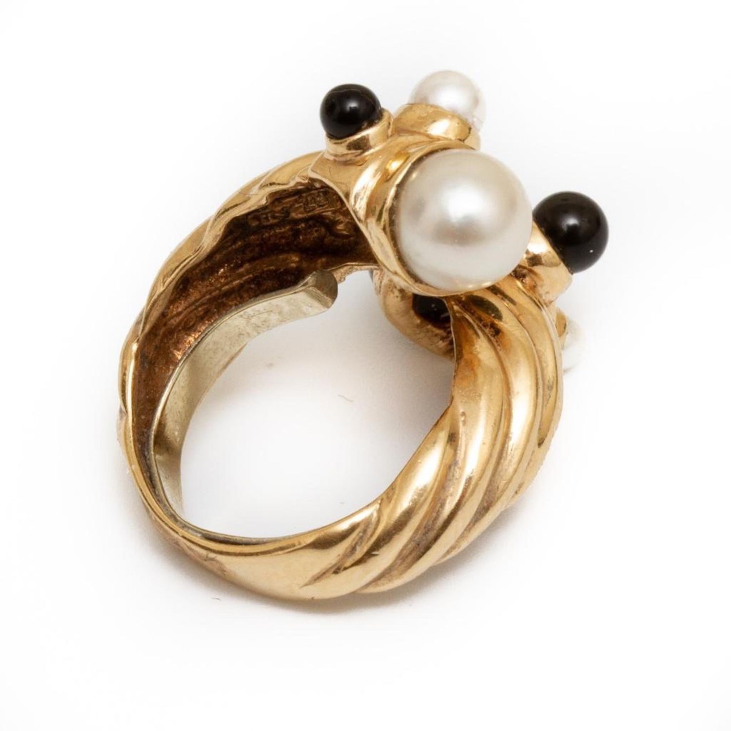 vintage 18k gold black onyx and pearl bypass ring approx size 6 and has a retainer signed RZ From a noted jewelry collection Park Avenue New York in good condition overall