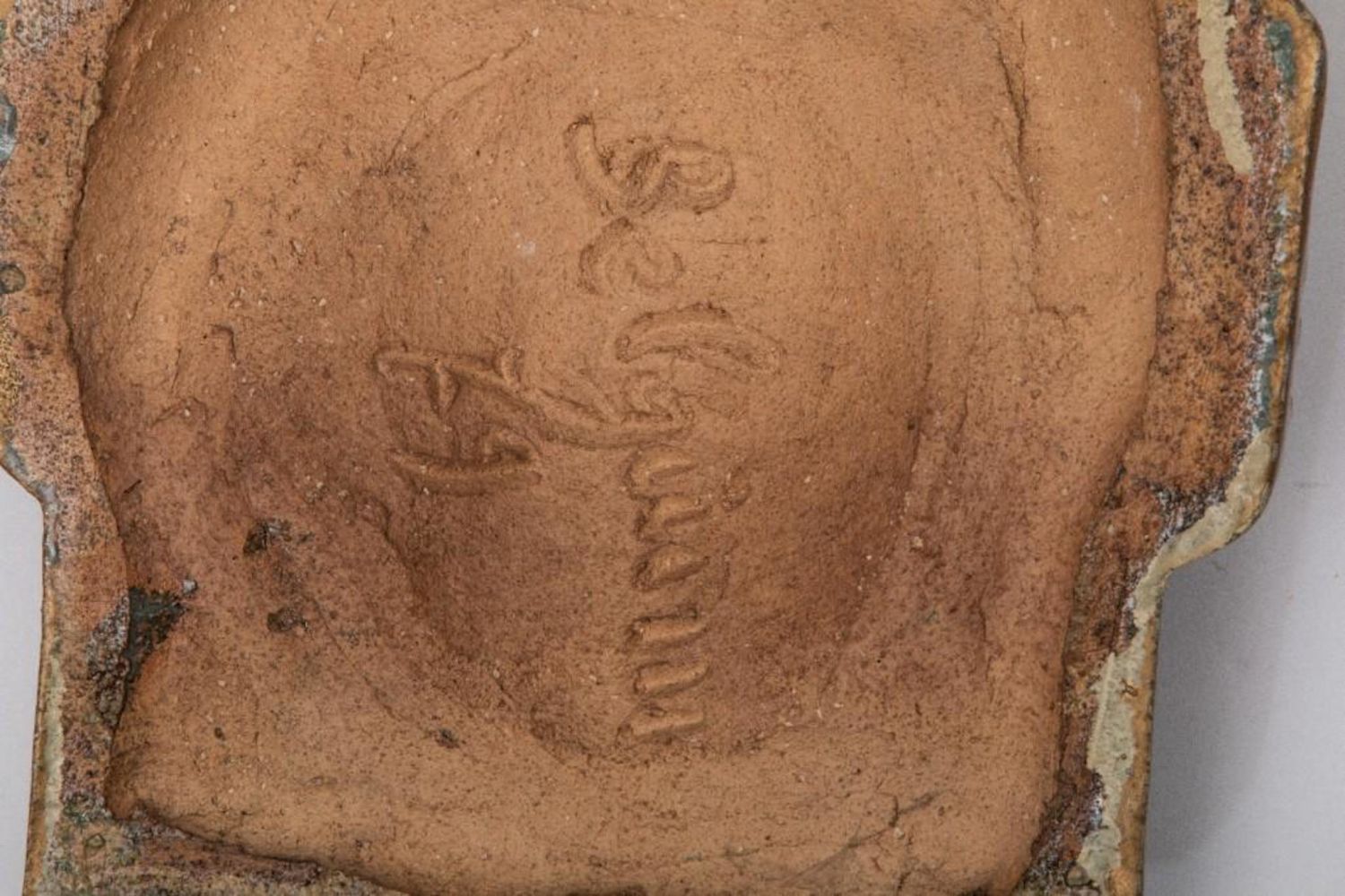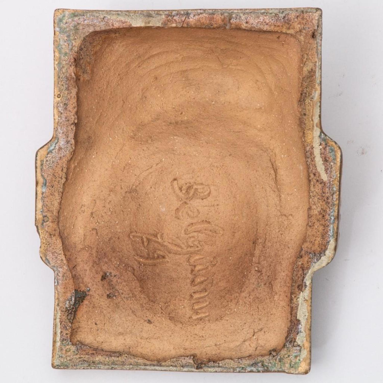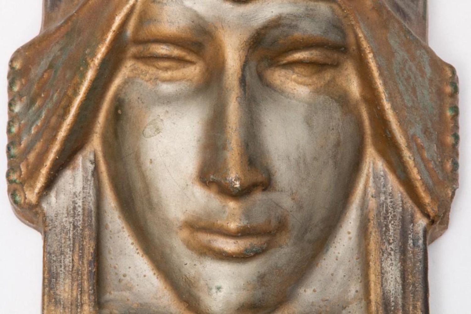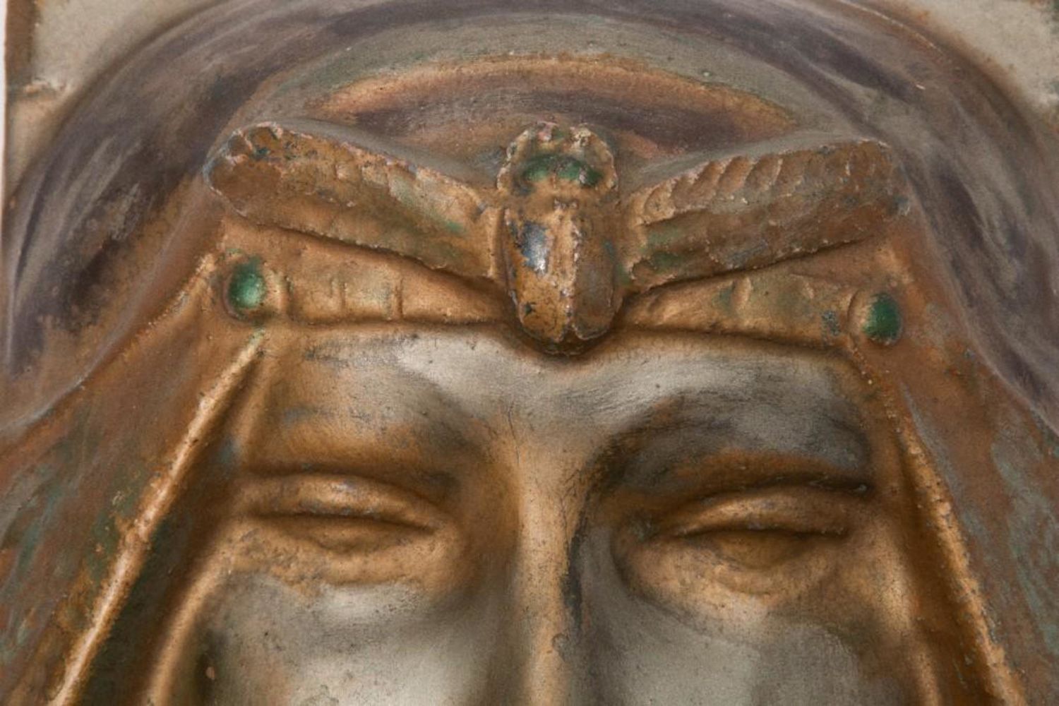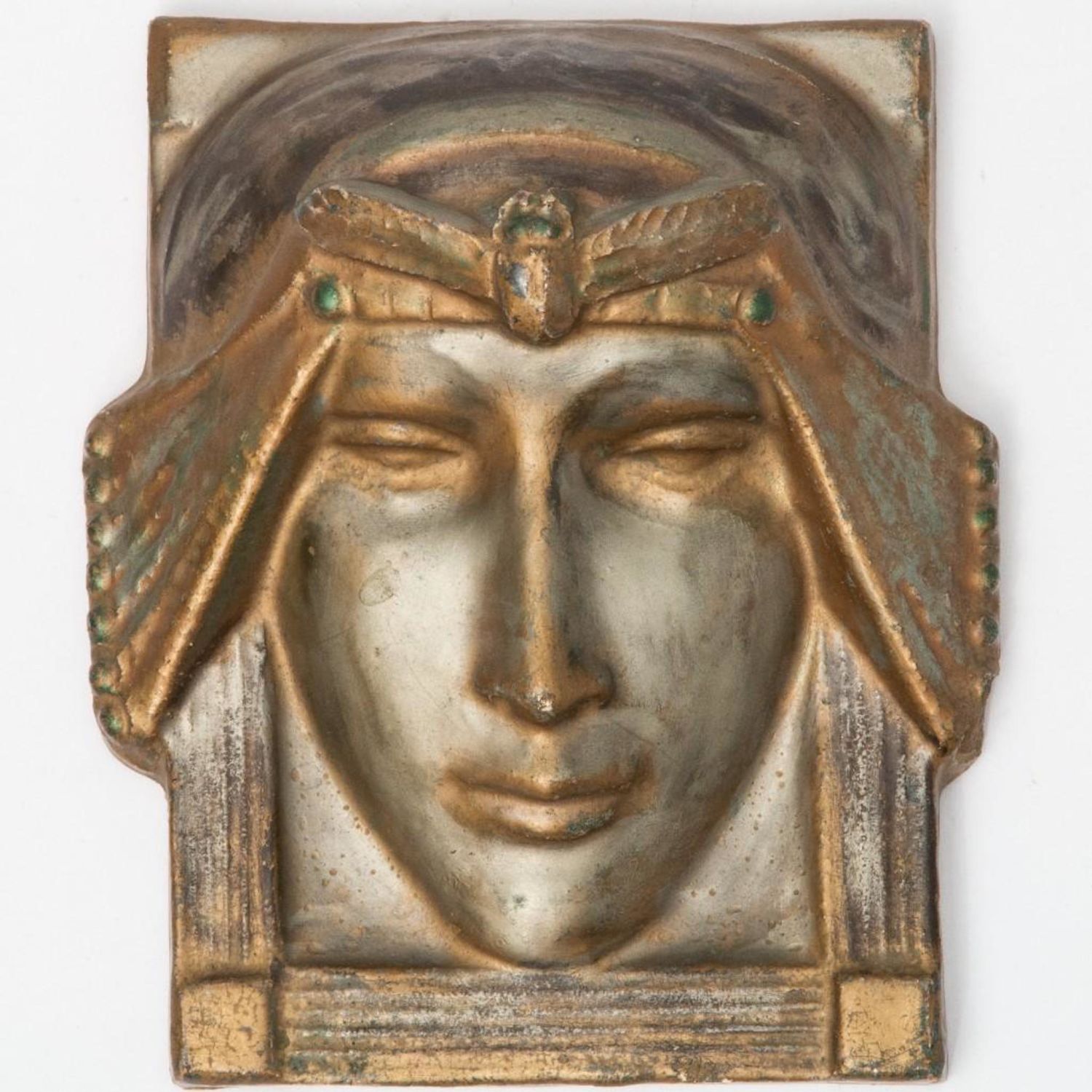 Belgian Art Nouveau, Vienna secession, jugenstihl, Stoneware architectural. element or plaque, with green iridescent glaze, depicting face of women wearing Egyptian revival headpiece with center scarab, marked "Belgium" on the base. Measures. 9”H x 7.5”W. good condition