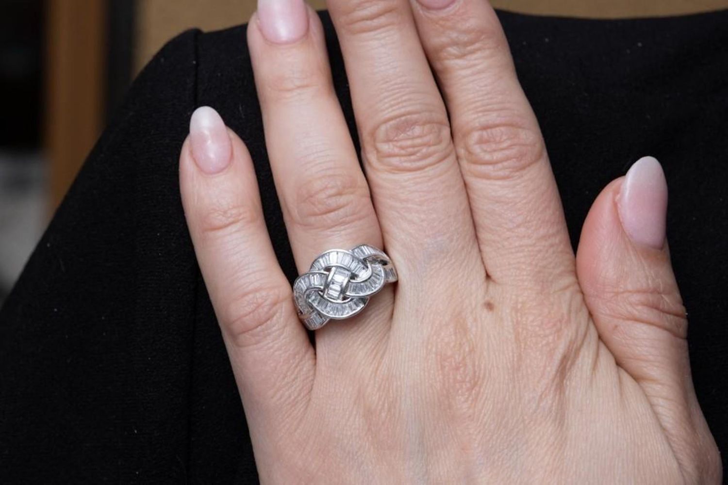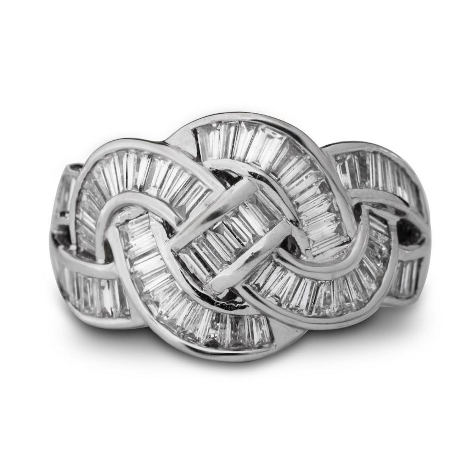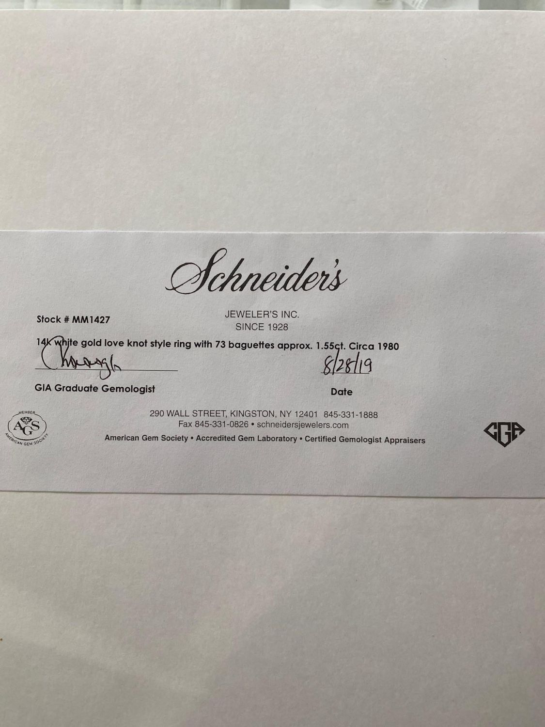 vintage 14k white gold channel set knot design diamond ring approx 1.55ct size 7 Circa 1980. 4.3dwt This lot is accompanied by a GIA appraiser letter from an independent and well respected firm established over 75 years ago. in good condition overall