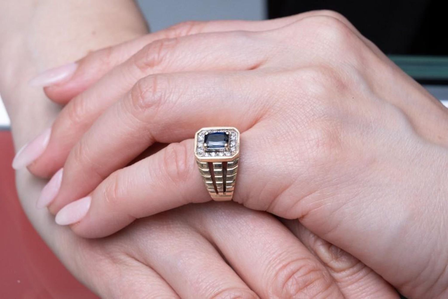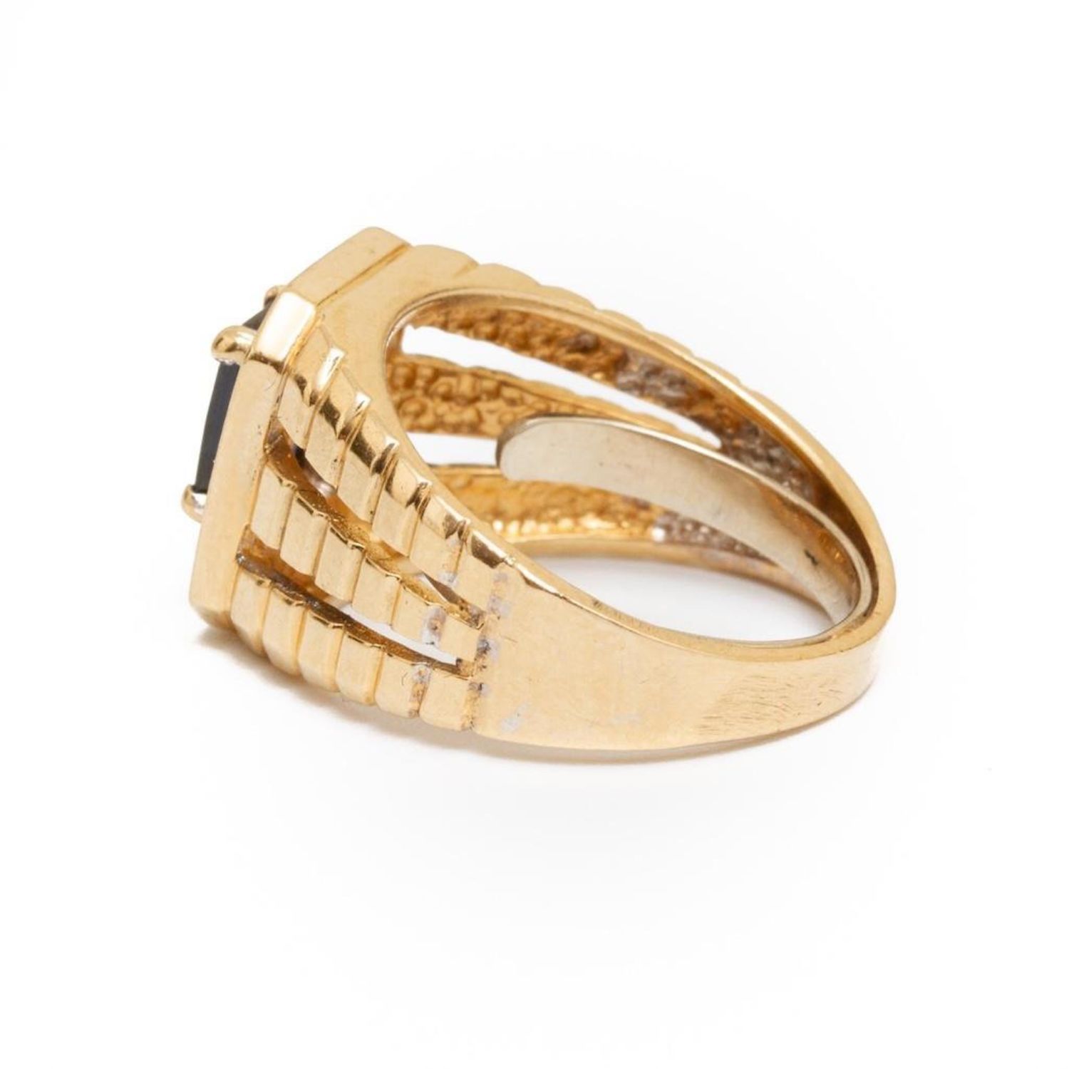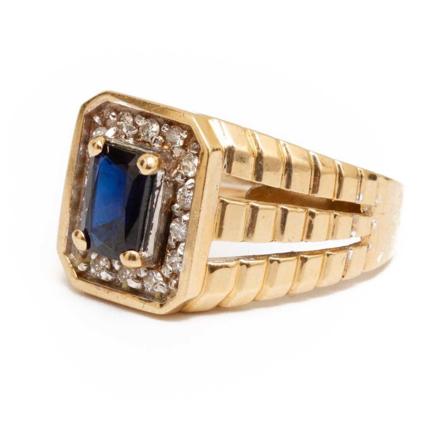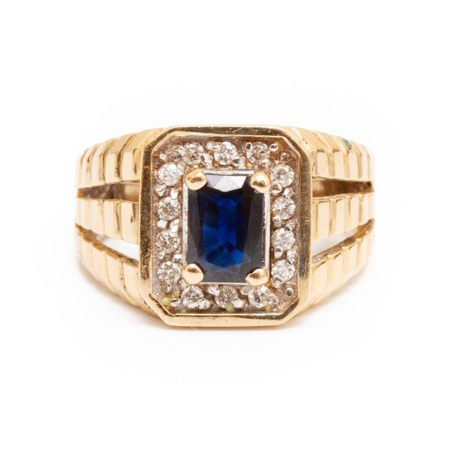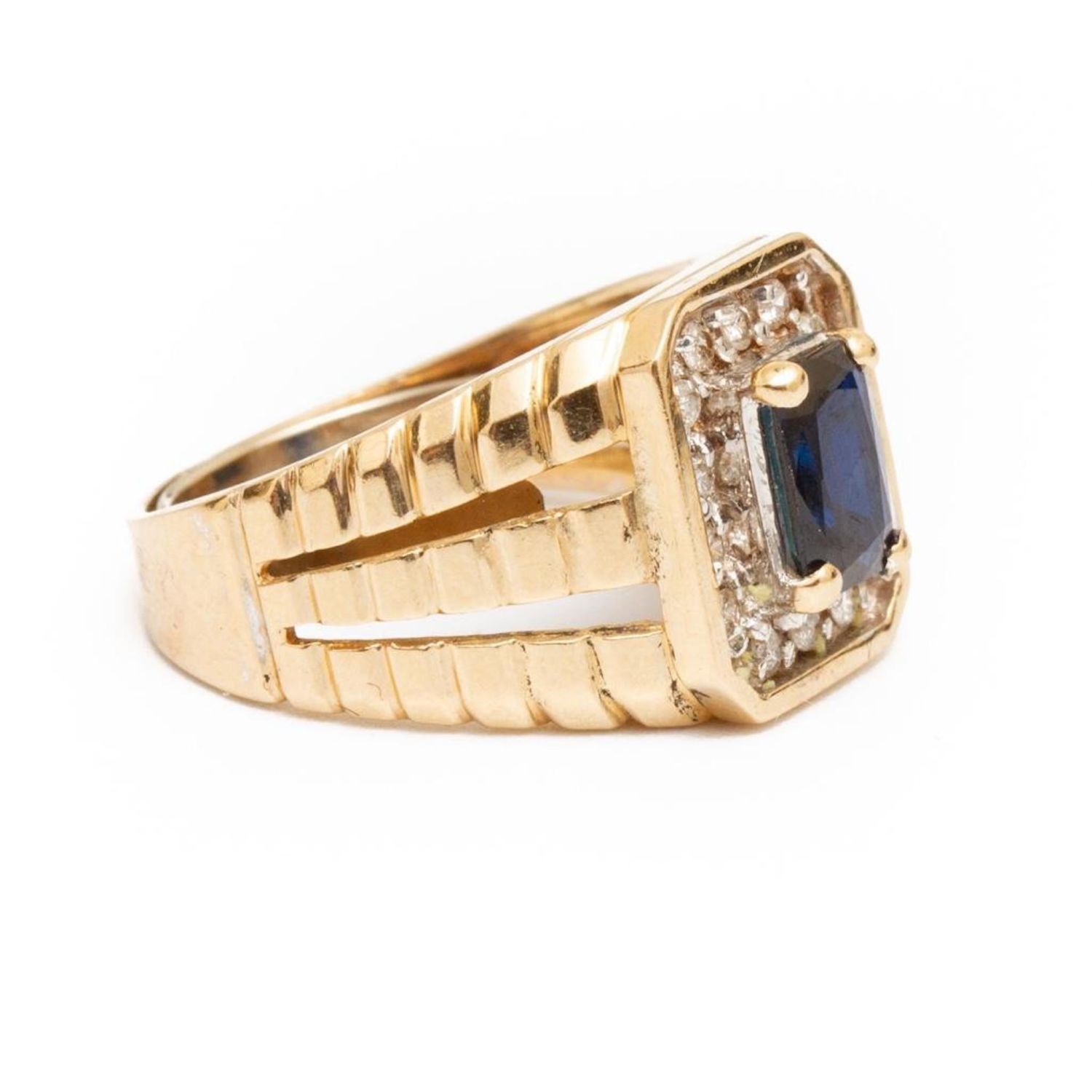 vintage 14k gold ring with a single cut sapphire of approx. .8 ct surrounded by small round diamonds weight approx. 3.6 dwt and size approx. 6 From a noted jewelry collection Park Avenue New York