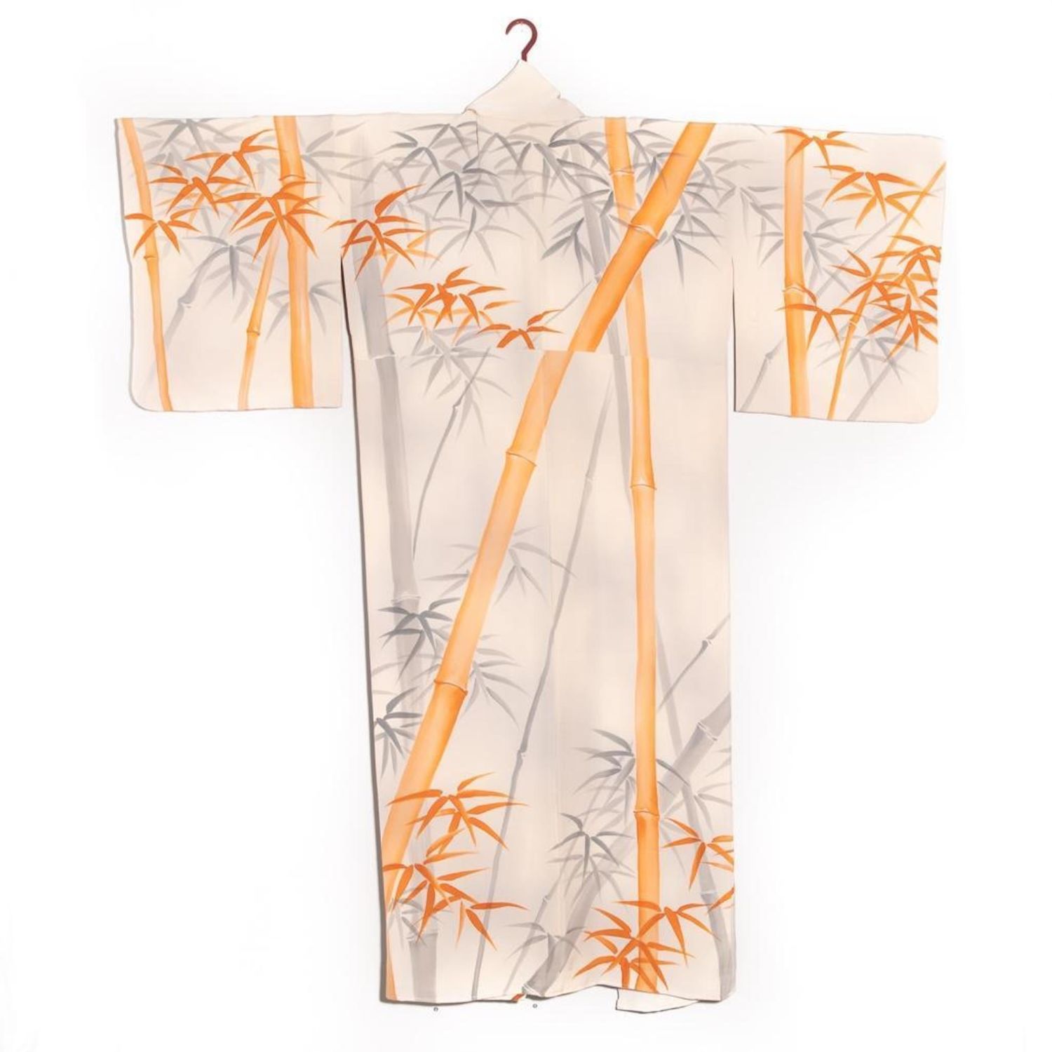 kimono circa 1940s vintage handwoven silk kimono. This cream silk kimono features a hand painted orange and gray bamboo motif. The interior is lined in a cream silk with gray ombré accent along the hemline. In good condition 50" sleeve span, 60" overall length in good condition overall