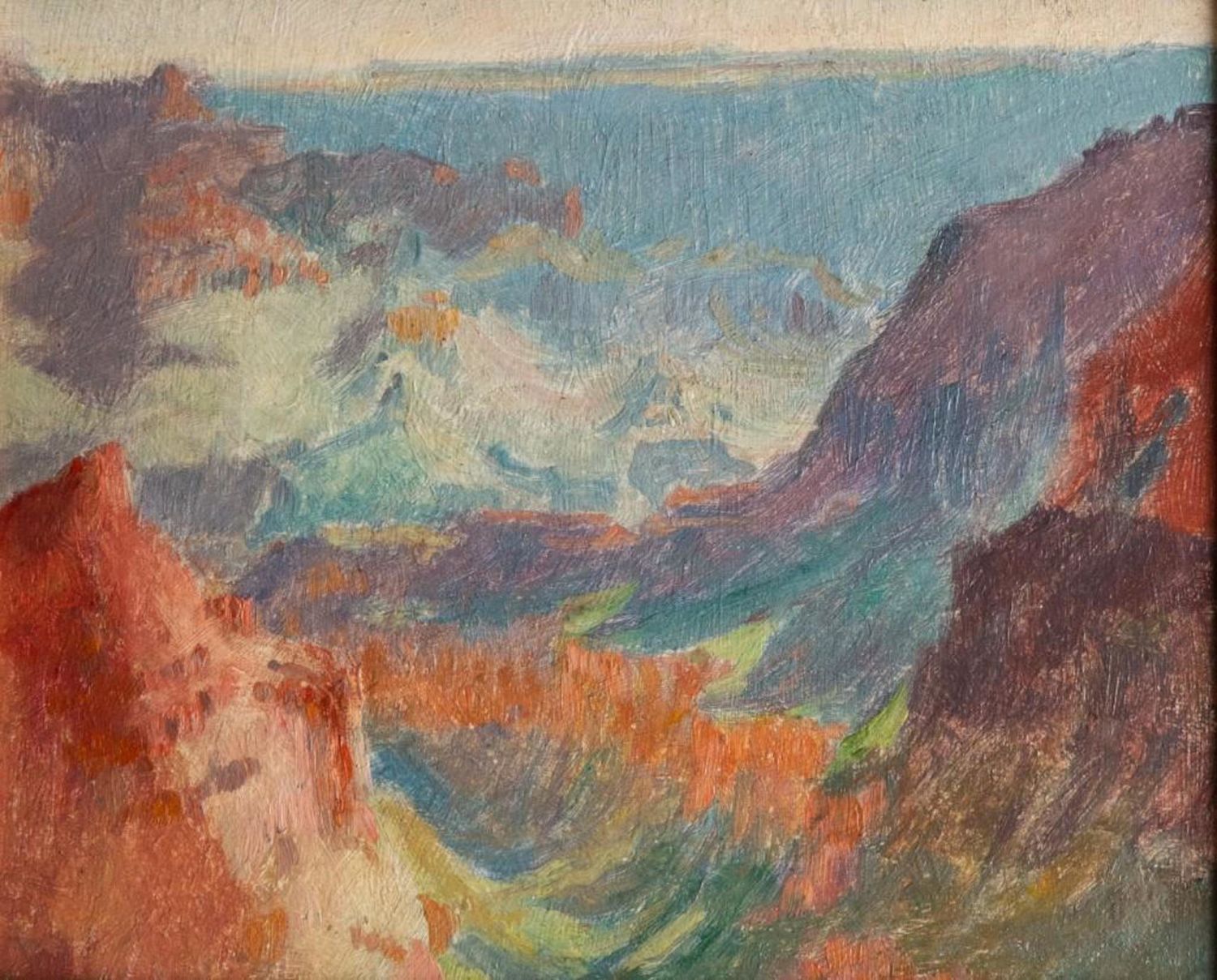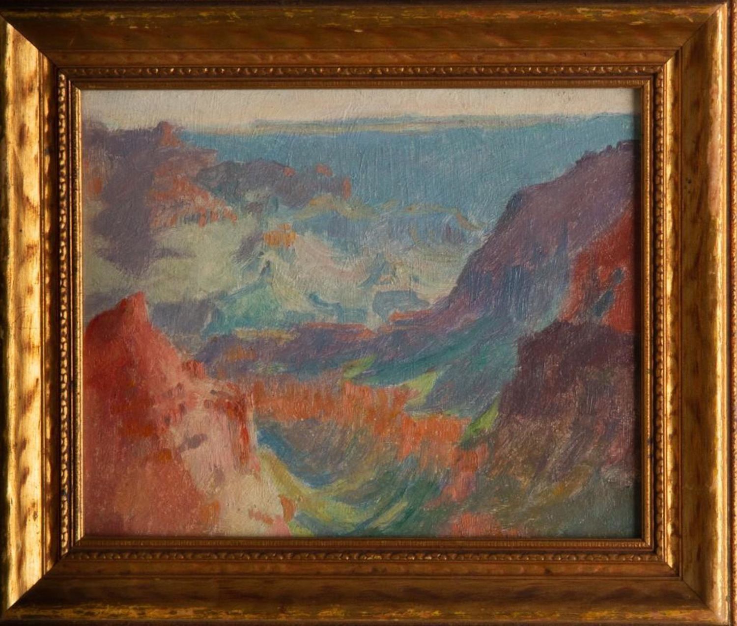 Vintage Antique Grand Canyon American Impressionist Painting on Academy Board in a gilt wood frame. Measures 10" x 12" approx. Signed Illeg on verso. Either Park, Parks or Parker? in good condition overall