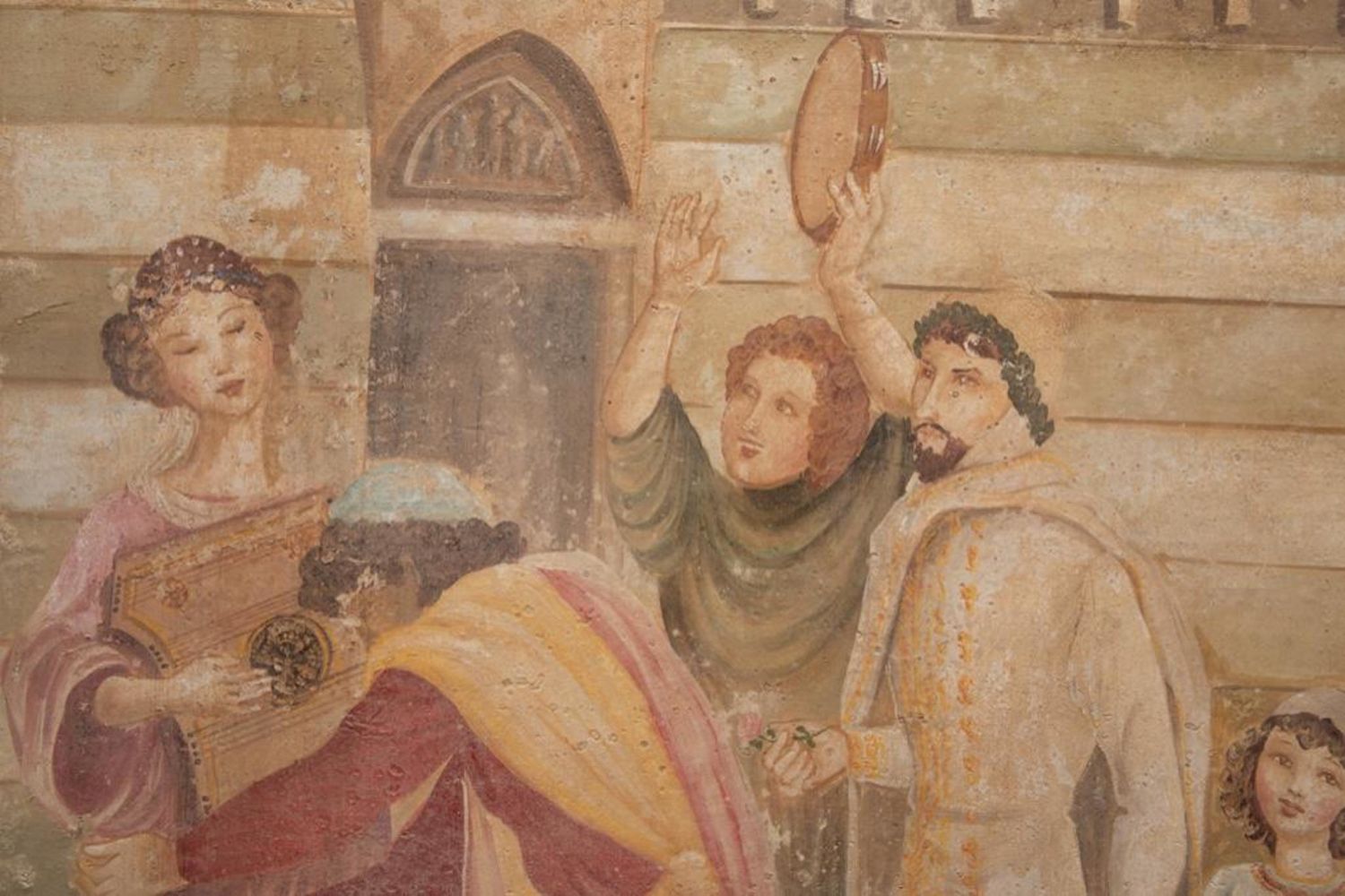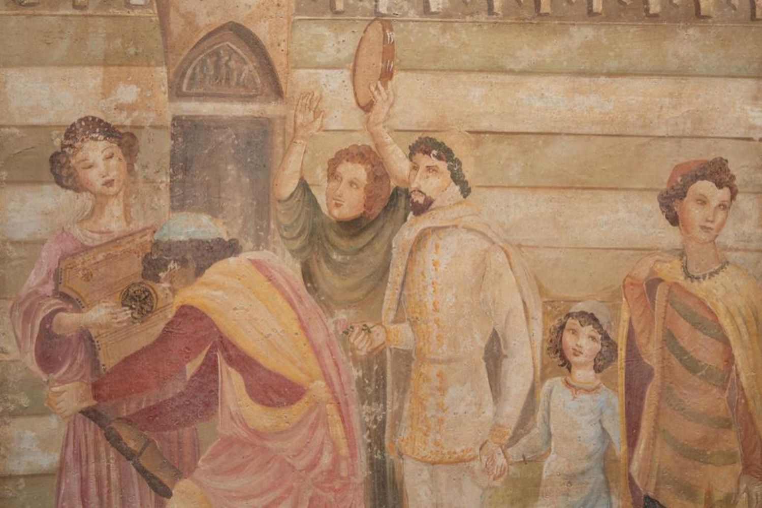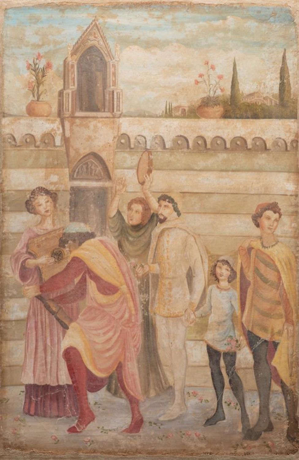 Large French classical fresco technique painting depicting a court celebration with dancing Measure 59 in h x 39 in W Approx. In Fair Condition. Some intentional aging visible for more classical fresco look. early 20th century in good condition overall