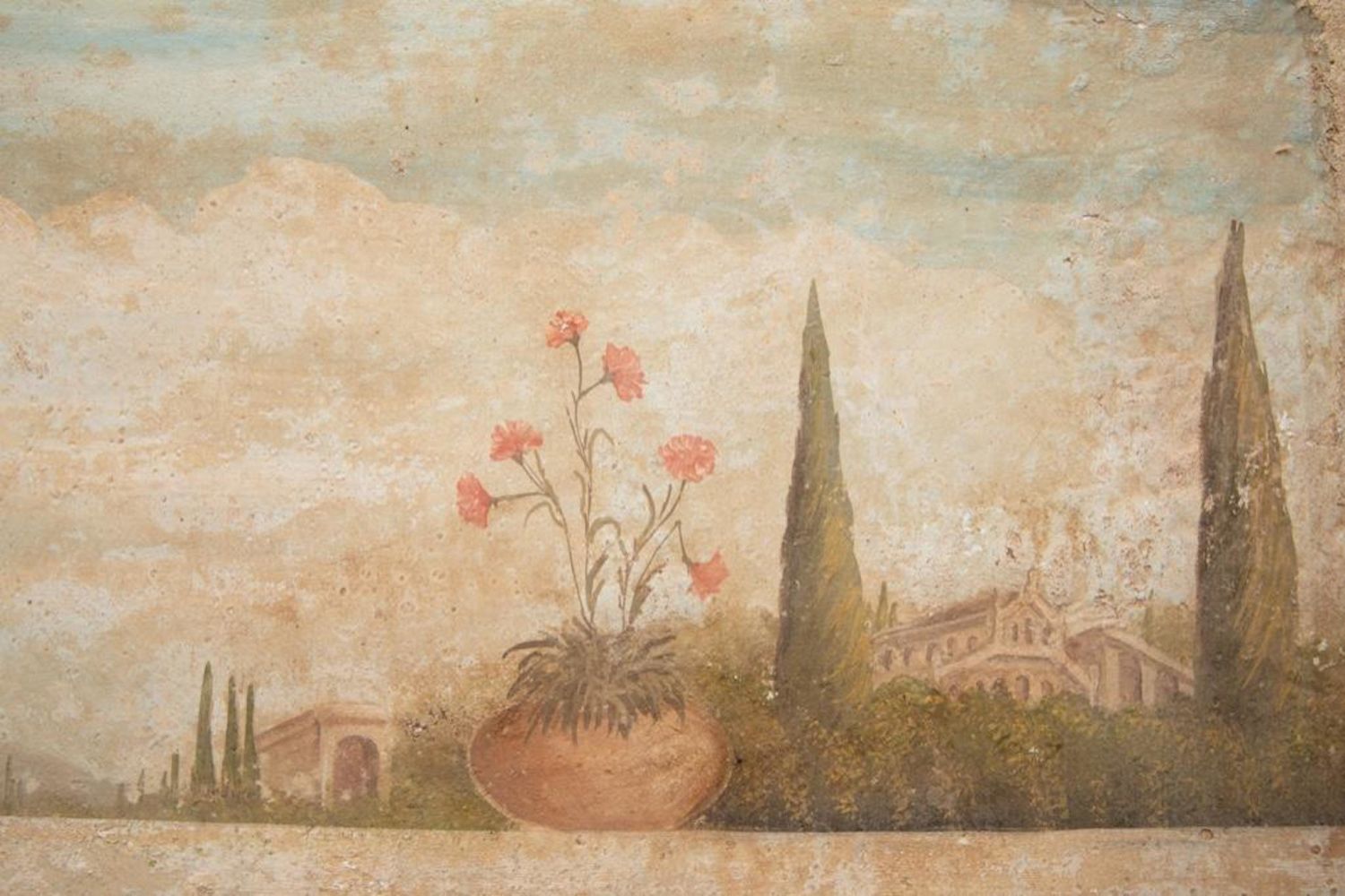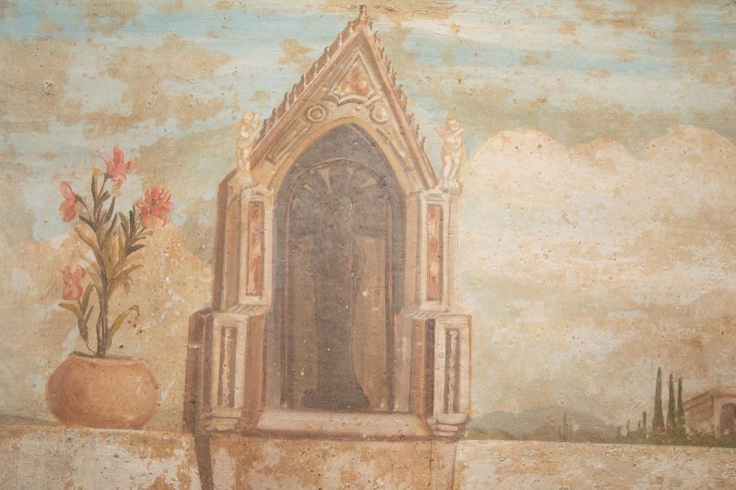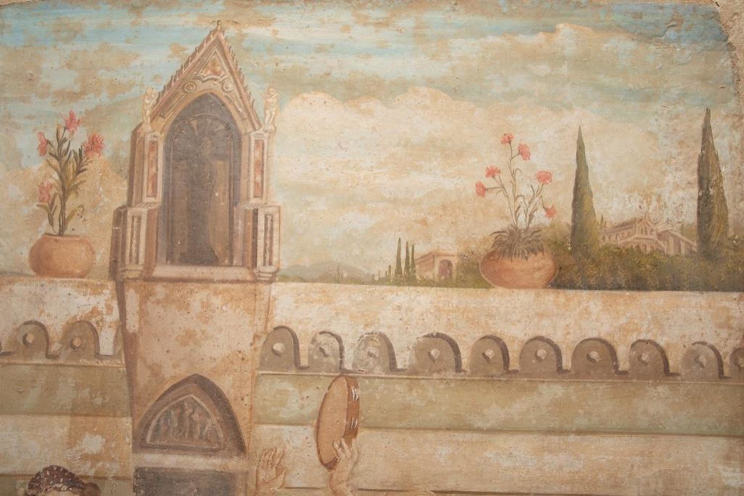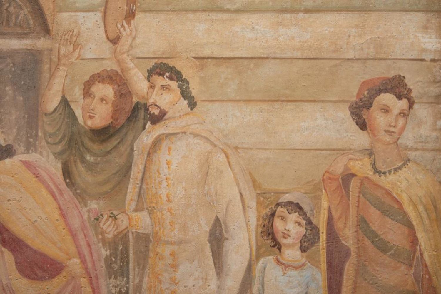 Large French classical fresco technique painting depicting a court celebration with dancing Measure 59 in h x 39 in W Approx. In Fair Condition. Some intentional aging visible for more classical fresco look. early 20th century in good condition overall