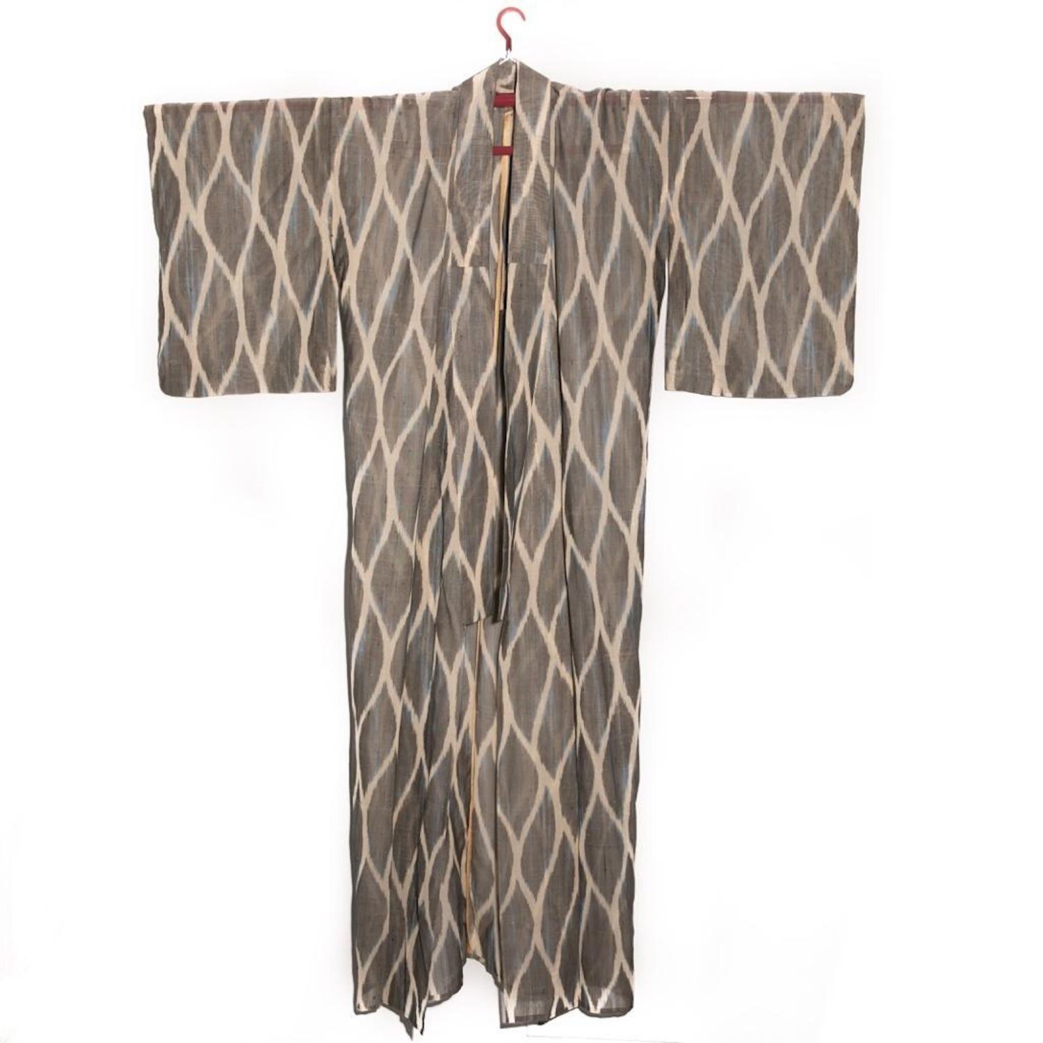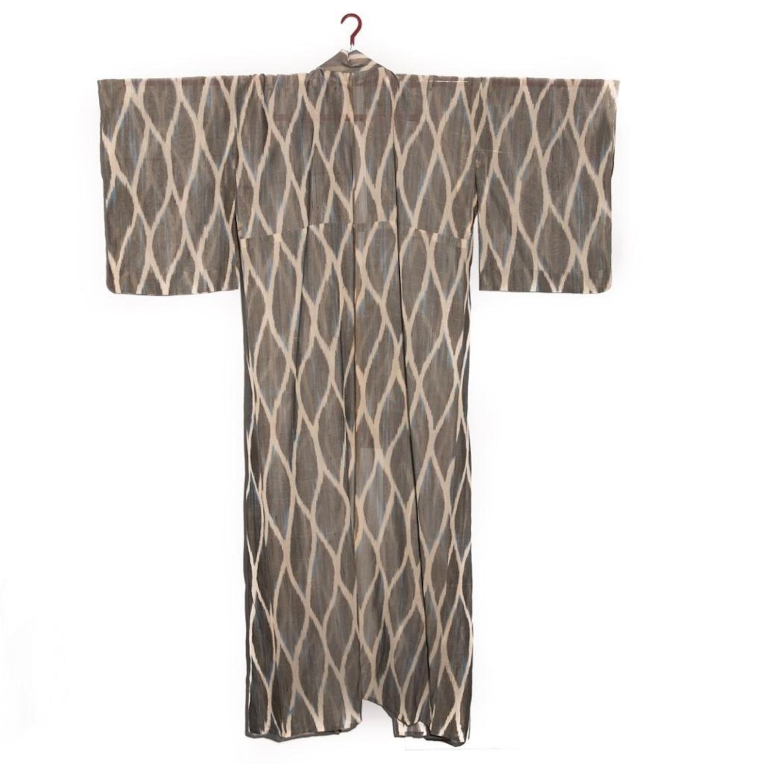 circa 1910 antique ikat handwoven silk kimono. This kimono features a lattice style pattern rendered in a color palette of grey, off-white, blue and creamin good condition. 48.5" sleeve span, 63" overall length in good condition good condition overall