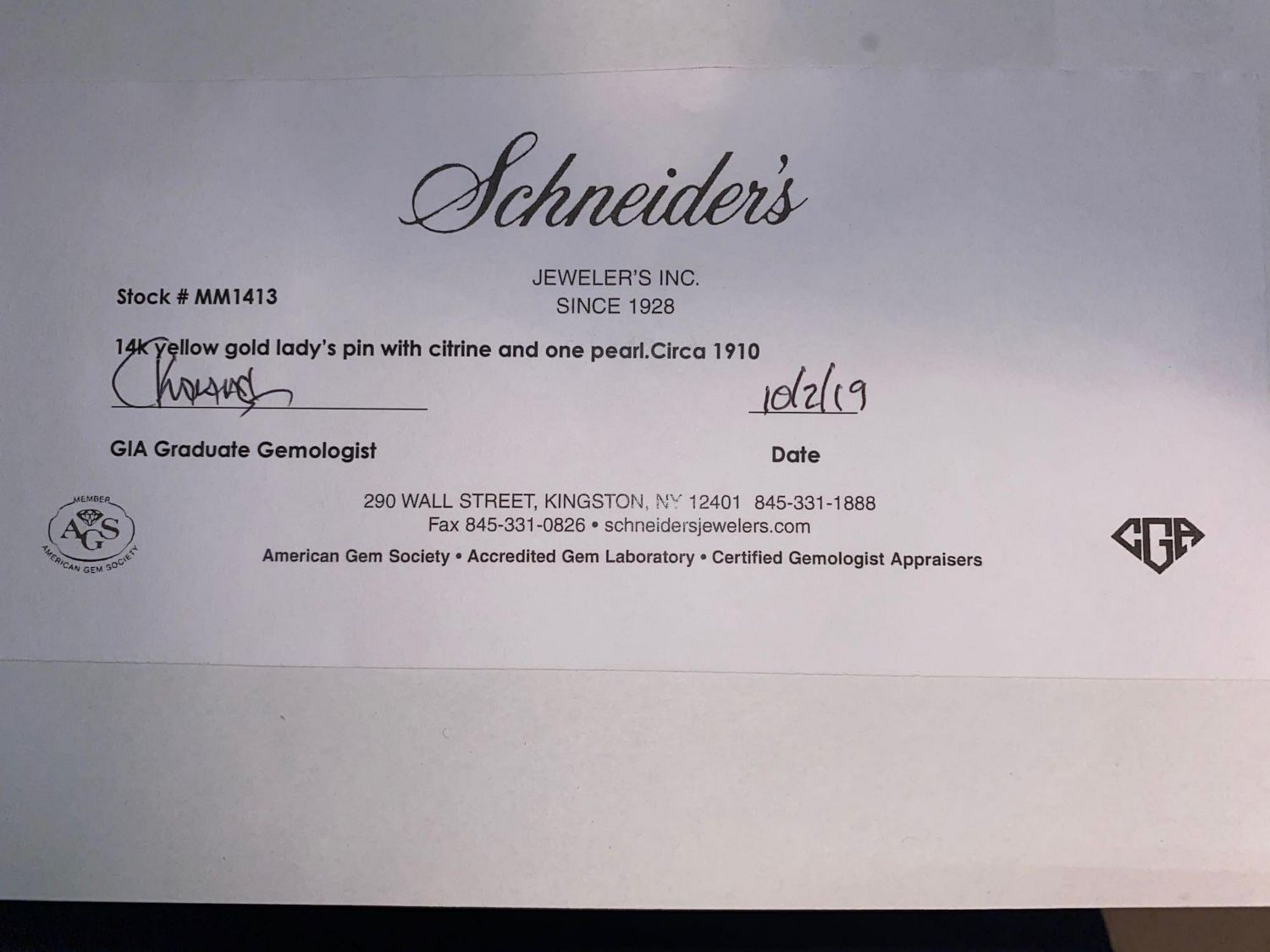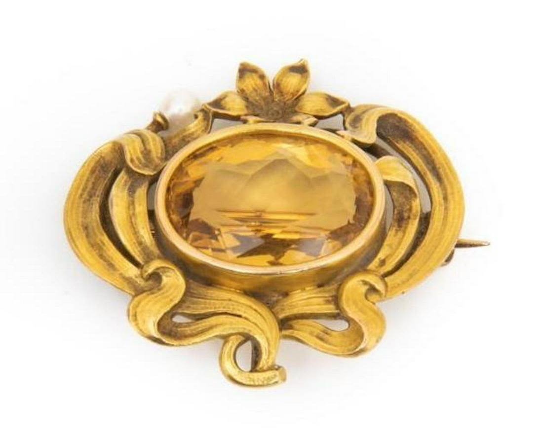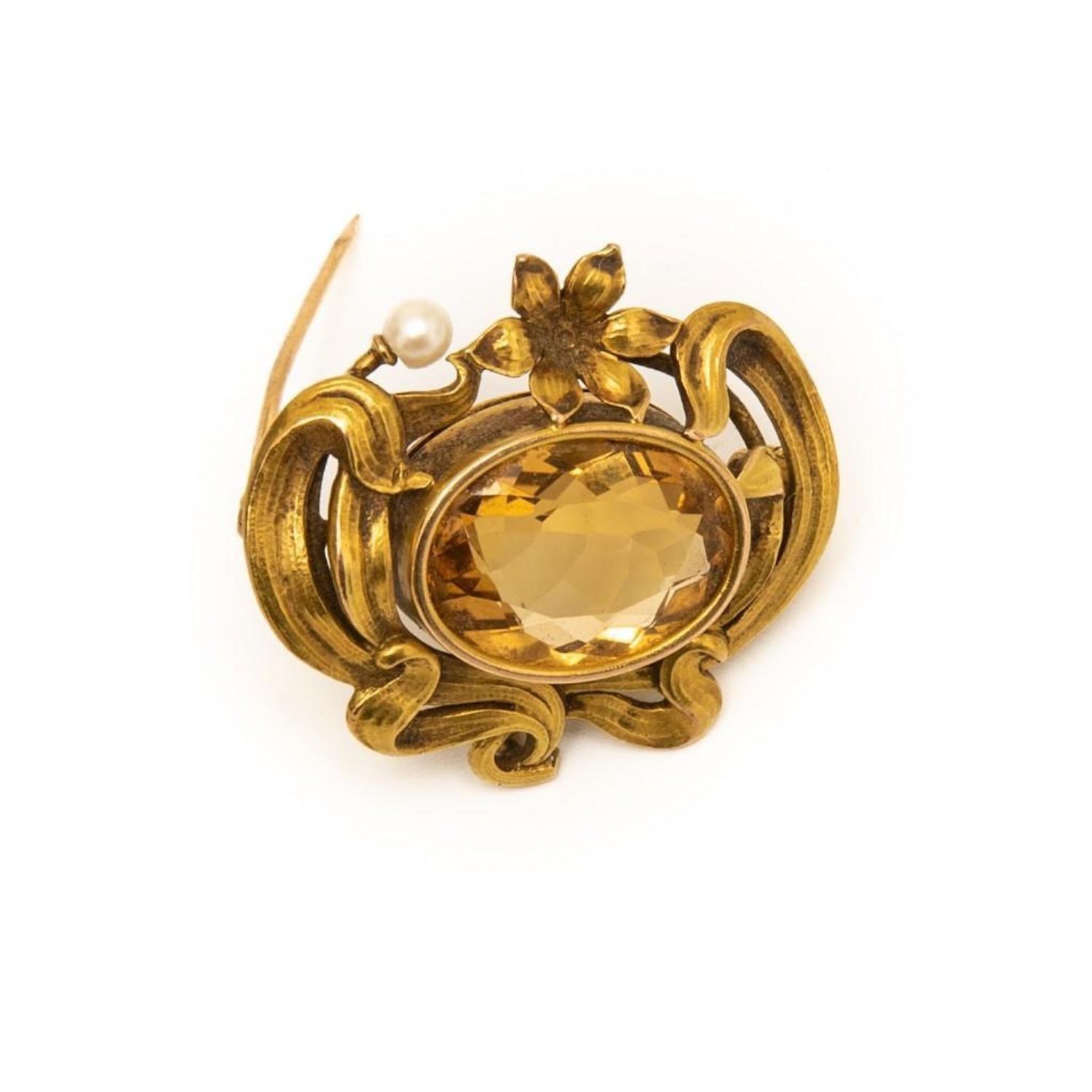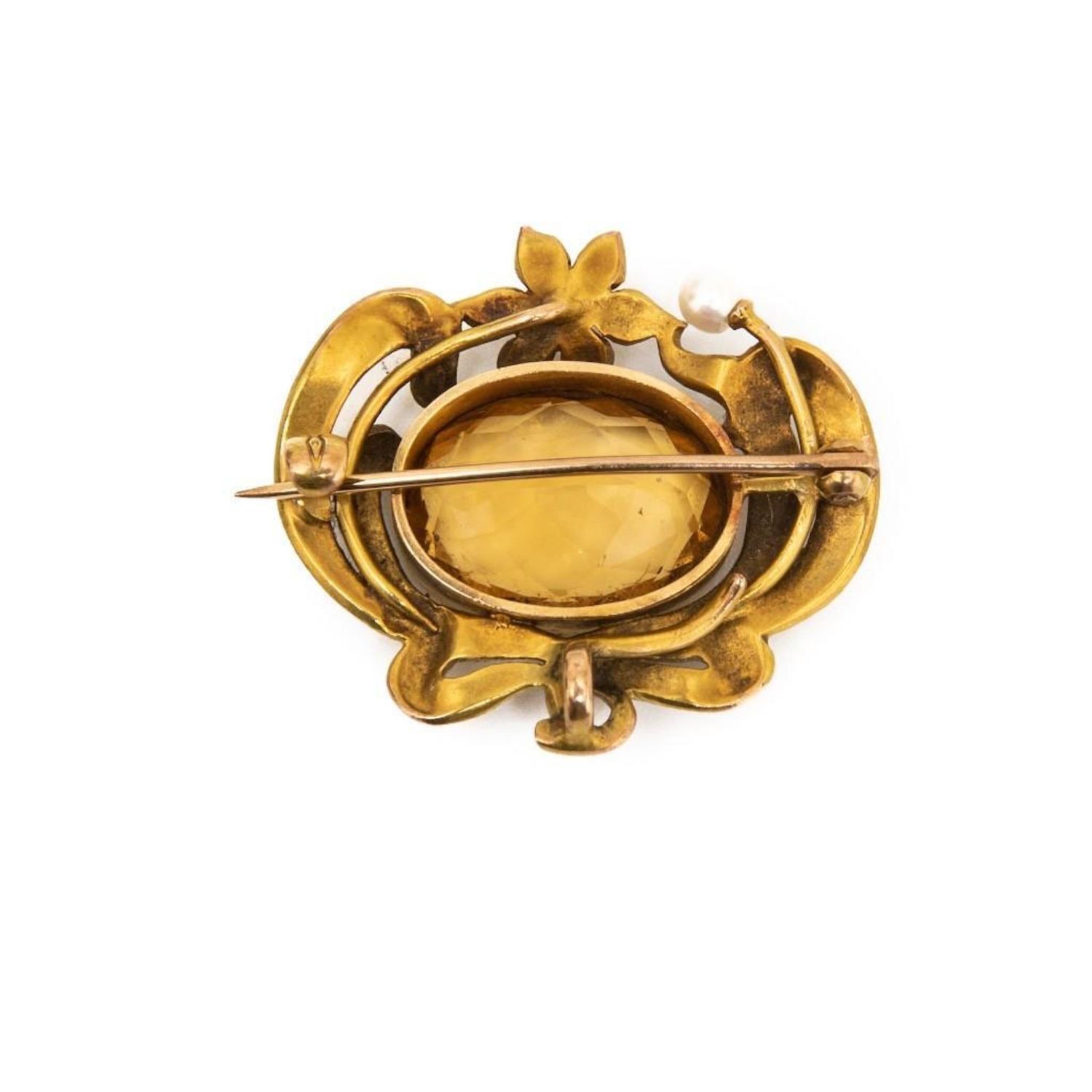 Pendant brooch 14k circa 1910 art nouveau large faceted citrine and pearl stamped by maker "carter gough and co." Measures 1.25" W and weighs 4.8dwt approx. This lot is accompanied by a GIA appraiser letter from an independent and well respected firm established over 75 years ago. in good condition overall