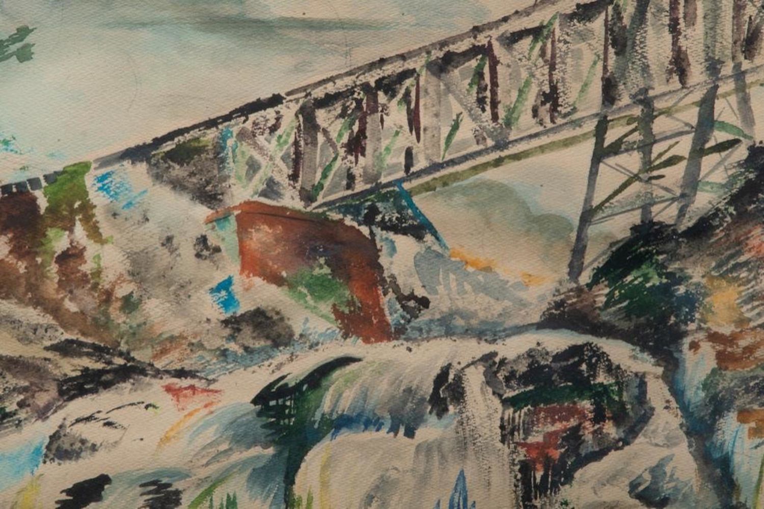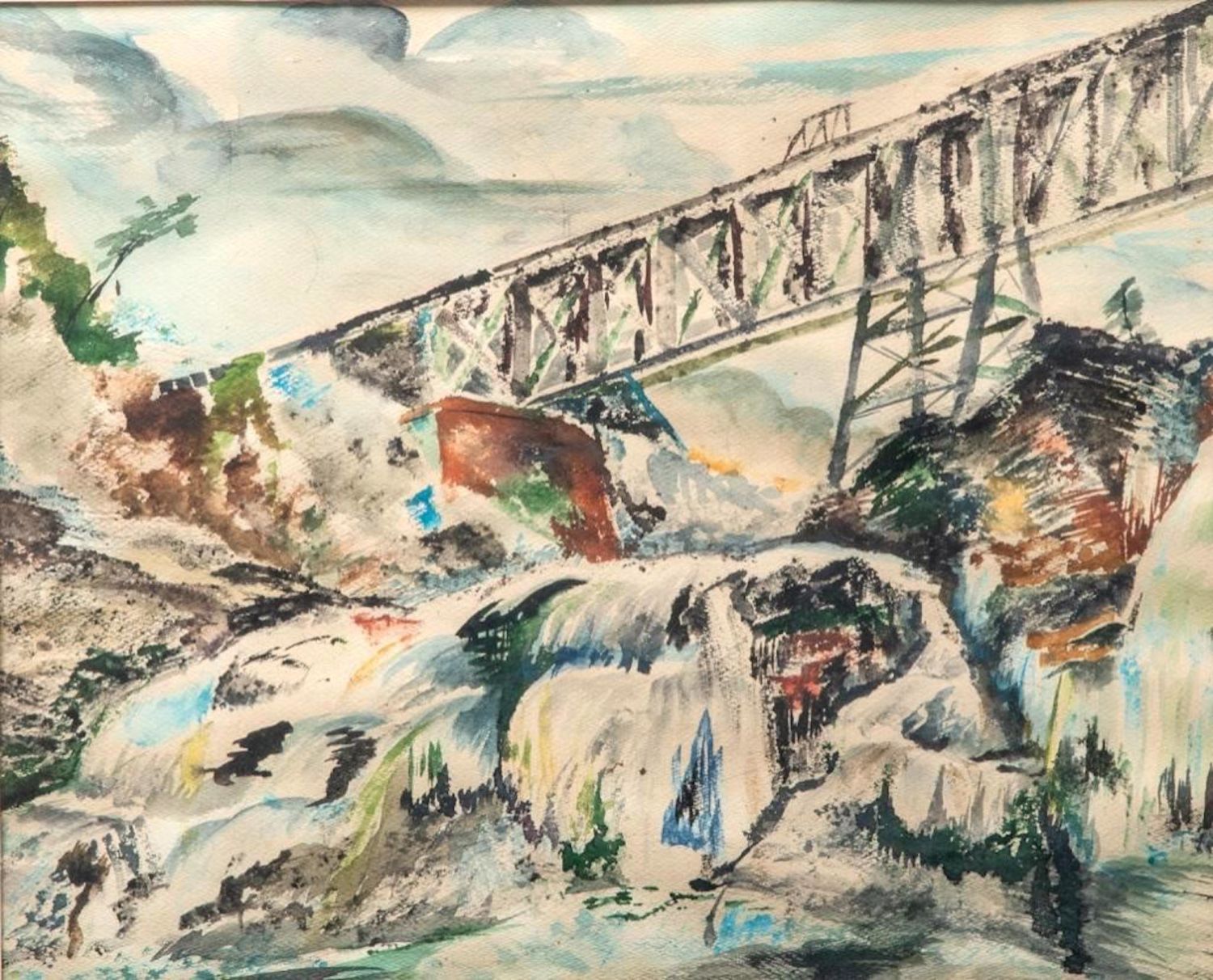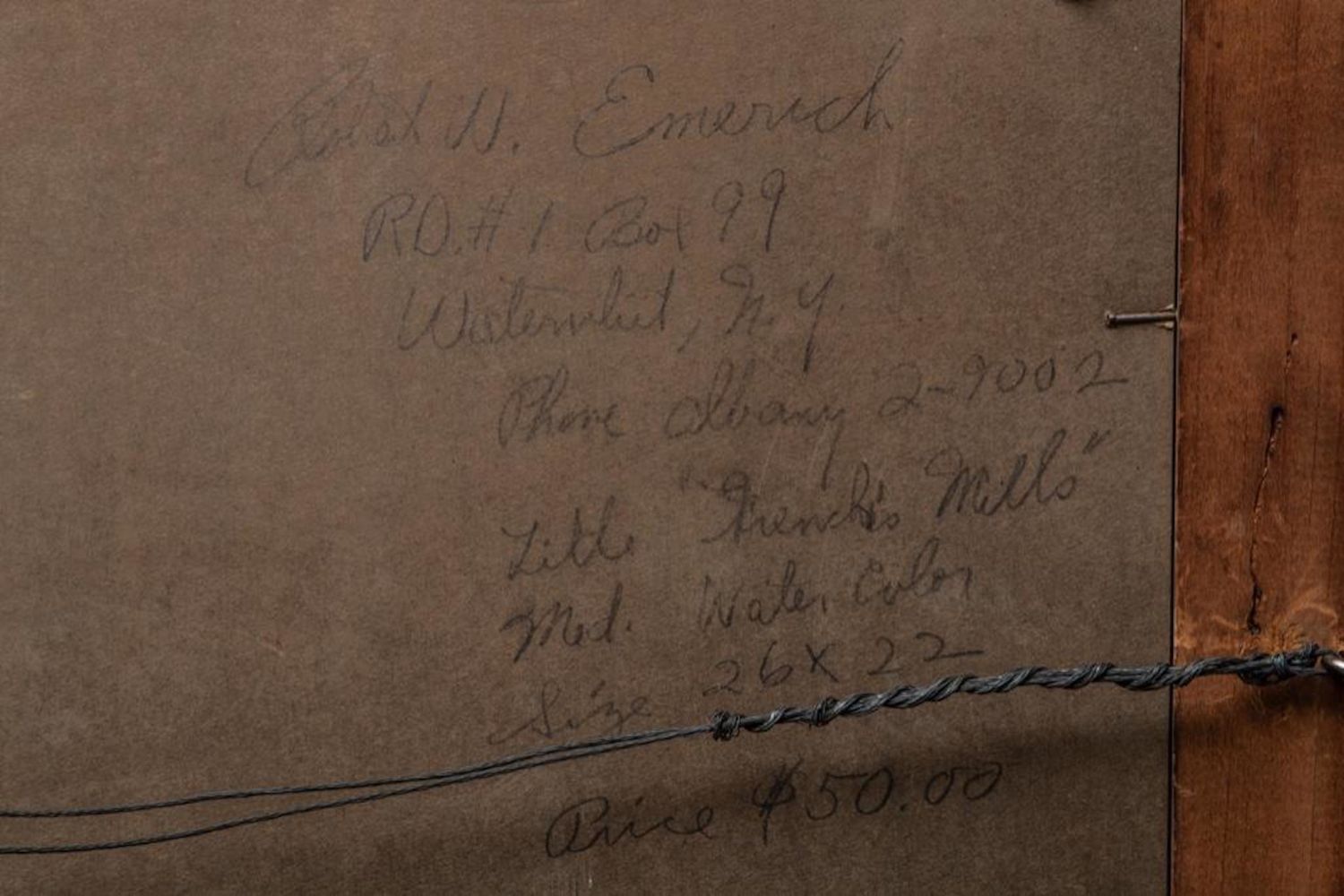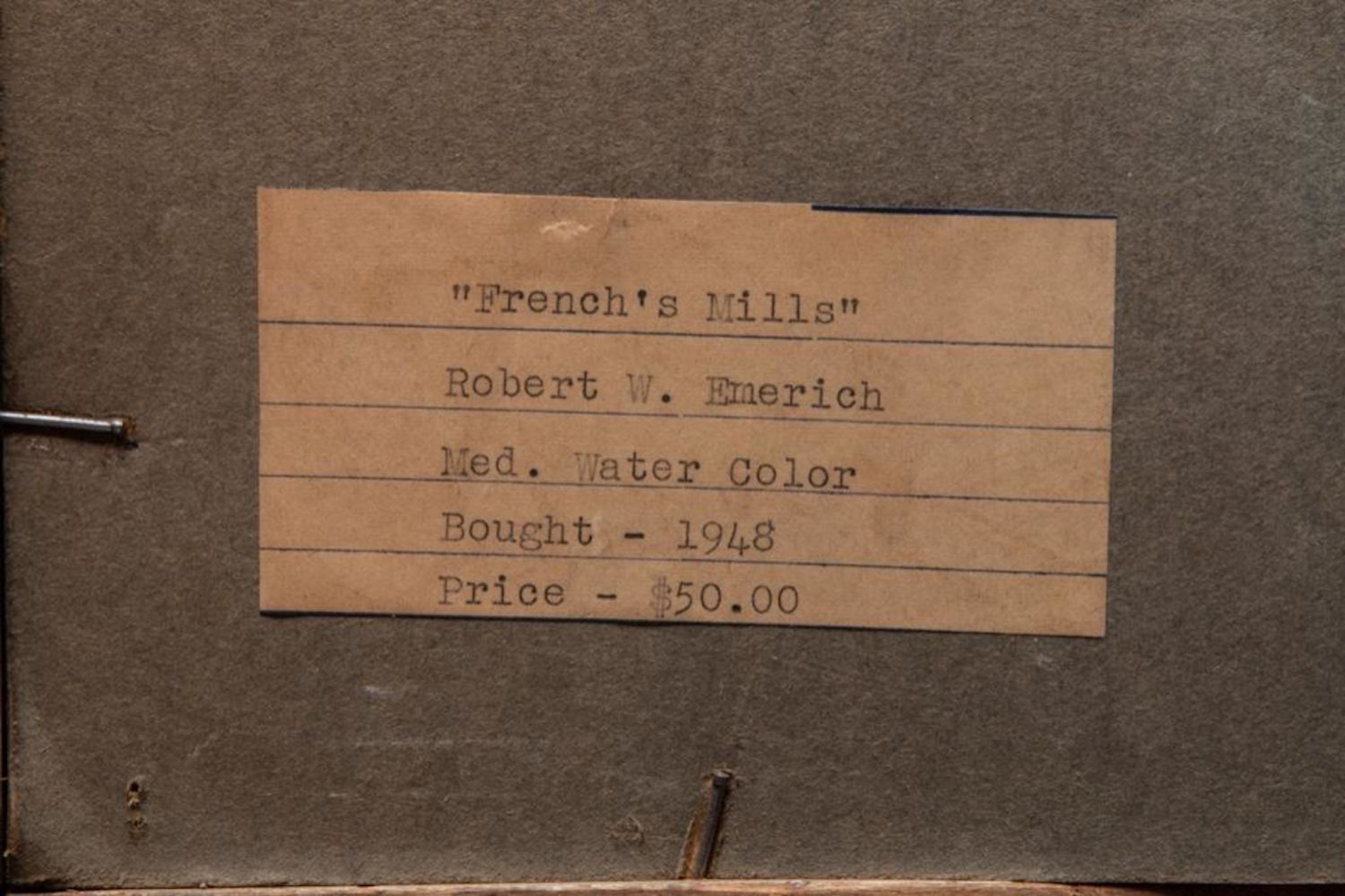 Robert Emerich signed Watercolor . Measures 26"W x 22"H aprox. Has tag on verso. Titled French’s Mills. (This site is located in Guilderland Center, New York) Robert W. Emerich/ Med. Watercolor/ Purchased in 1948 for $50 when $50 was real money. in good condition overall