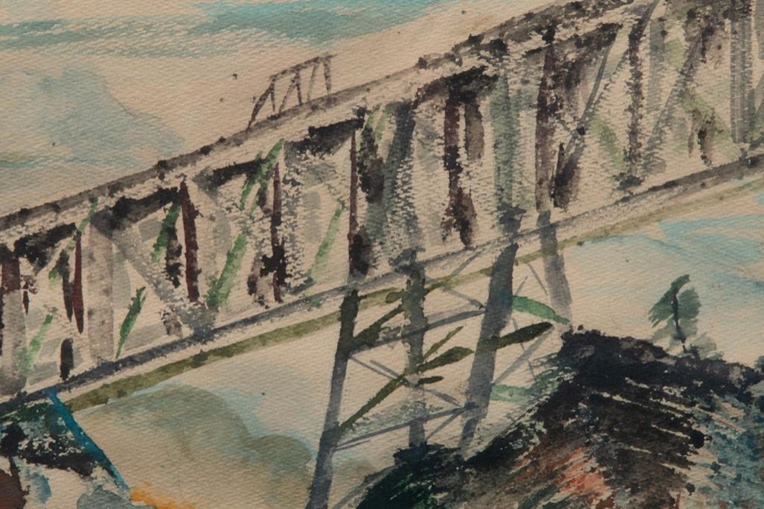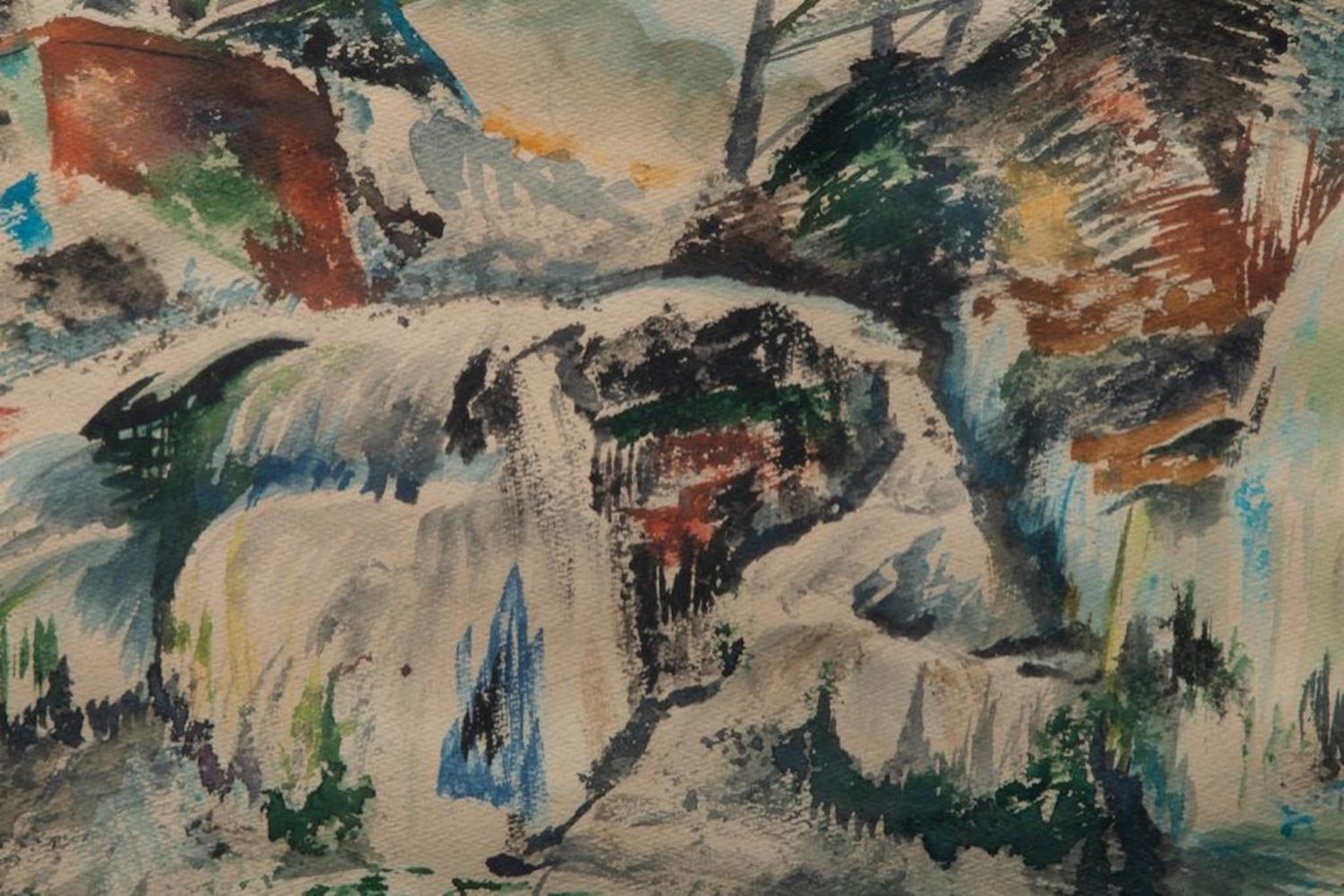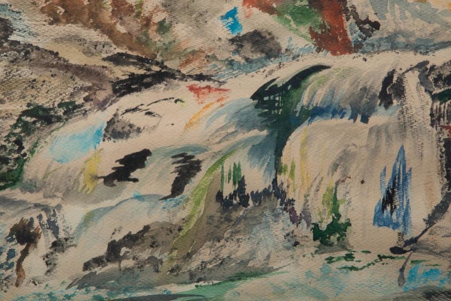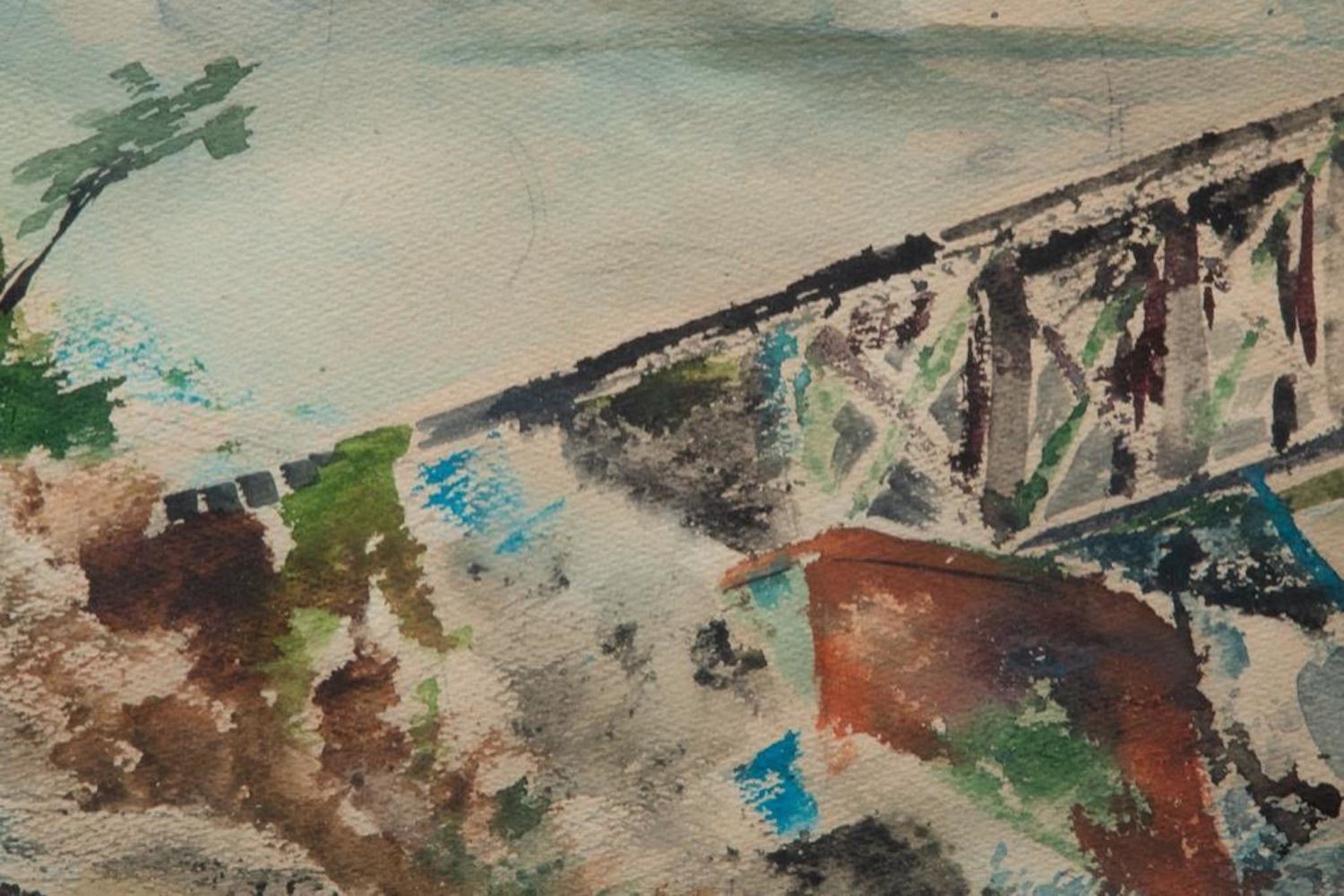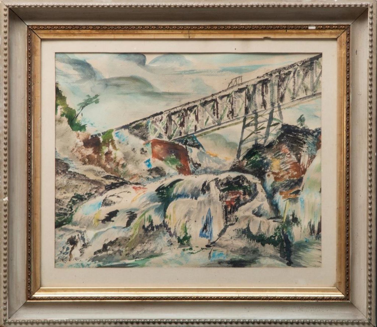 Robert Emerich signed Watercolor . Measures 26"W x 22"H aprox. Has tag on verso. Titled French’s Mills. (This site is located in Guilderland Center, New York) Robert W. Emerich/ Med. Watercolor/ Purchased in 1948 for $50 when $50 was real money. in good condition overall