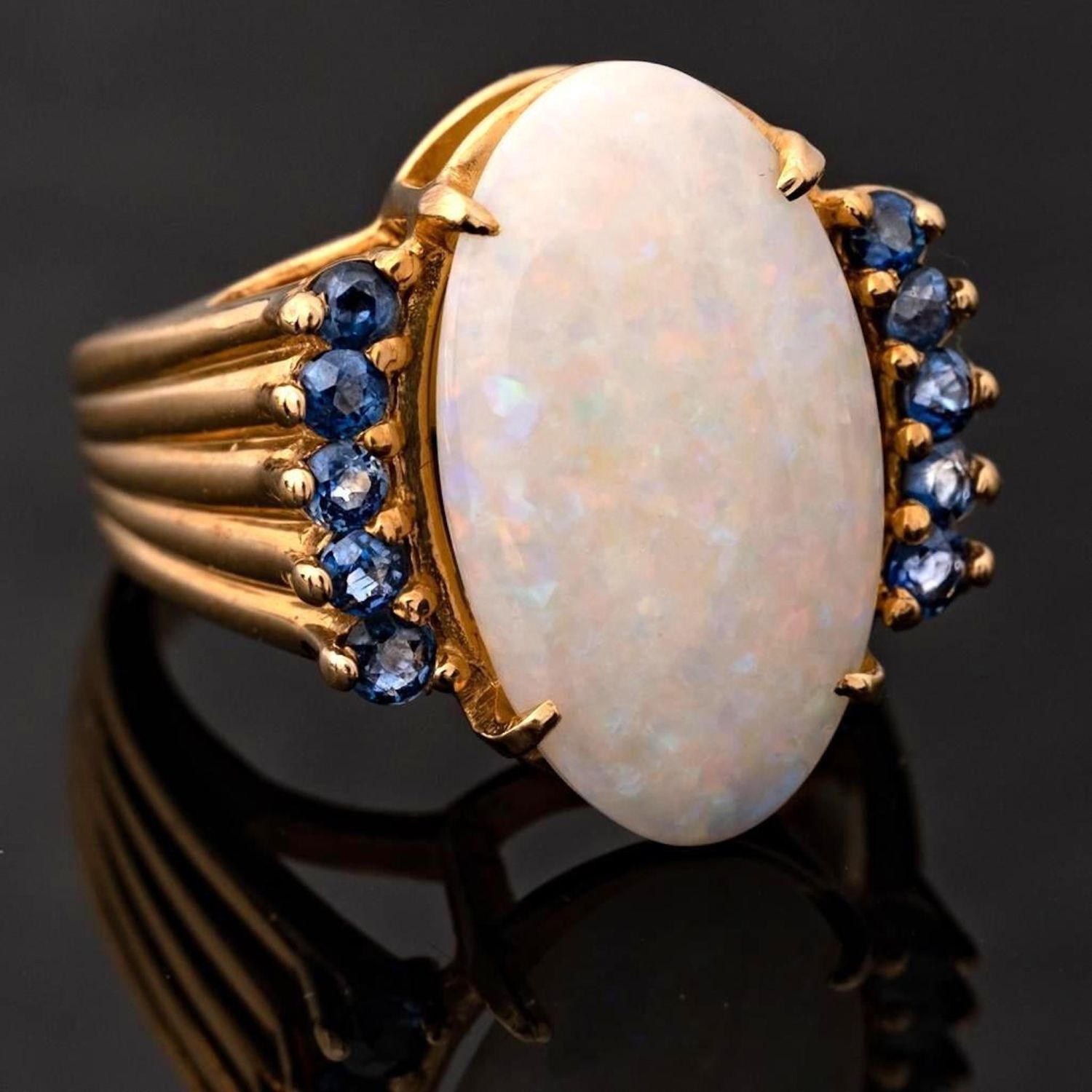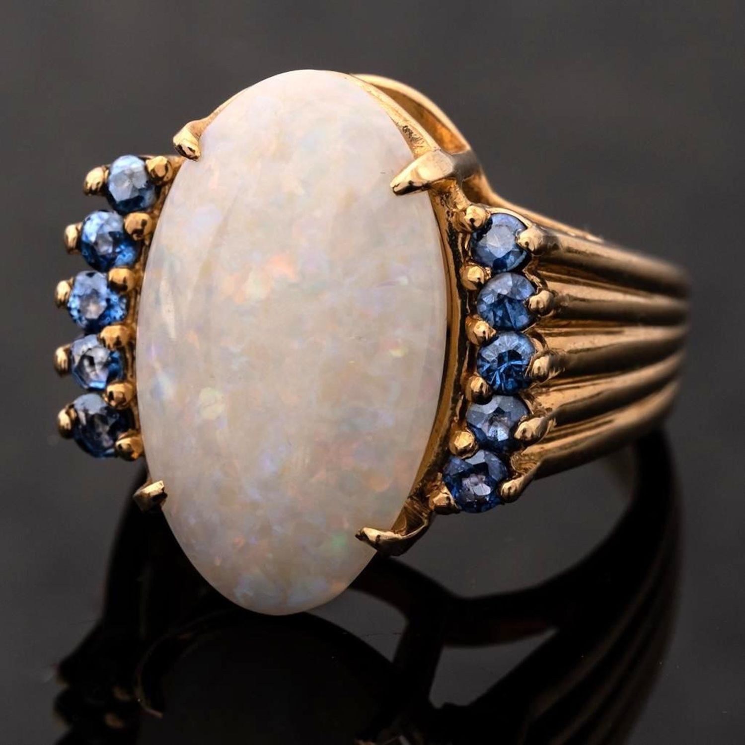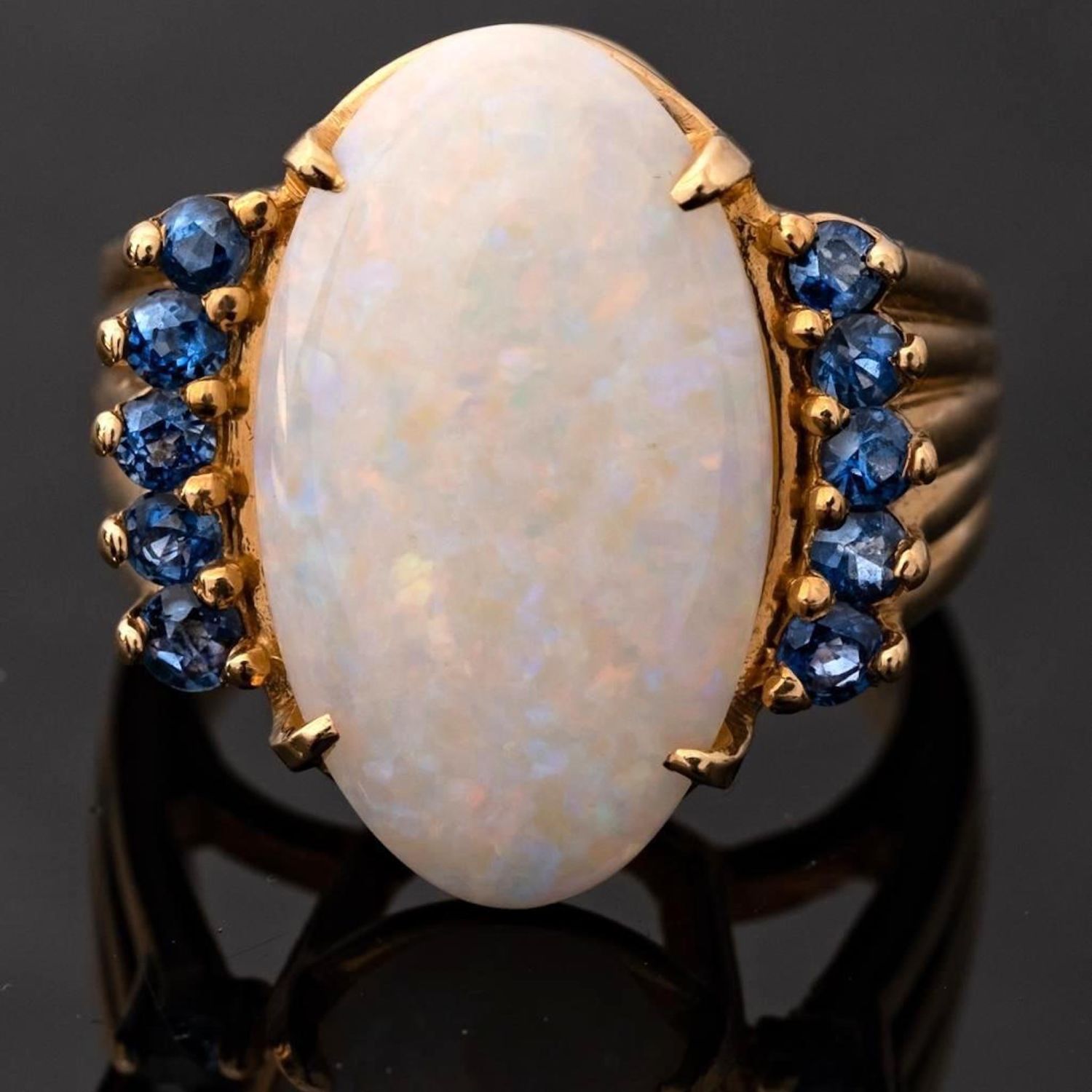 14KT Gold, Opal, and Sapphire vintage Ring centering on a prong set oval cabochon opal (19.20 x 11.32 x 4.14mm) and prong set to each side with round cut sapphire accents, on fluted and tapered band, stamped NOW 14KP. 3/4 x 5/8 in.; Ring size 6, 6.6 dwt. in good condition overall