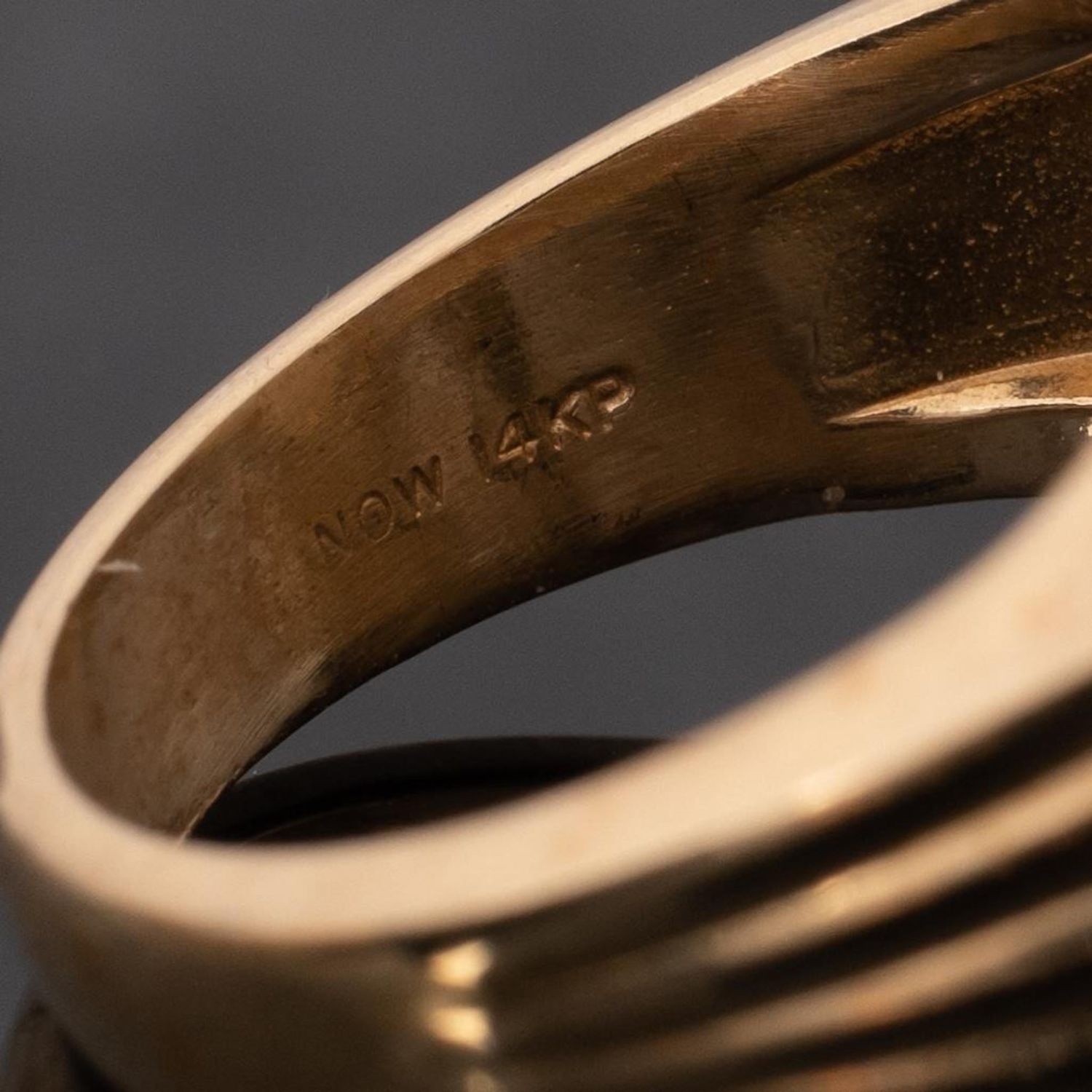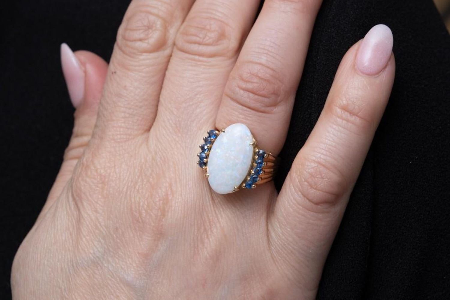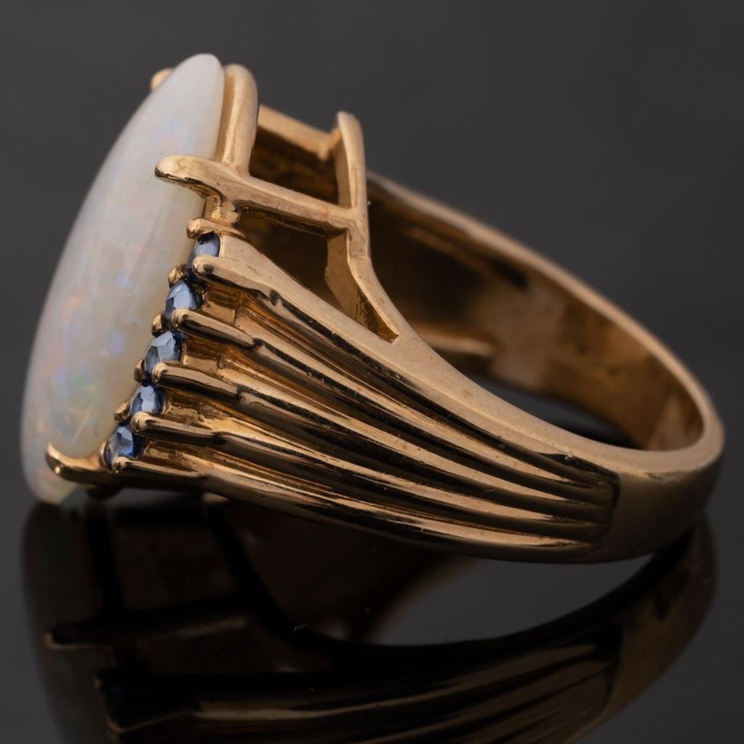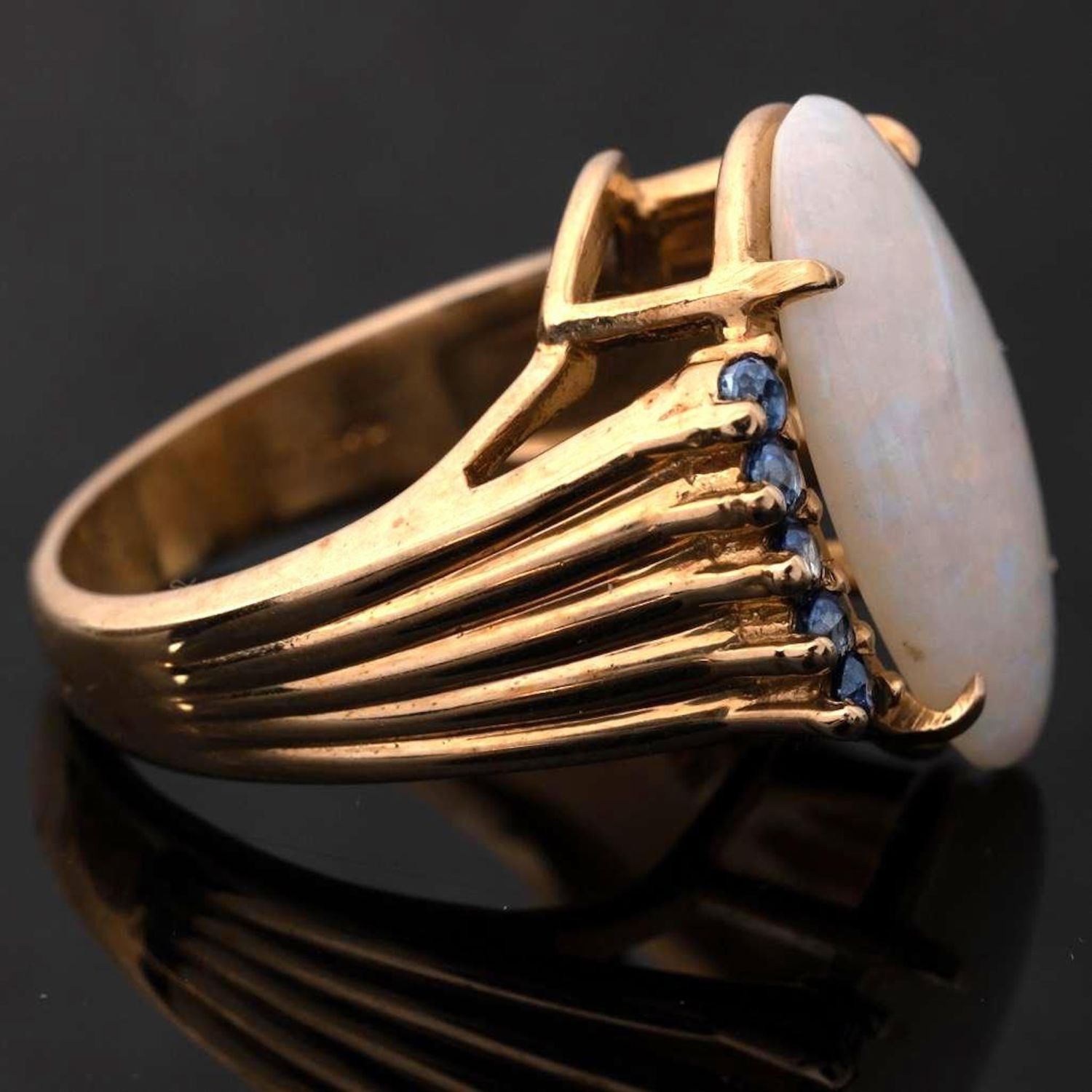 14KT Gold, Opal, and Sapphire vintage Ring centering on a prong set oval cabochon opal (19.20 x 11.32 x 4.14mm) and prong set to each side with round cut sapphire accents, on fluted and tapered band, stamped NOW 14KP. 3/4 x 5/8 in.; Ring size 6, 6.6 dwt. in good condition overall