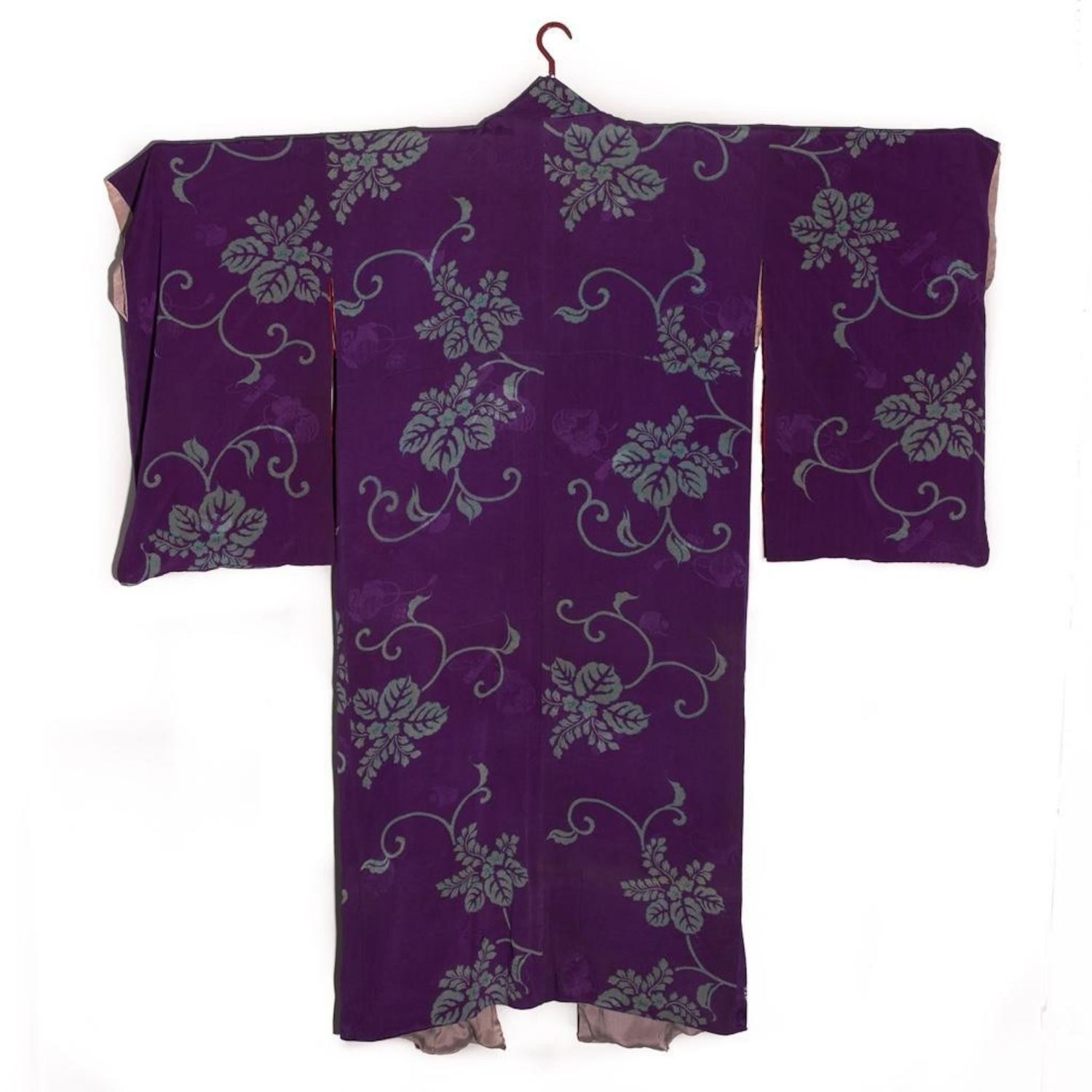 kimono circa 1900 antique handwoven silk damask kimono, hand decorated with a stencil dyed design. This violet purple silk kimono features a repeating aqua blue kiri pattern accented with red and off-white fawn spots. Off-white and lilac silk line the kimono and red silk lines the sleeves. good condition 48" sleeve span, 56" overall length. We are not kimono experts and will be limited with what we can answer. in good condition overall