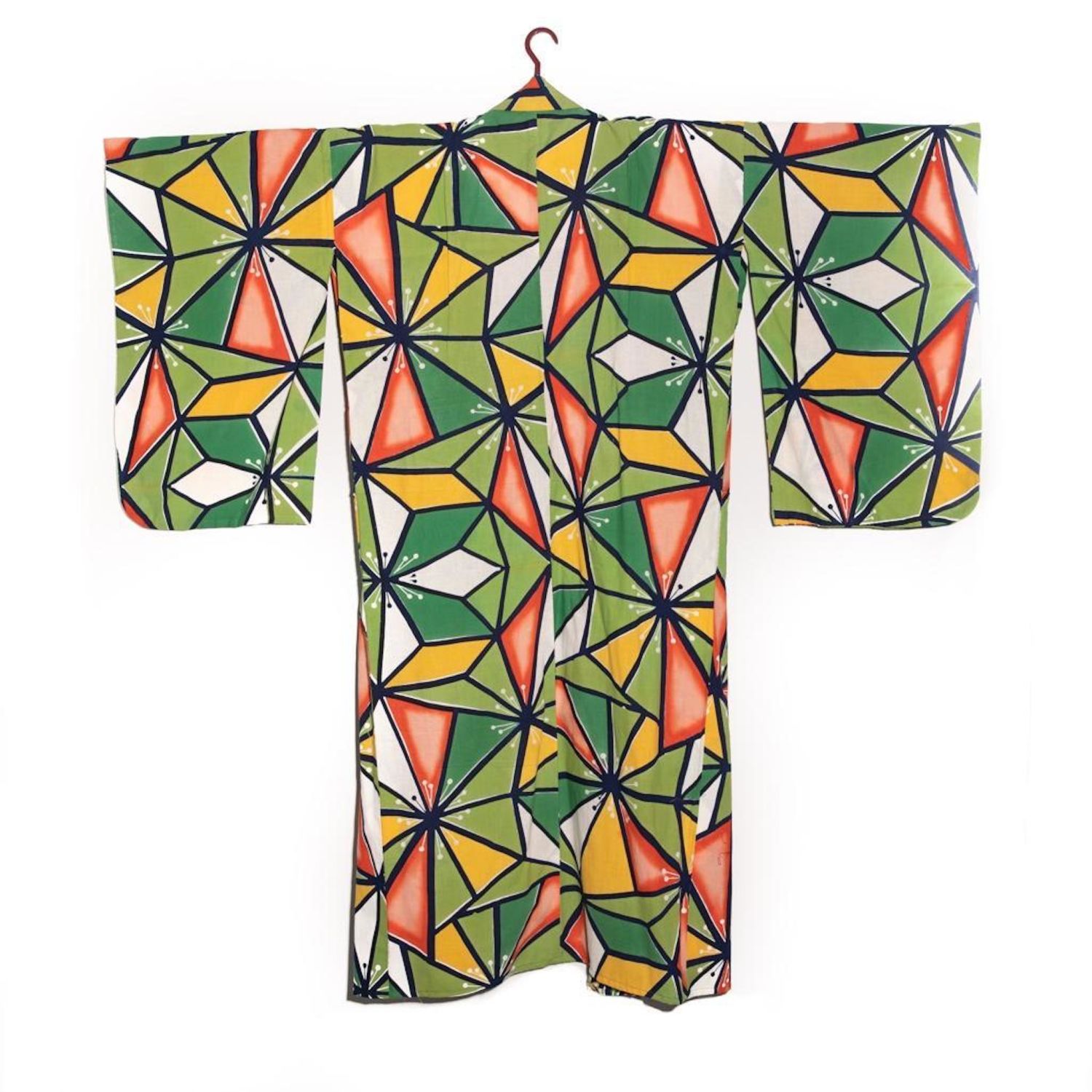 kimono 1930’s vintage handwoven cotton kimono, decorated with a hand stenciled design. This hand dyed kimono features an asanoha pattern in white, red, yellow, green and black. The shoulders and sleeves are lined in white cotton…good overall condition. 51" sleeve span.., 59" overall length. We are not kimono experts and will be limited with what we can answer. in good condition overall