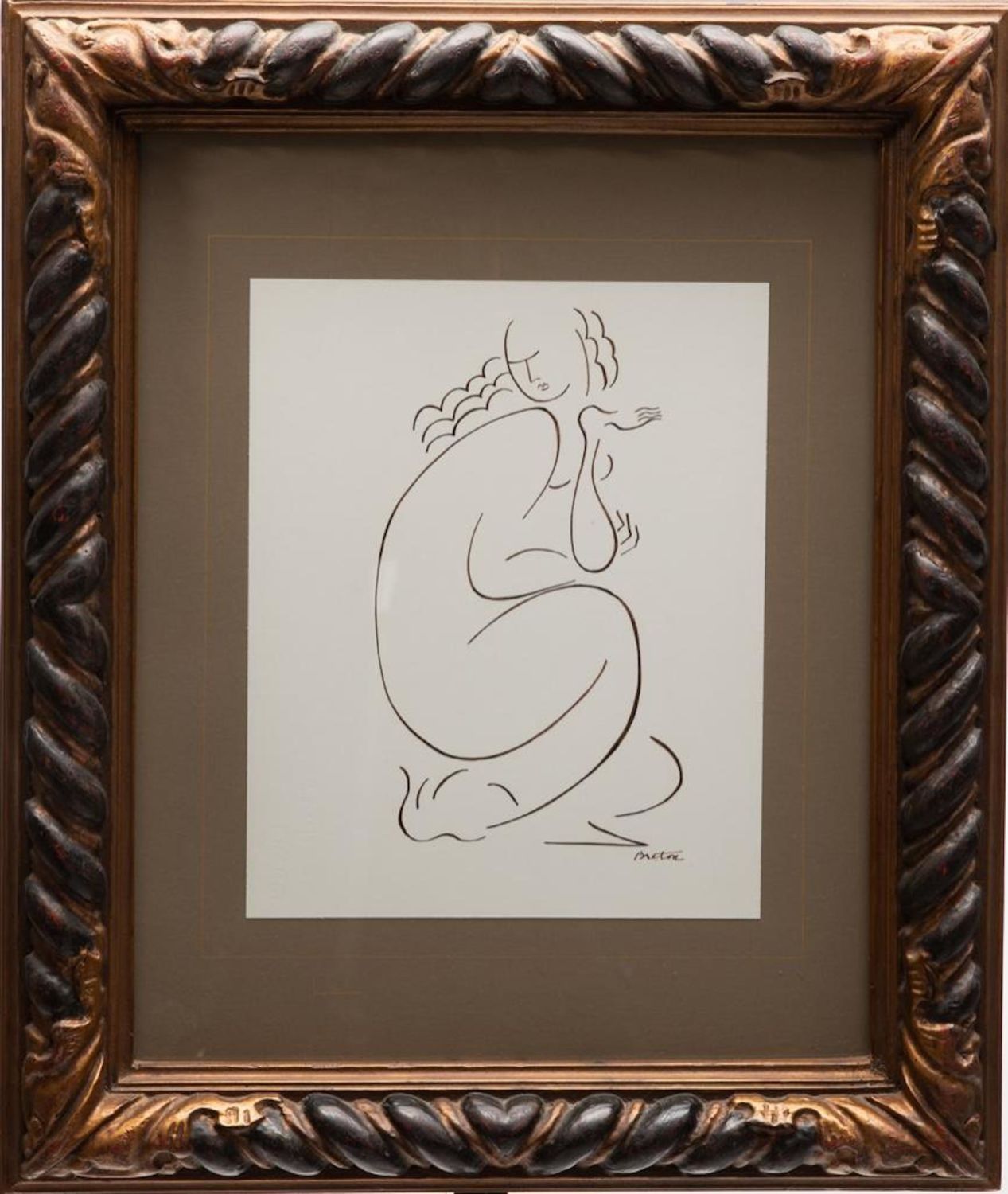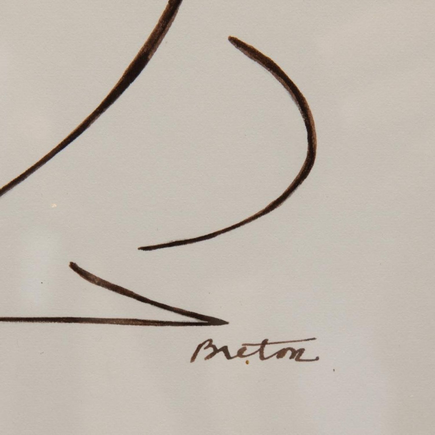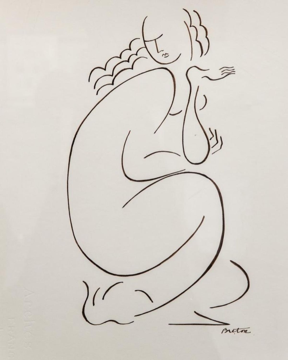 Andre Breton Untitled (crouching woman), vintage Pen and ink drawing on paper. Signed to the lower right, “Breton” Label to the verso from Soicher-Marin Fine Art, Culver City, California. 20" x 25" Framed 10 3/4" x 18" Visible in good condition overall