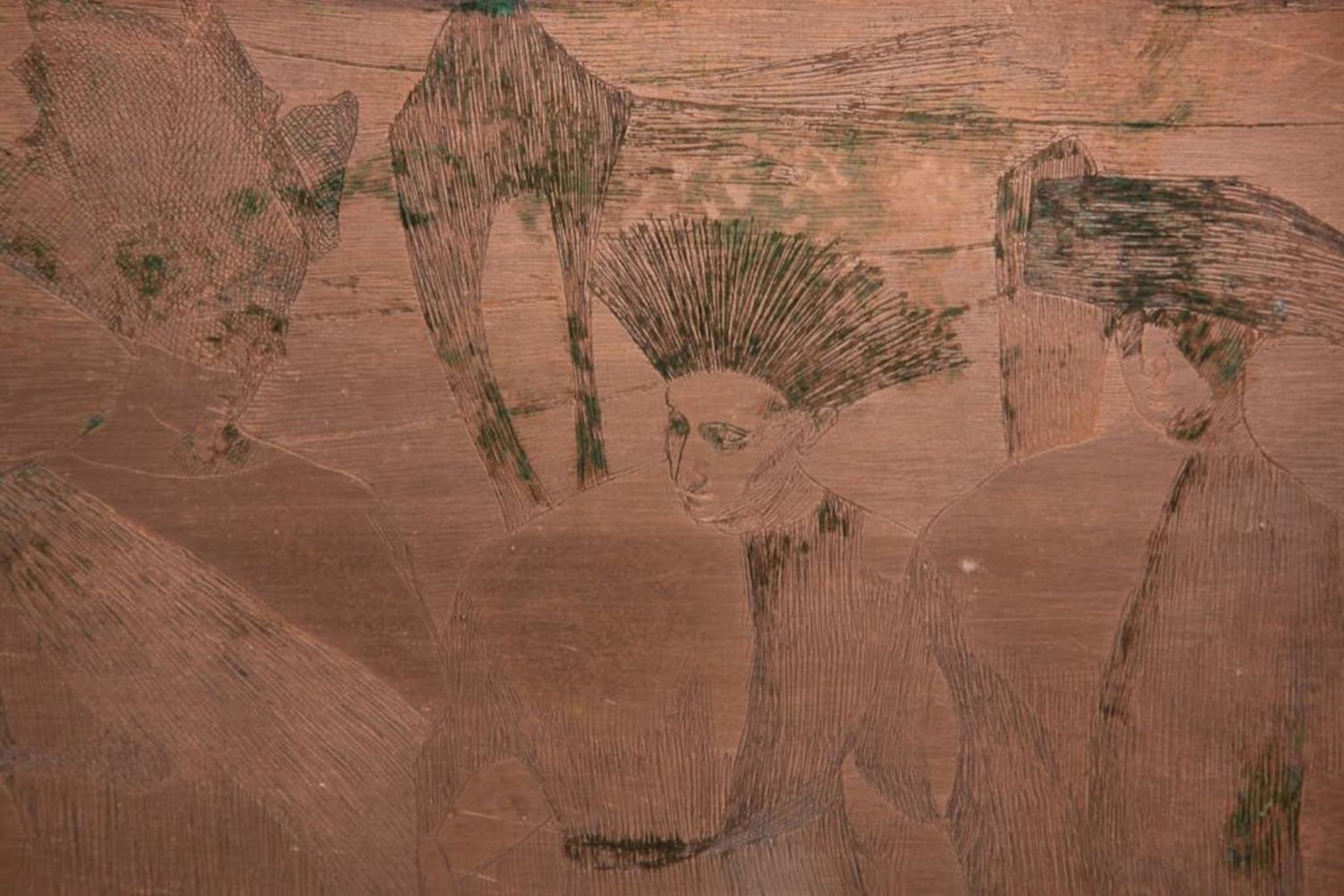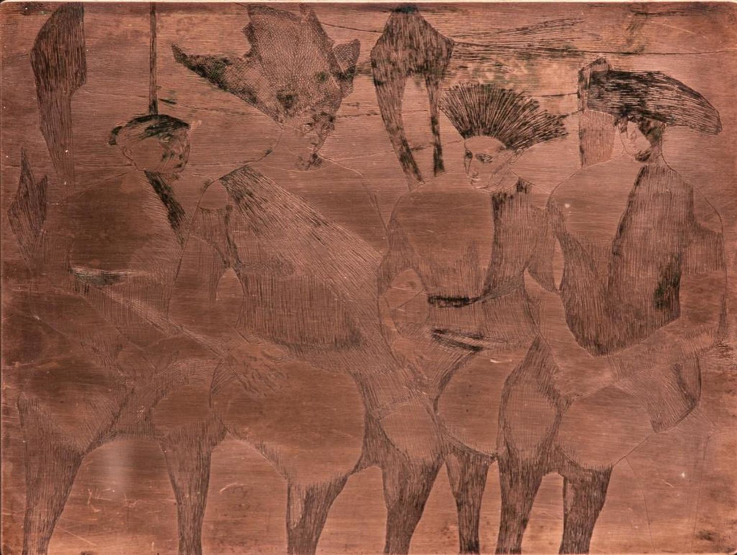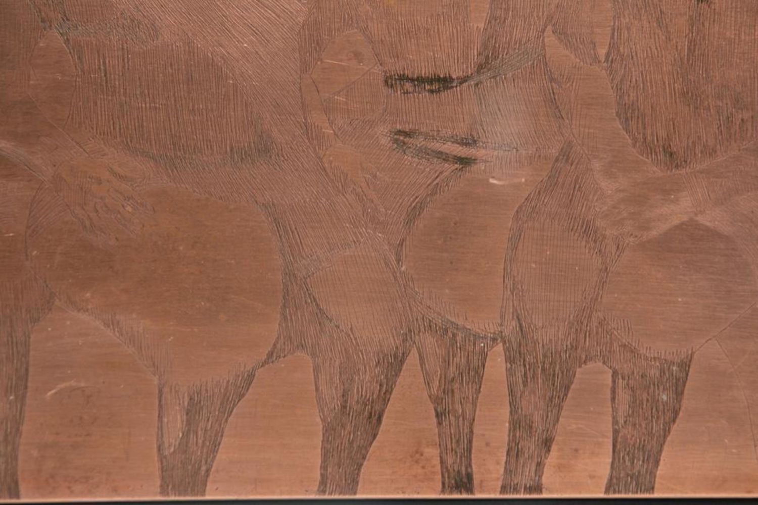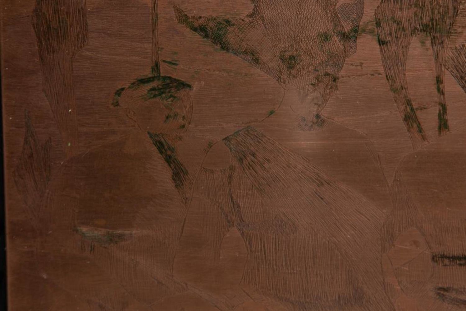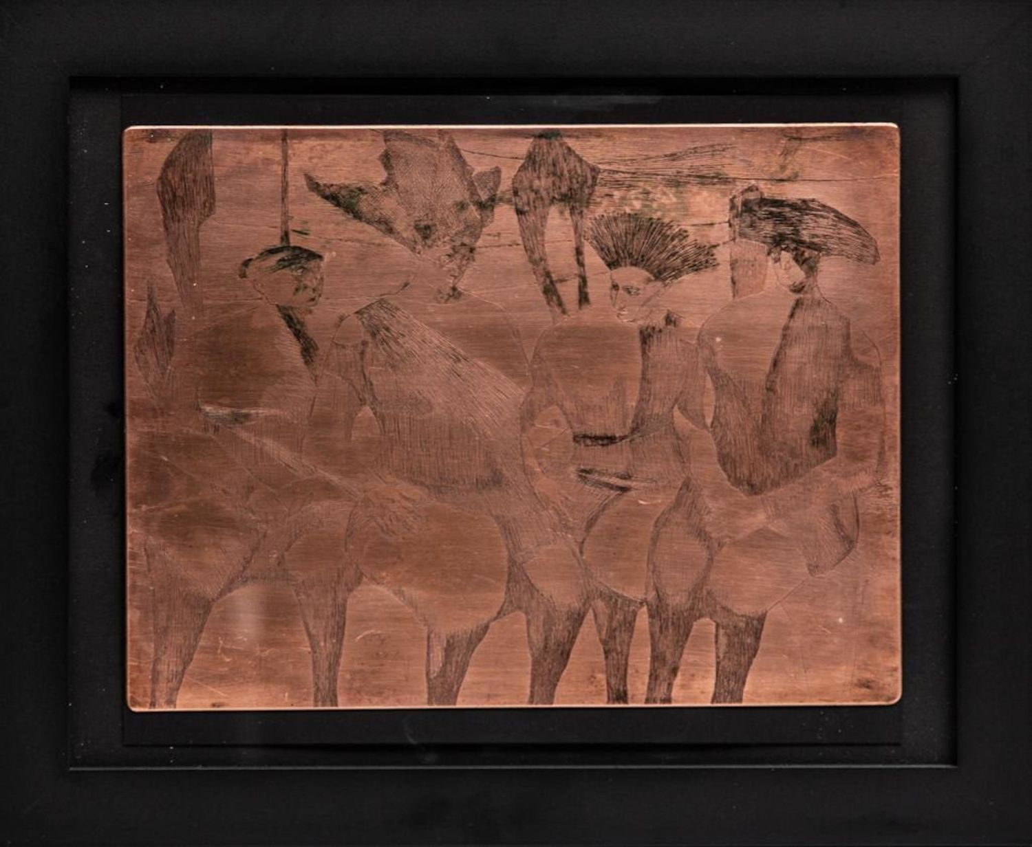 John Fenton The Original Copper Engraving Plate. Painter, printmaker and teacher John Fenton was born in Mountaindale, New York. He moved with his family to Mount Vernon, New York, where he lived for some thirty years before settling permanently in Woodstock, New York. He attended The Art Student’s League of New York and Atelier 17, Paris. His work was the focus of a number of one-man shows during the 1950s and 1960s, and was exhibited in numerous museums and galleries including the Art Institute of Chicago, The Museum of Modern Art in New York, The Corcoran Gallery in Washington, D.C. And the Pennsylvania Academy.Fenton taught at New York University and Goddard College. His distinctly surrealist work won awards from the American Academy of Arts and Letters, the National Academy of Design, and numerous other institutions, and is included in the collections of the Smithsonian American Art Museum, the Corcoran Gallery among others. He died at Woodstock, New York. in good condition overall