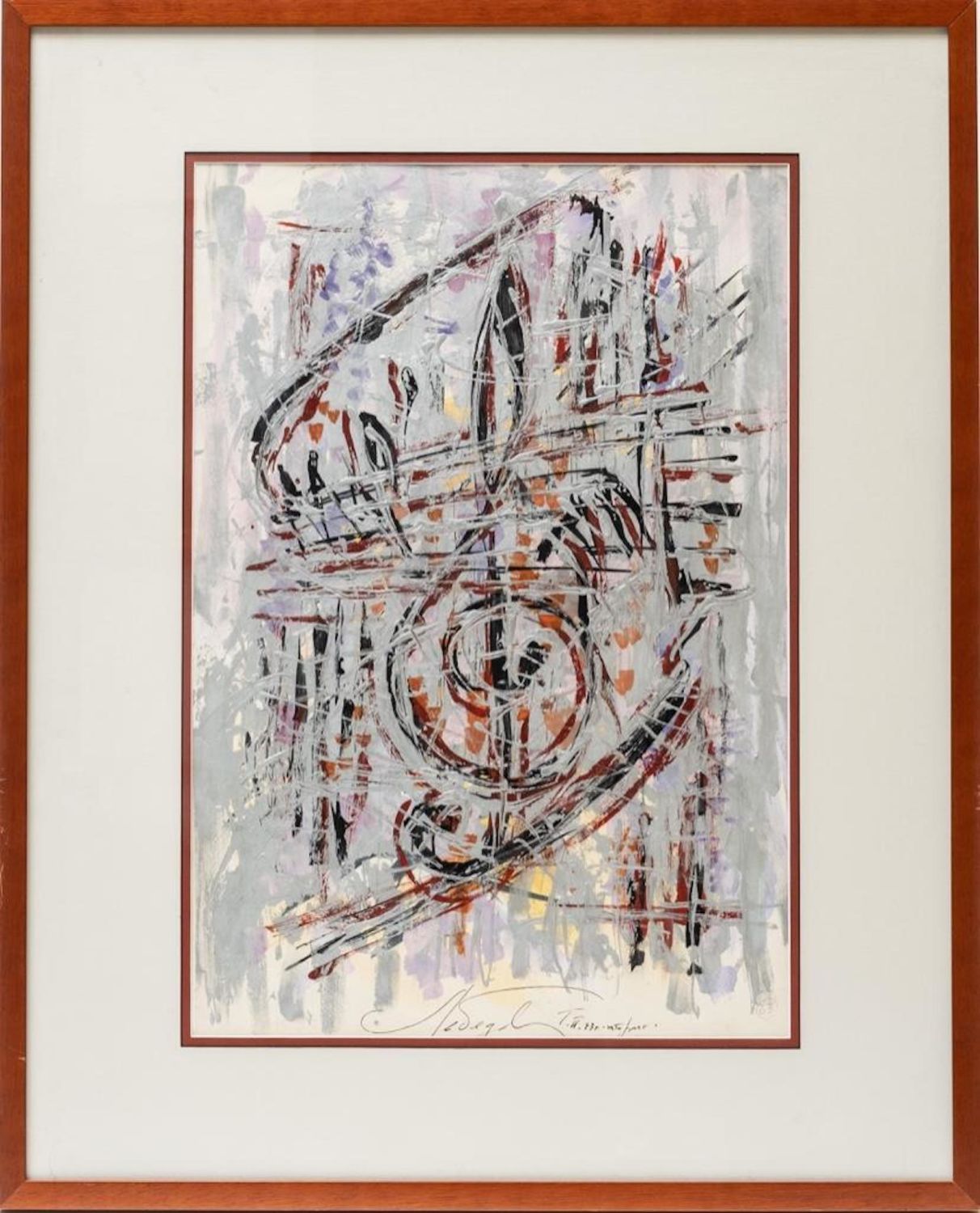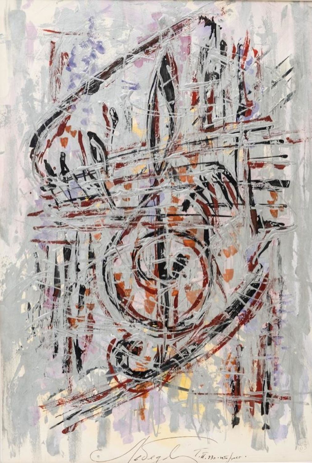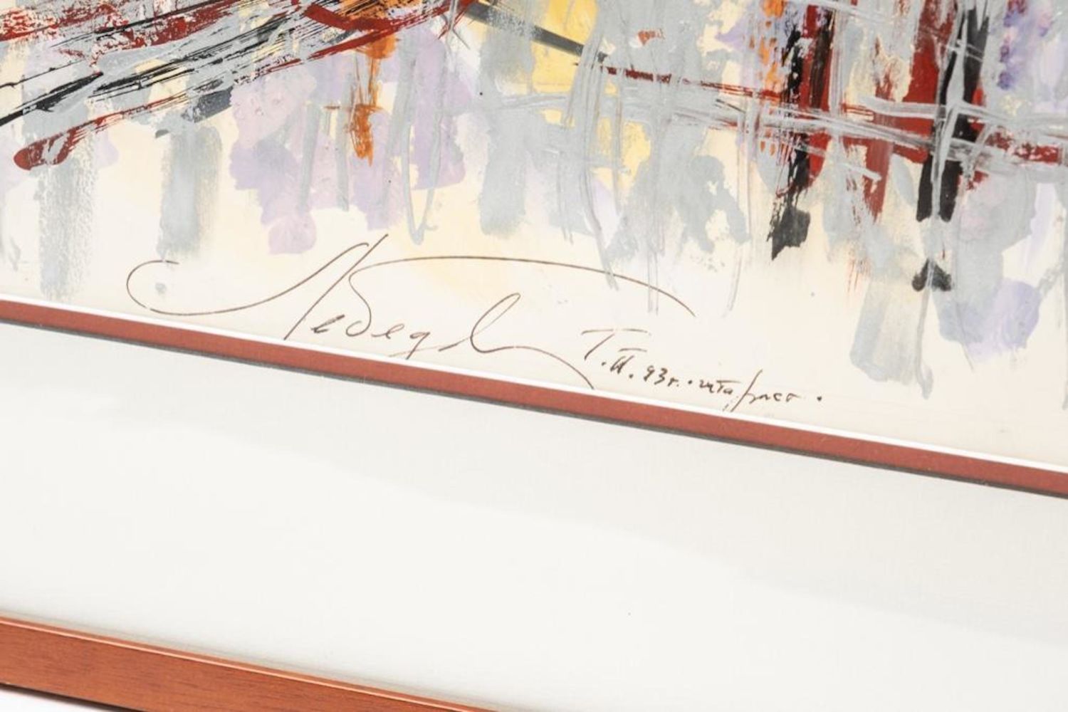 Vladimir Lebedev Russian Avant Garde Oil on paper signed . Titled in Russian. Measures 31.8"H x 25.18"W Vladimir Lebedev (1910-1989) Russian born painter who emigrated to the United Sates in the early 20th century and resided in the North East US, including Rhode Island where he painted views of Watch Hill, Block Island, and other picturesque locations. Exhibited 3 times in the Museum of Modern Art in NY. in good condition overall
