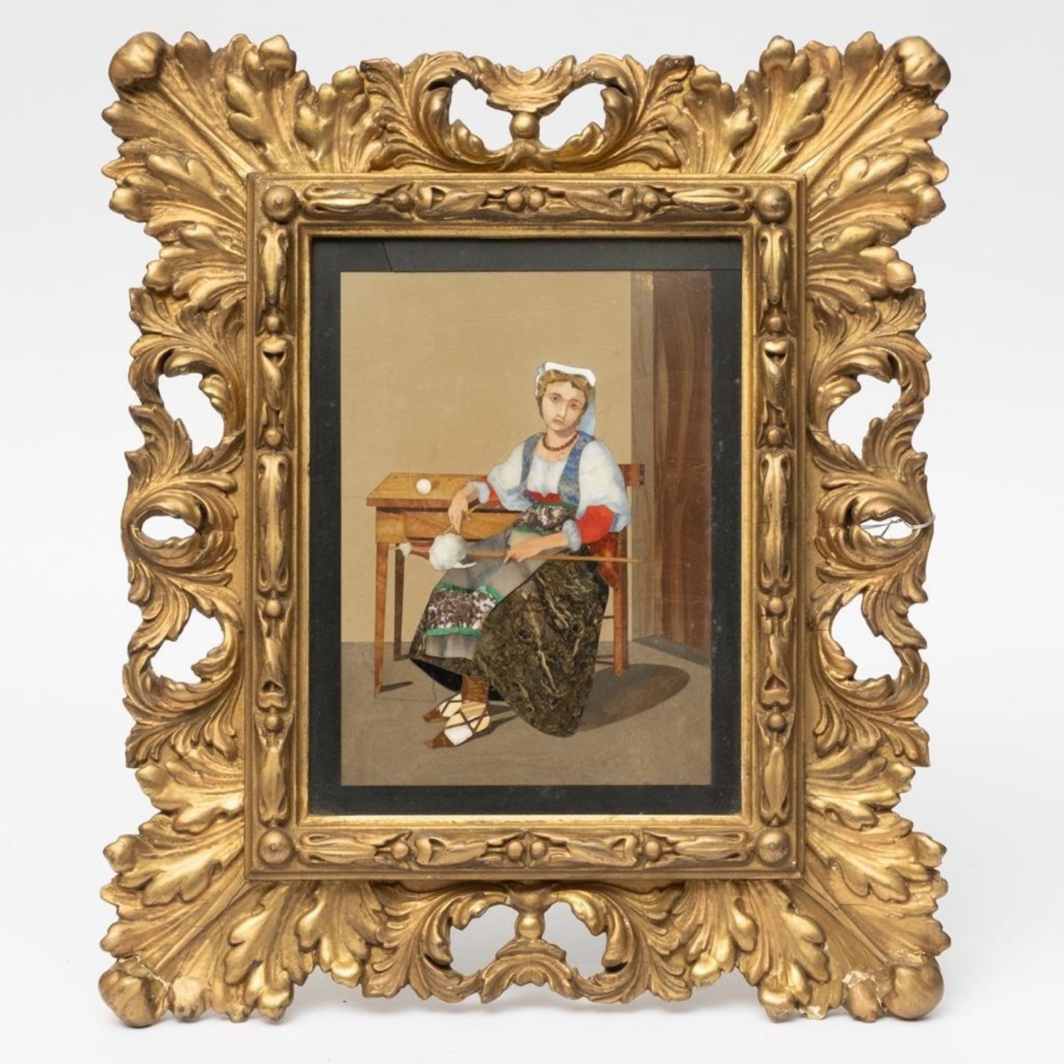 Italian Pietra Dura Plaque mid to late 19th century. Various colored stones inset to render a female practicing textile arts; well carved period oval frame. Sight: 6.5" height, 4.75" width; frame: 12.5" height. 10.75" width.
