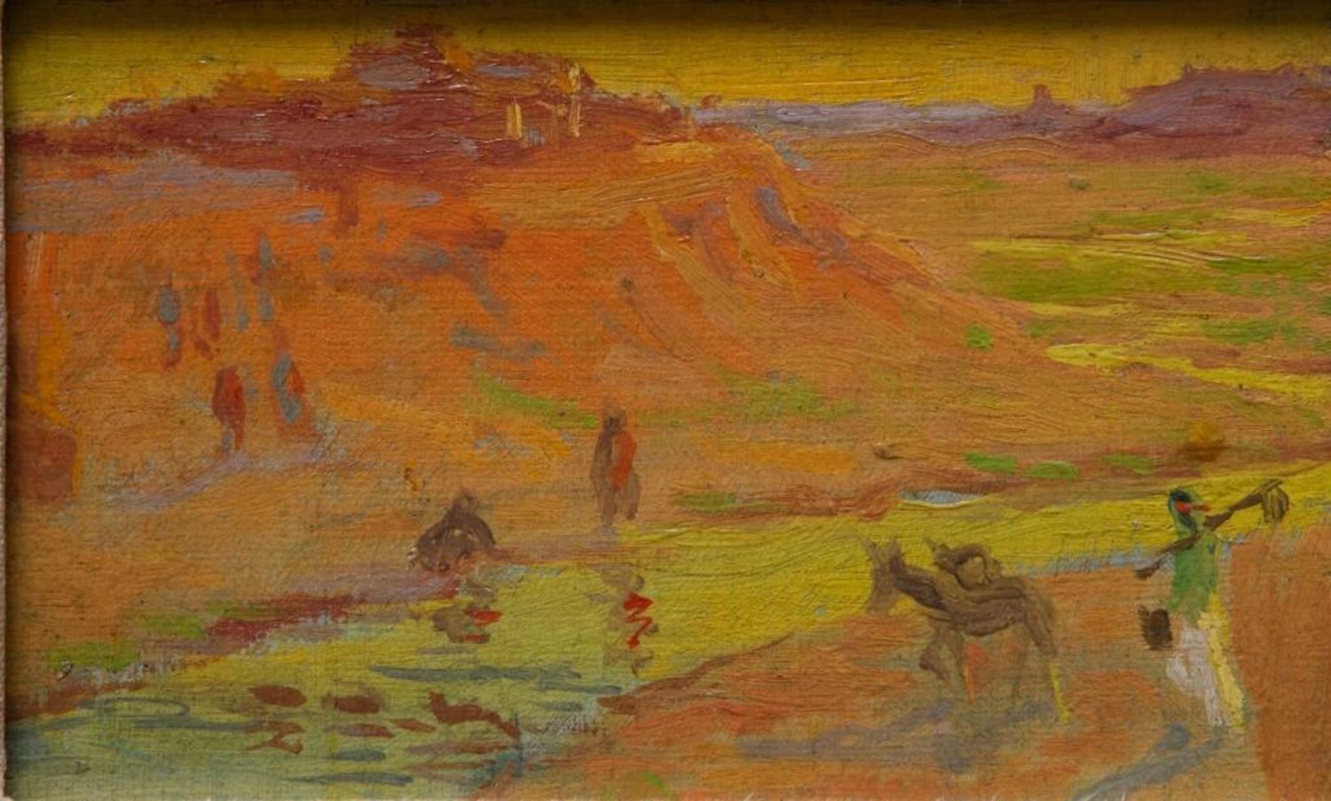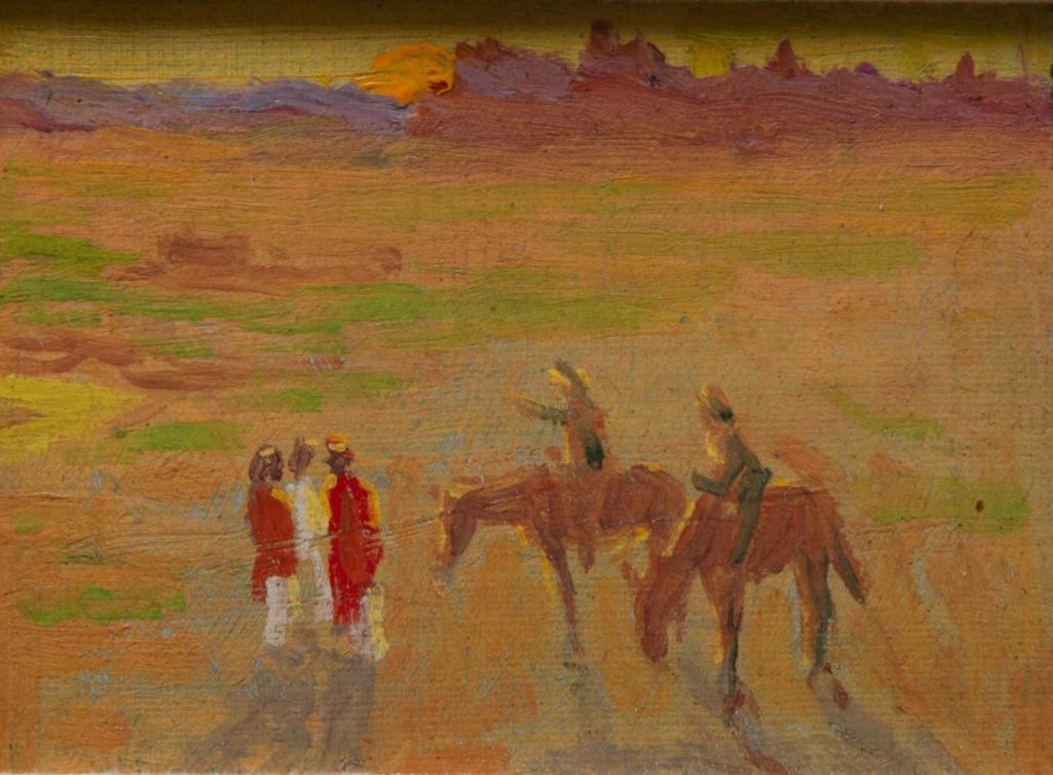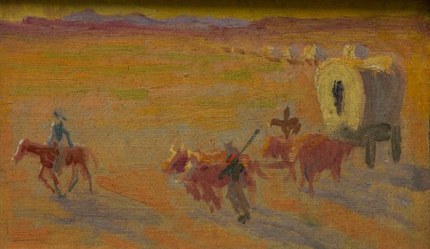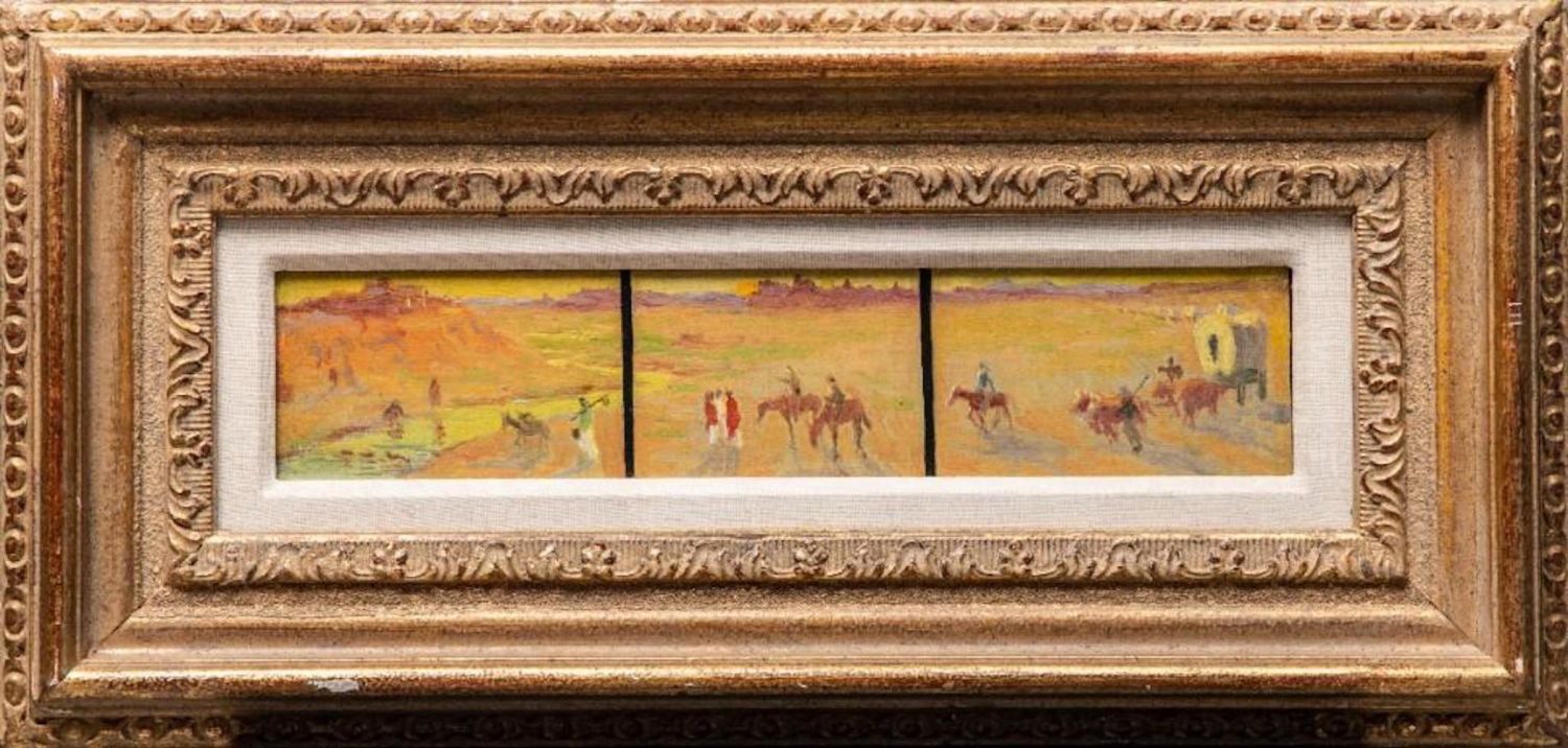 Early 1900’s triptych oil painting depicting a western scene. Measures 11 5/8"H x 24.5"W approx Framed. 3.25"H x 16"W approx visible art. Nice work in good condition overall