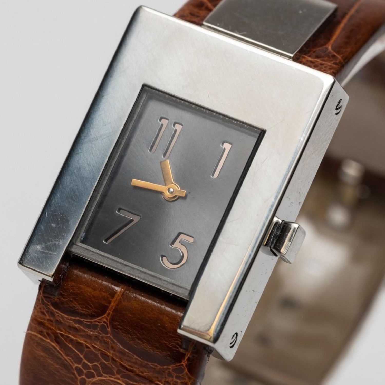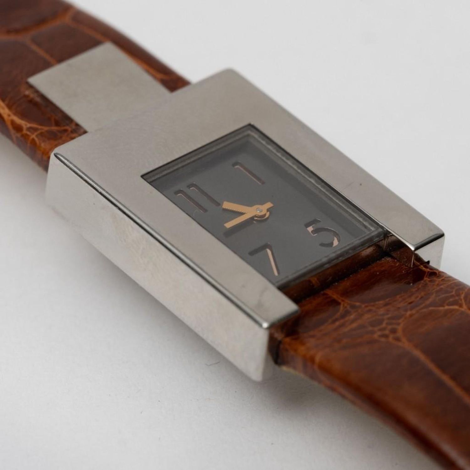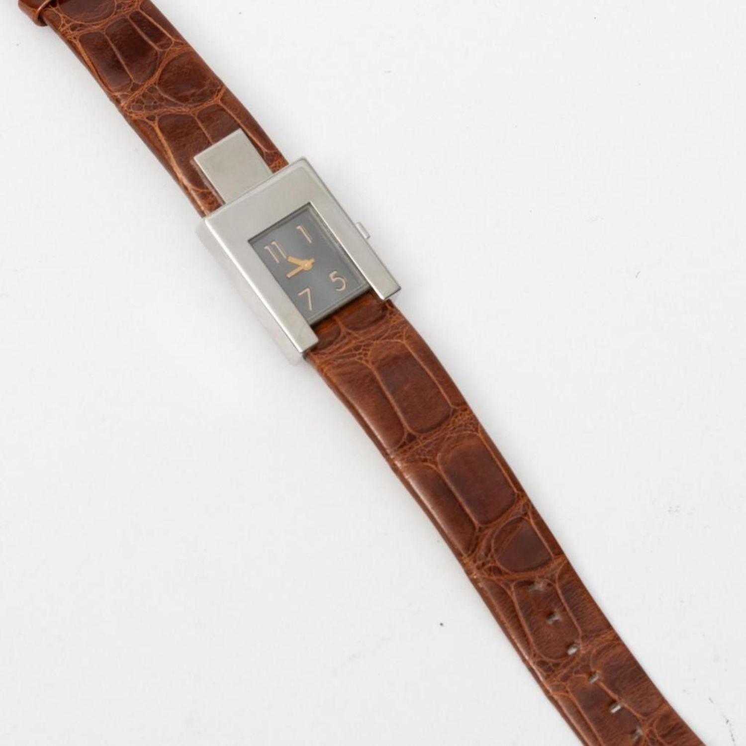 Pomellato signed lady’s watch in stainless steel, with silvered dial and brown leather band. Quartz movement -running. Retail $2550. Case – 22mm x 28mm. Band is 7.5" long. Running well when we looked at it but please note the gallery does not warranty the accuracy/running condition of watches.