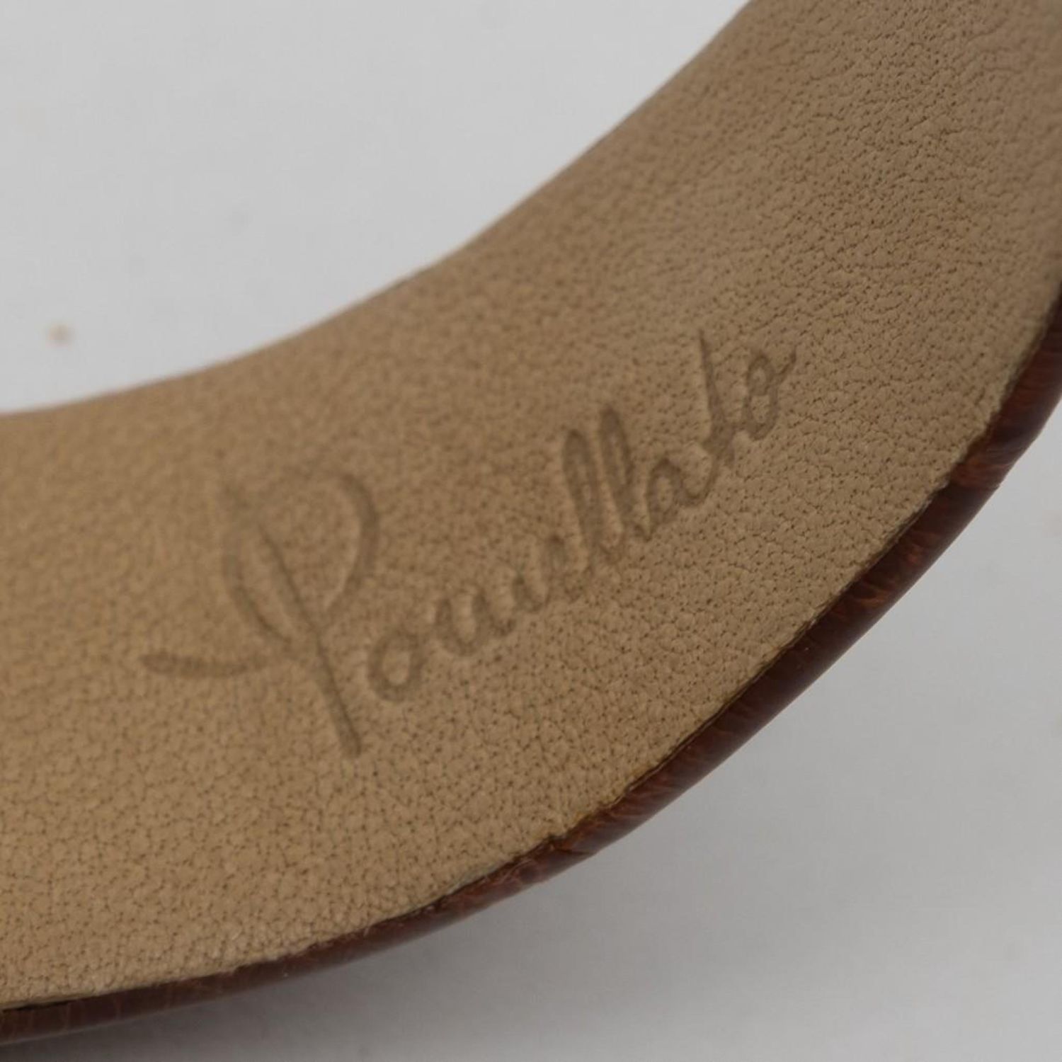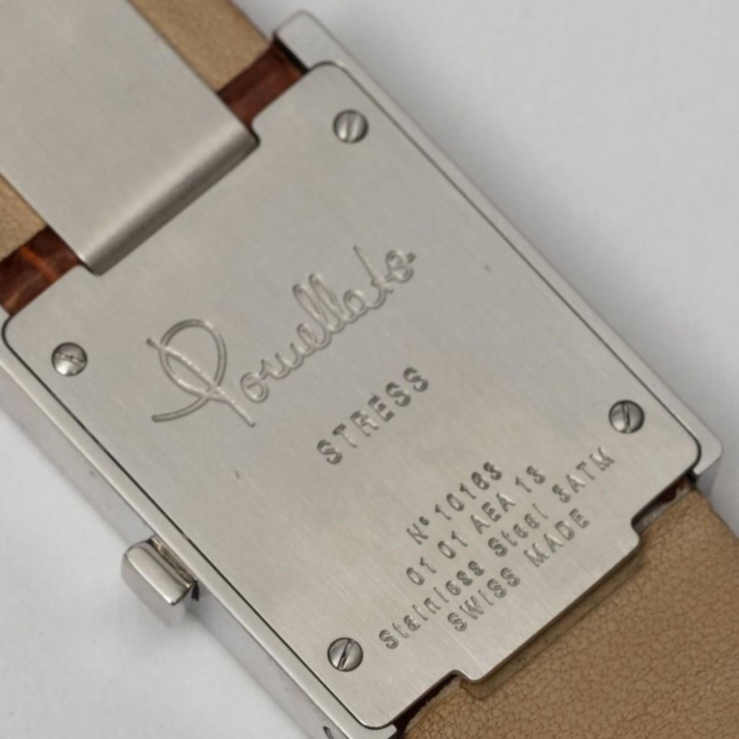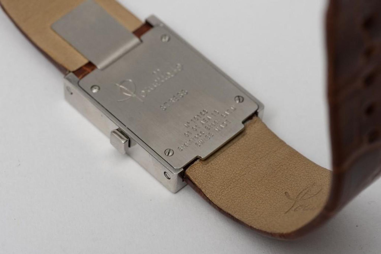 Pomellato signed lady’s watch in stainless steel, with silvered dial and brown leather band. Quartz movement -running. Retail $2550. Case – 22mm x 28mm. Band is 7.5" long. Running well when we looked at it but please note the gallery does not warranty the accuracy/running condition of watches.