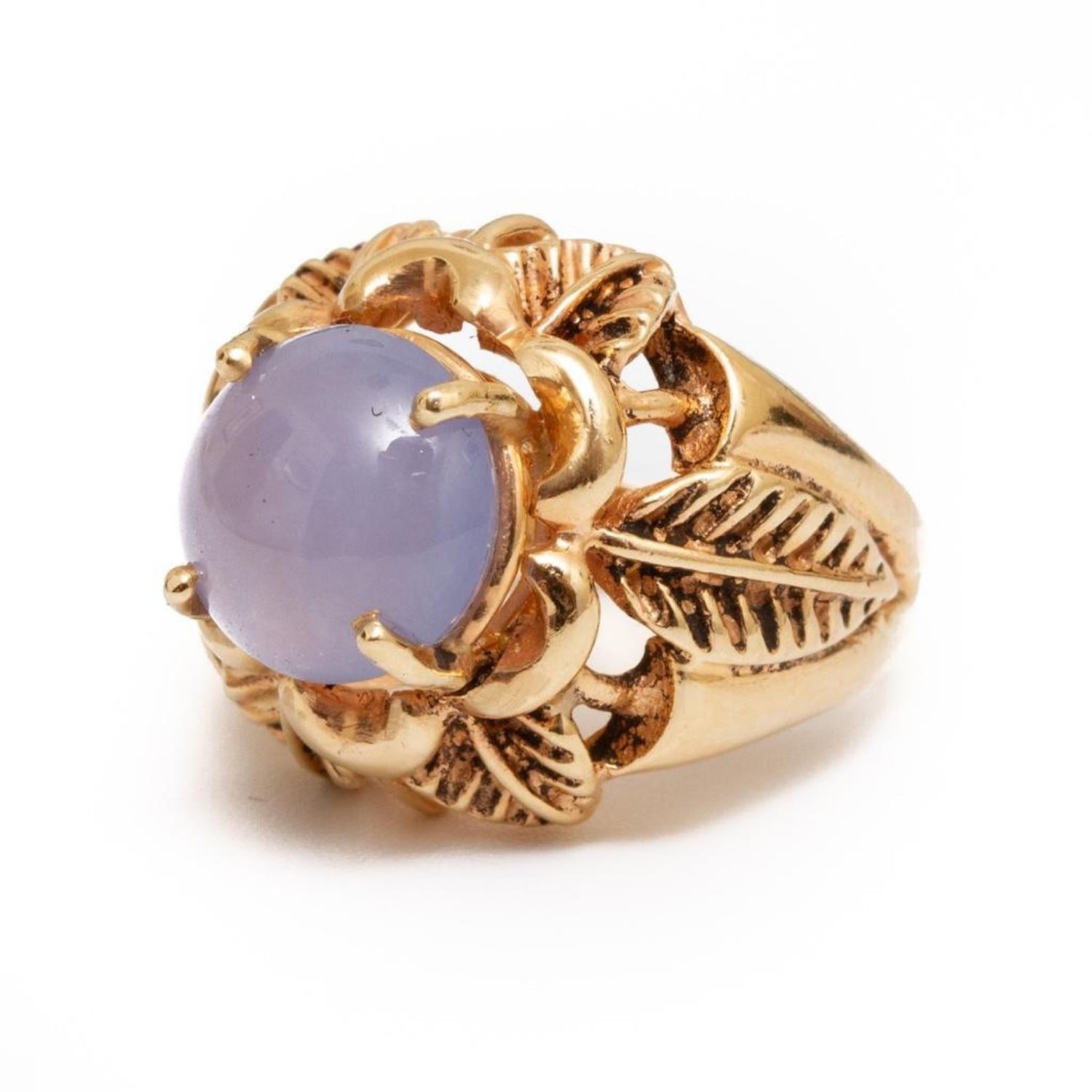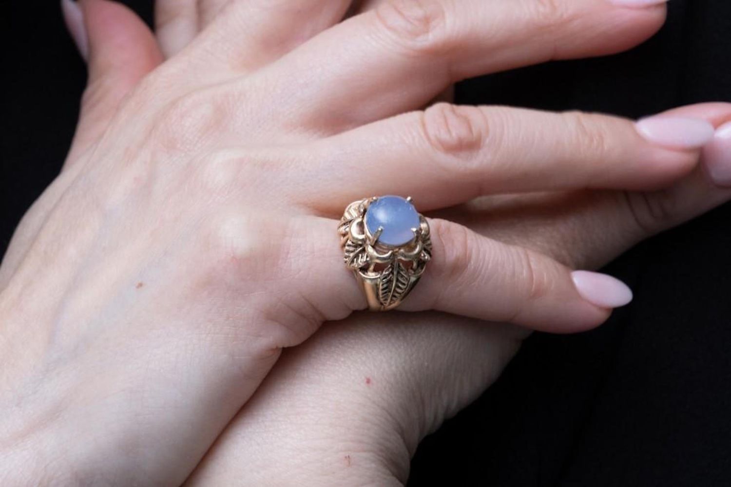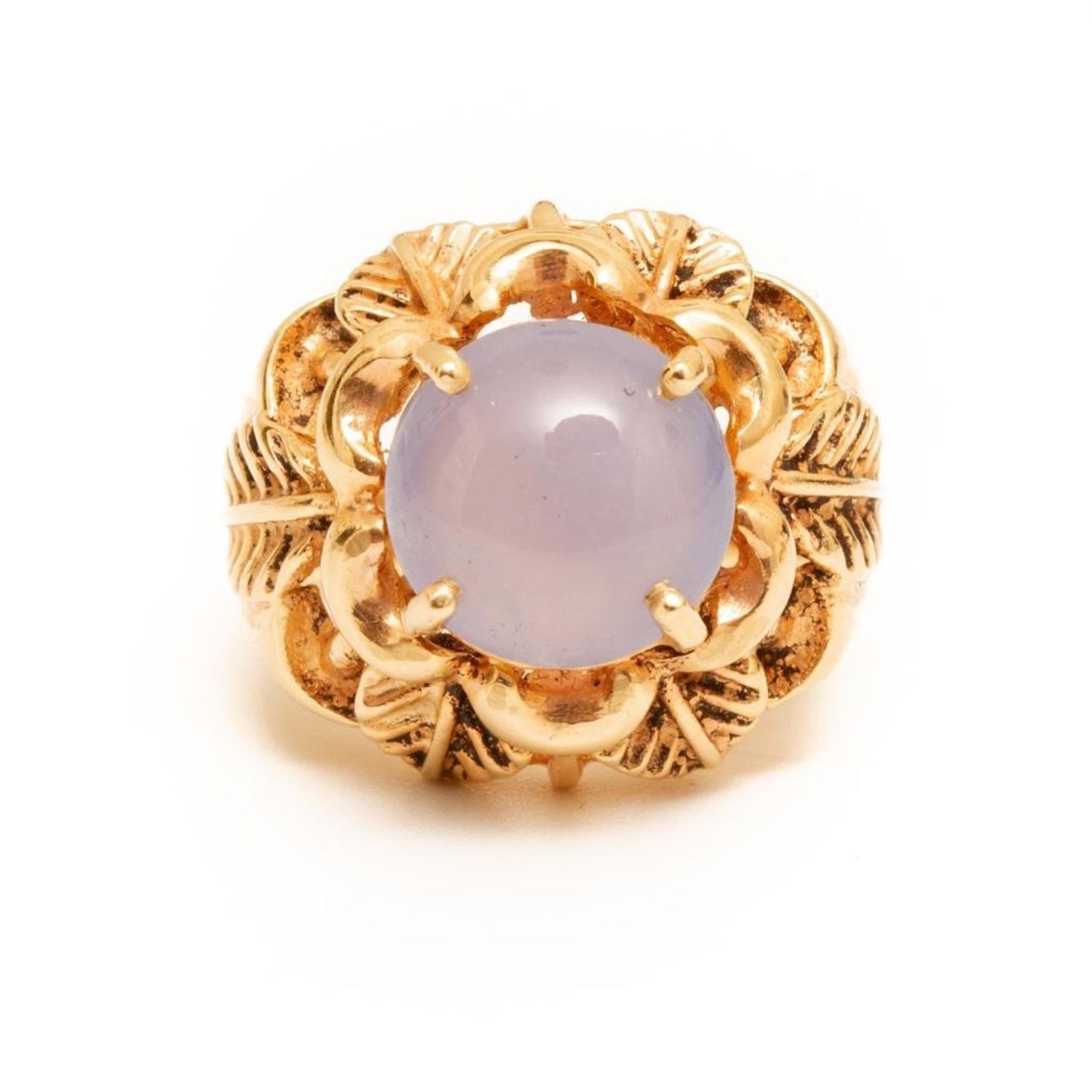 vintage 14k gold blue round chalcedony ring approx. 9.5 mm. weight approx. 4.6 dwt size 5 approx From a noted jewelry collection Park Avenue New York overall in good condition