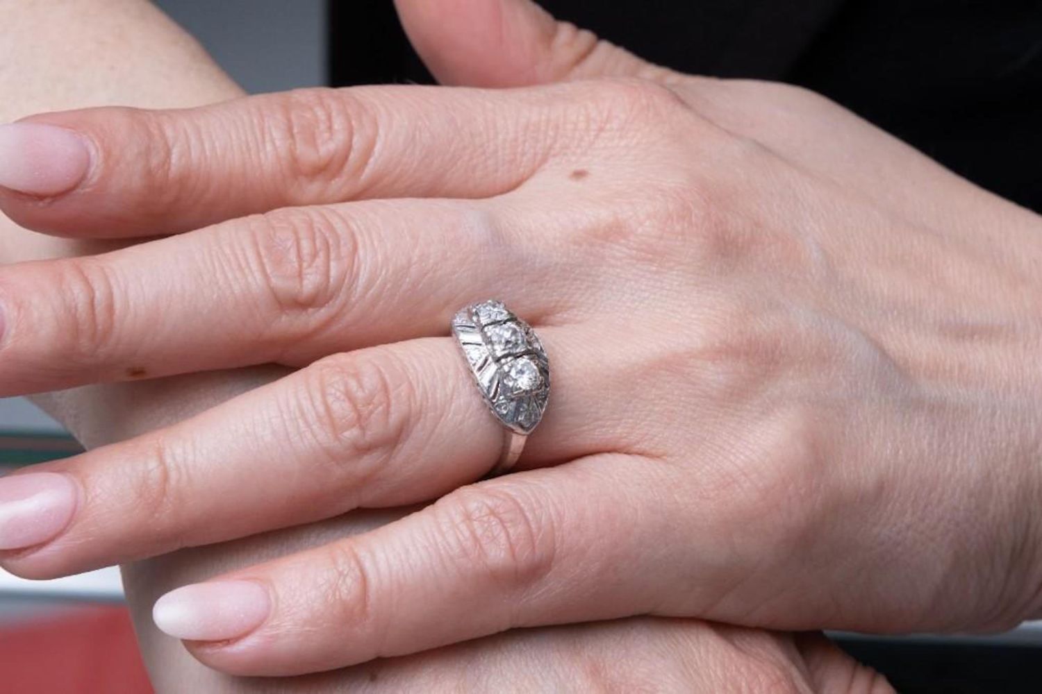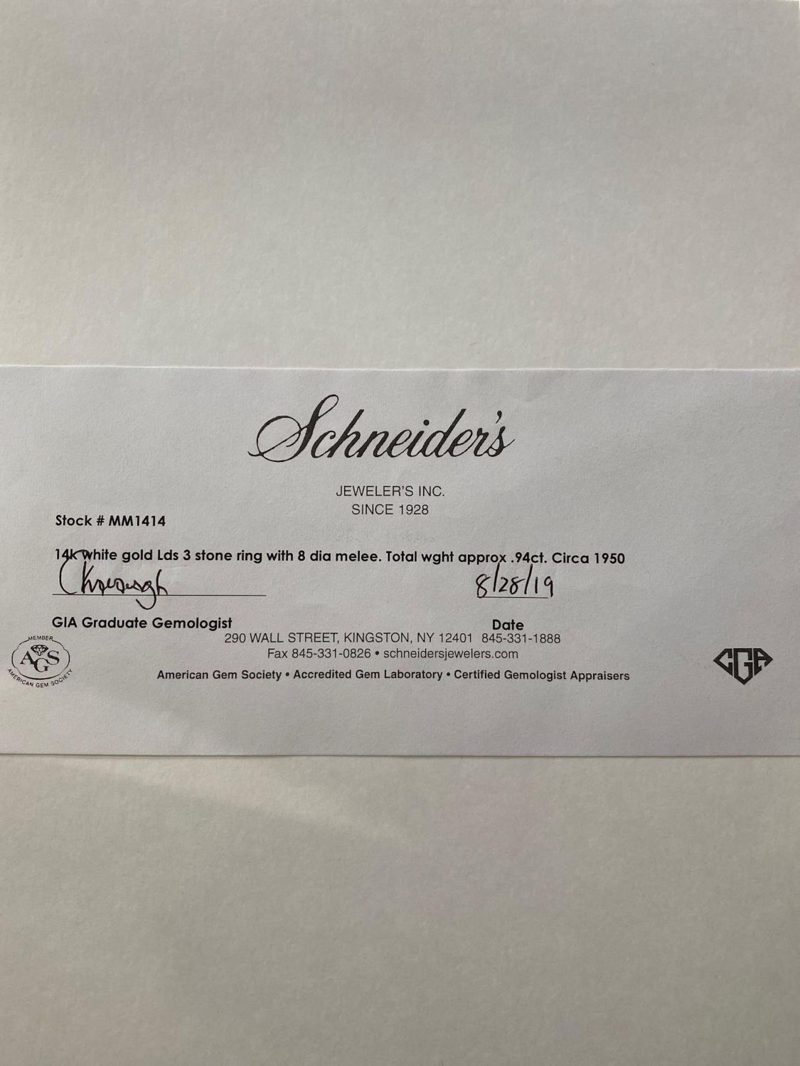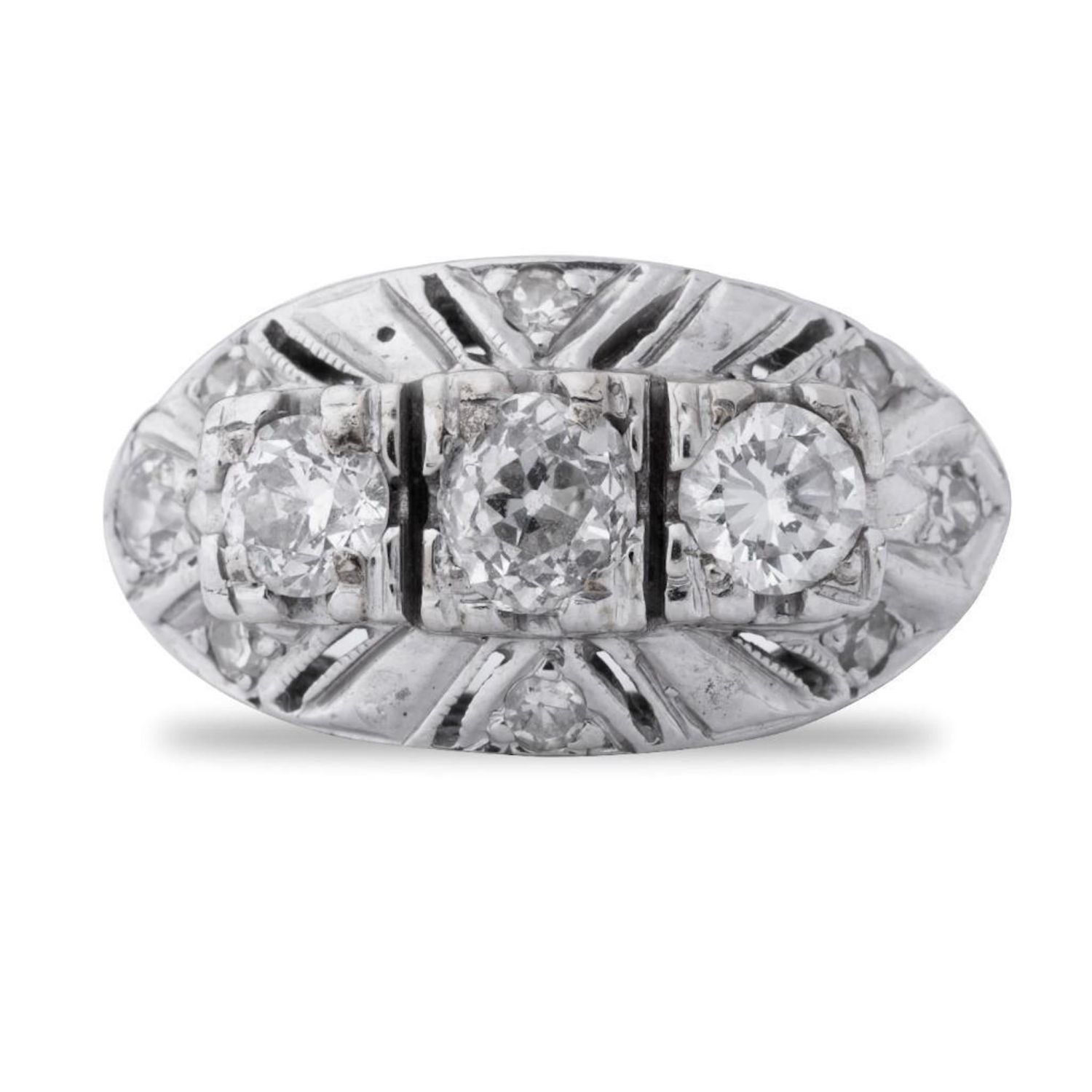 vintage Art Deco design White gold and diamond Ring circa 1950 s6.5. Total weight approx .94ct. Weighs 2.6dwt. This item is accompanied by a GIA appraisers letter from a well respected independent firm that has been in business for over 75 years and its in good condition overall
