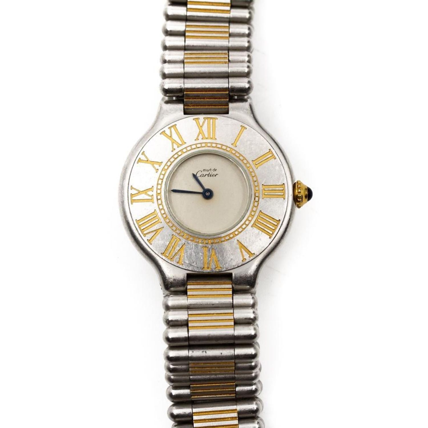 A Cartier Must de Cartier 21 stainless steel quartz wristwatch. A luxury watch that has an elegant and contemporary style with a wide round stainless steel bezel accented with gold-tone Roman numeral hour markers that frame a classic white dial with blued sword style hands. stainless steel case back with a s stainless steel bullet-style bracelet with a deployment style clasp. Watch face measure 1". Bracelet measure 6.5" Movement: Cartier Cal.81, 9 Jewels Running when examined but note the gallery does not warranty the running or accuracy condition of watches.