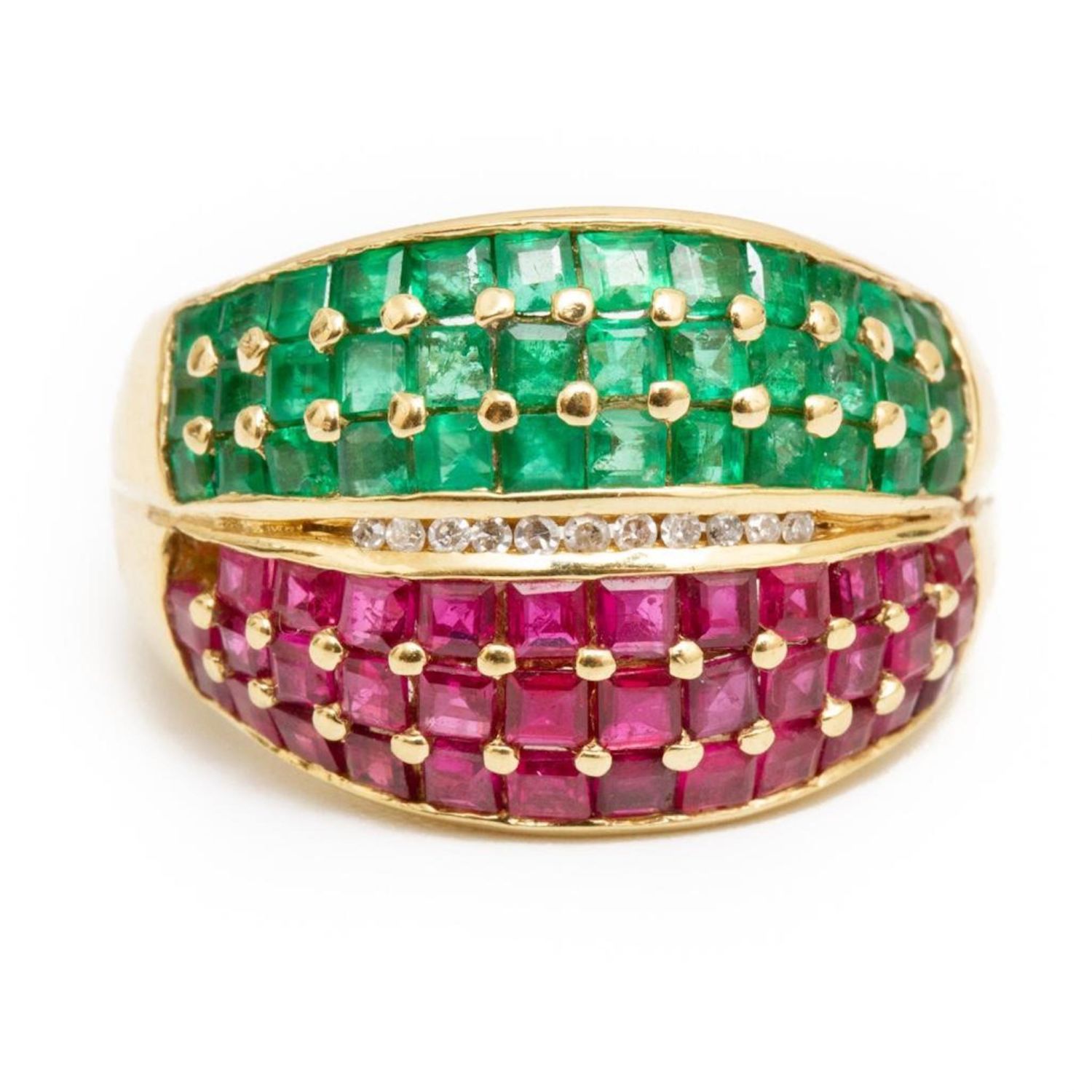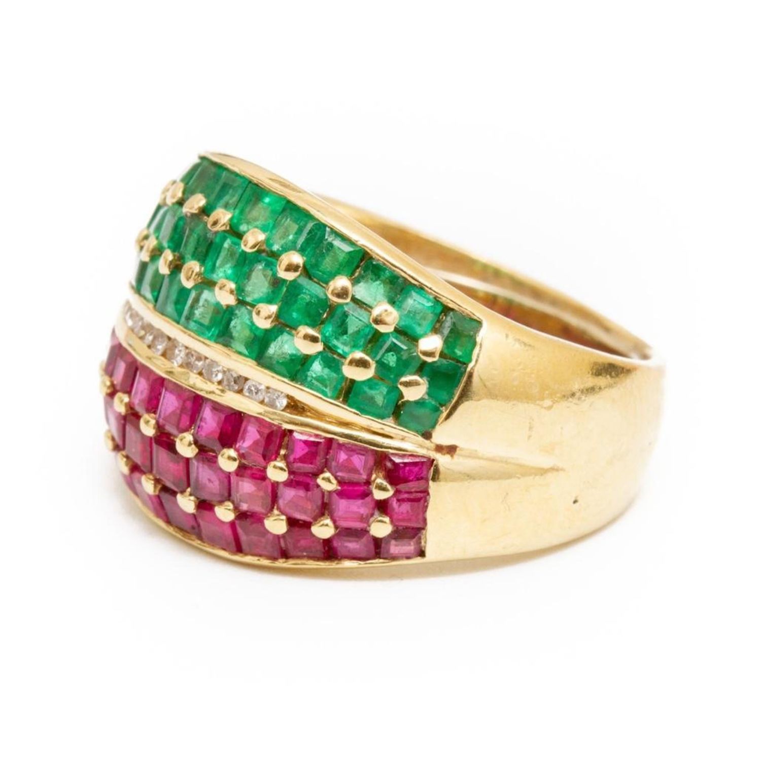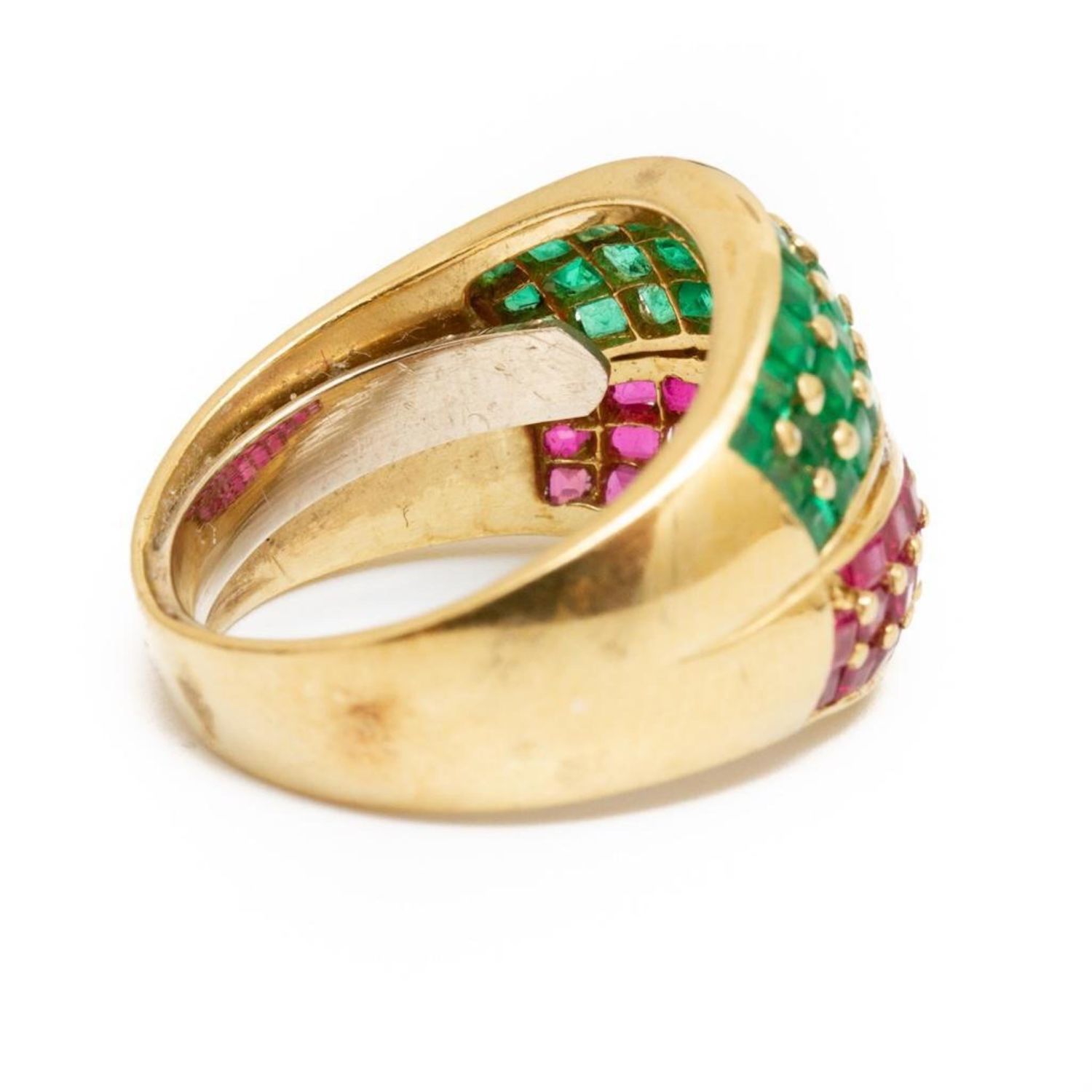 Emerald and ruby 14k gold ring 36 square-cut rubies ap. 1.35 cts., 36 square-cut emeralds ap. .90 ct., size 6 approx. Has stabilizer. Weight approx 6.2 dwt From the Broussard estate a noted jewelry collection Park Avenue New York .in good condition overall