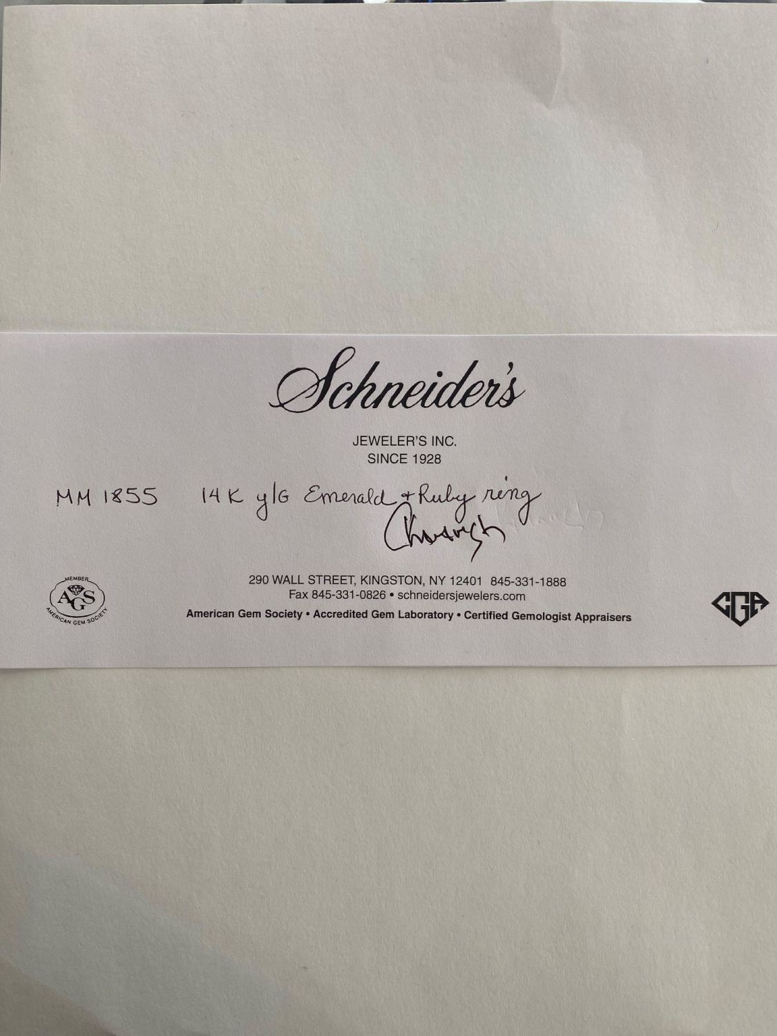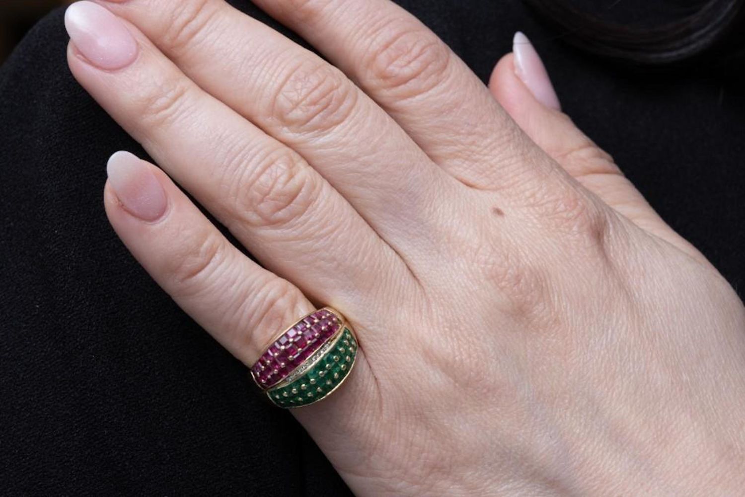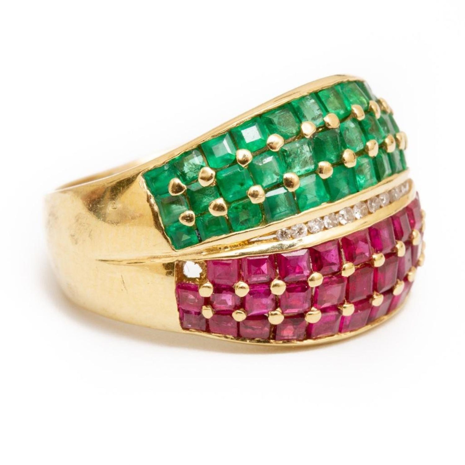 Emerald and ruby 14k gold ring 36 square-cut rubies ap. 1.35 cts., 36 square-cut emeralds ap. .90 ct., size 6 approx. Has stabilizer. Weight approx 6.2 dwt From the Broussard estate a noted jewelry collection Park Avenue New York .in good condition overall