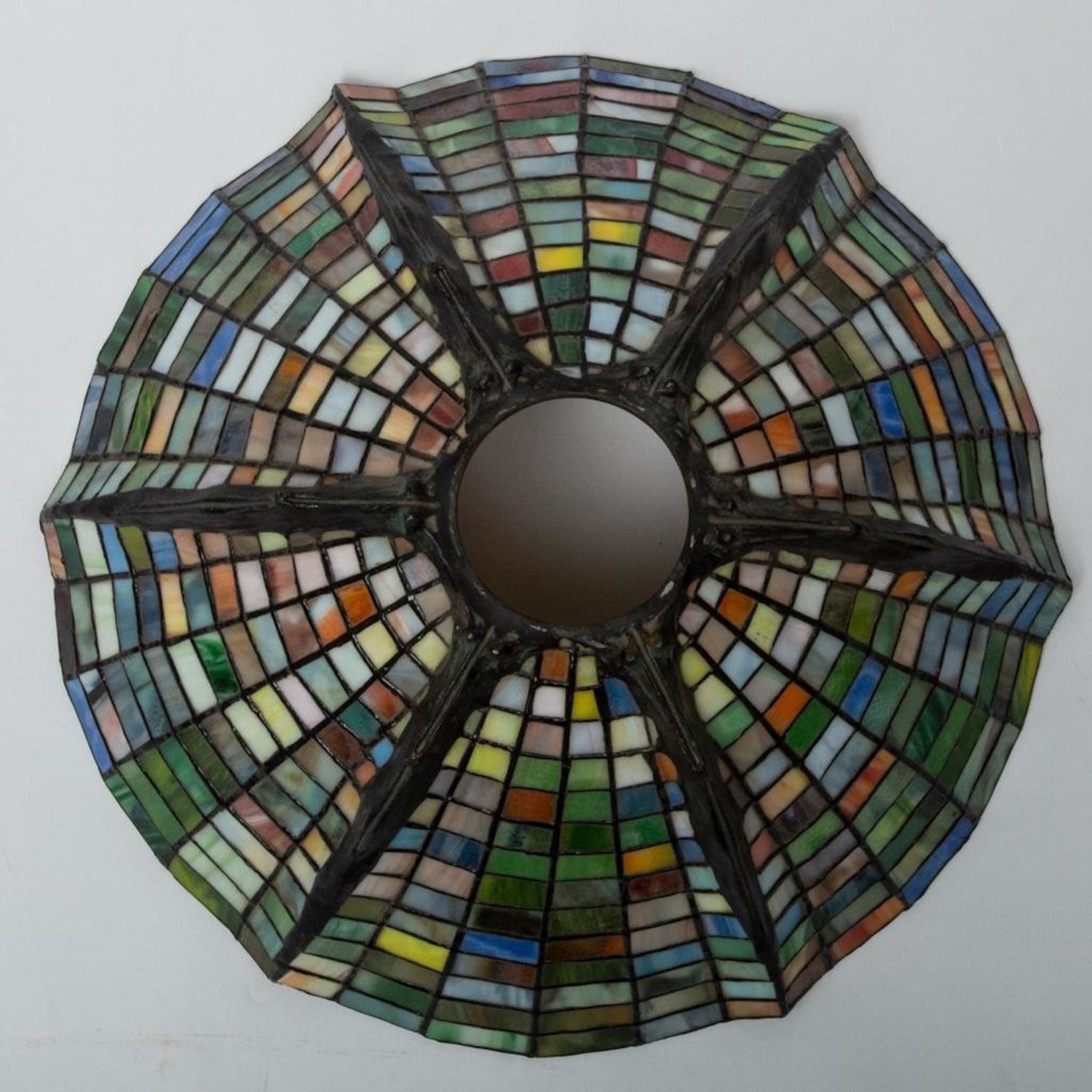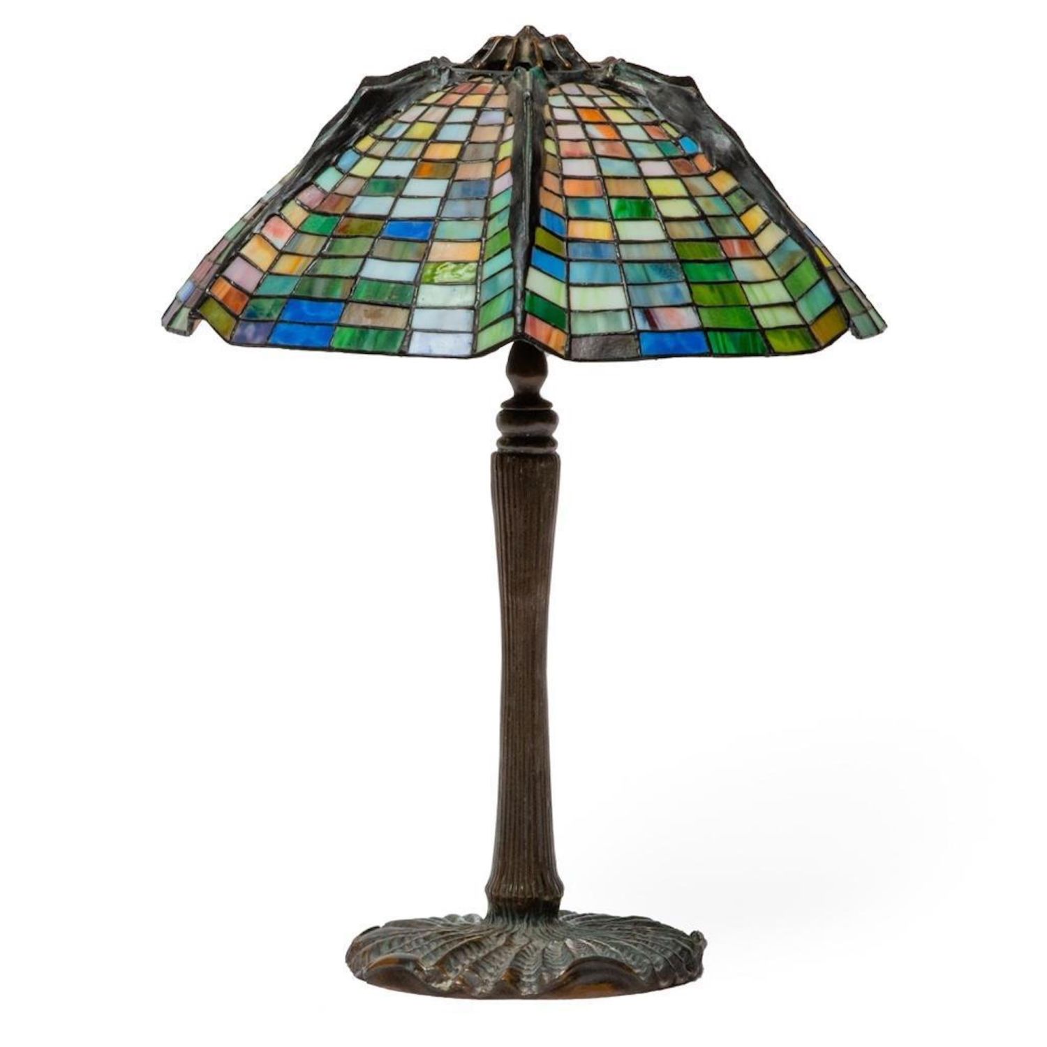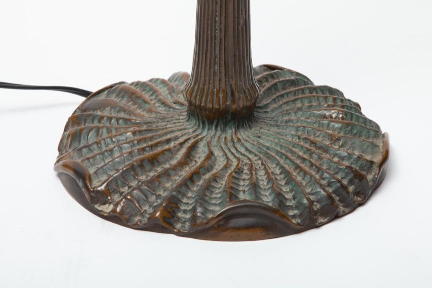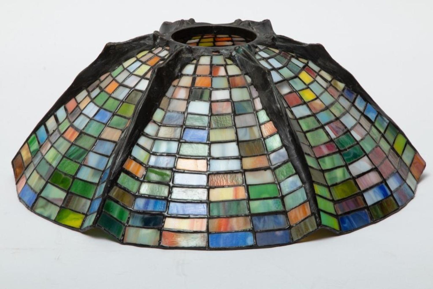 Excellent Art Nouveau Leaded Glass Table Lamp with spider web design and matching Bronze Base Lamp. Early 20th Century. Measures 21"H Approx. Shade has a 16"D and the base is 8" Great Lamp! Spider web Design. Looks like a Tiffany with an exceptional base and good patina, but no signature that we can find. Note:this is a vintage lamp and we know of no reproductions of this lamp or the base. good condition. Tag removed or Unsigned Tiffany???