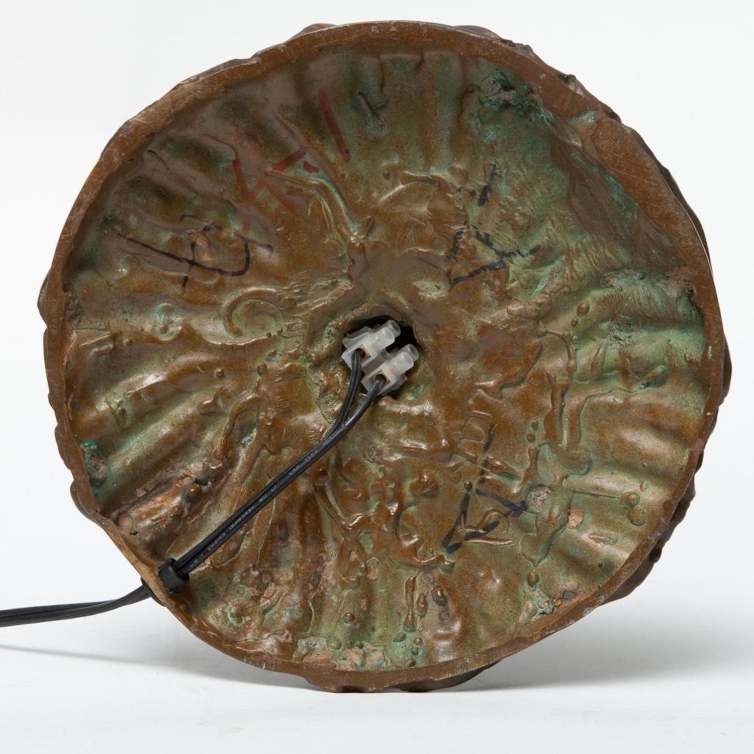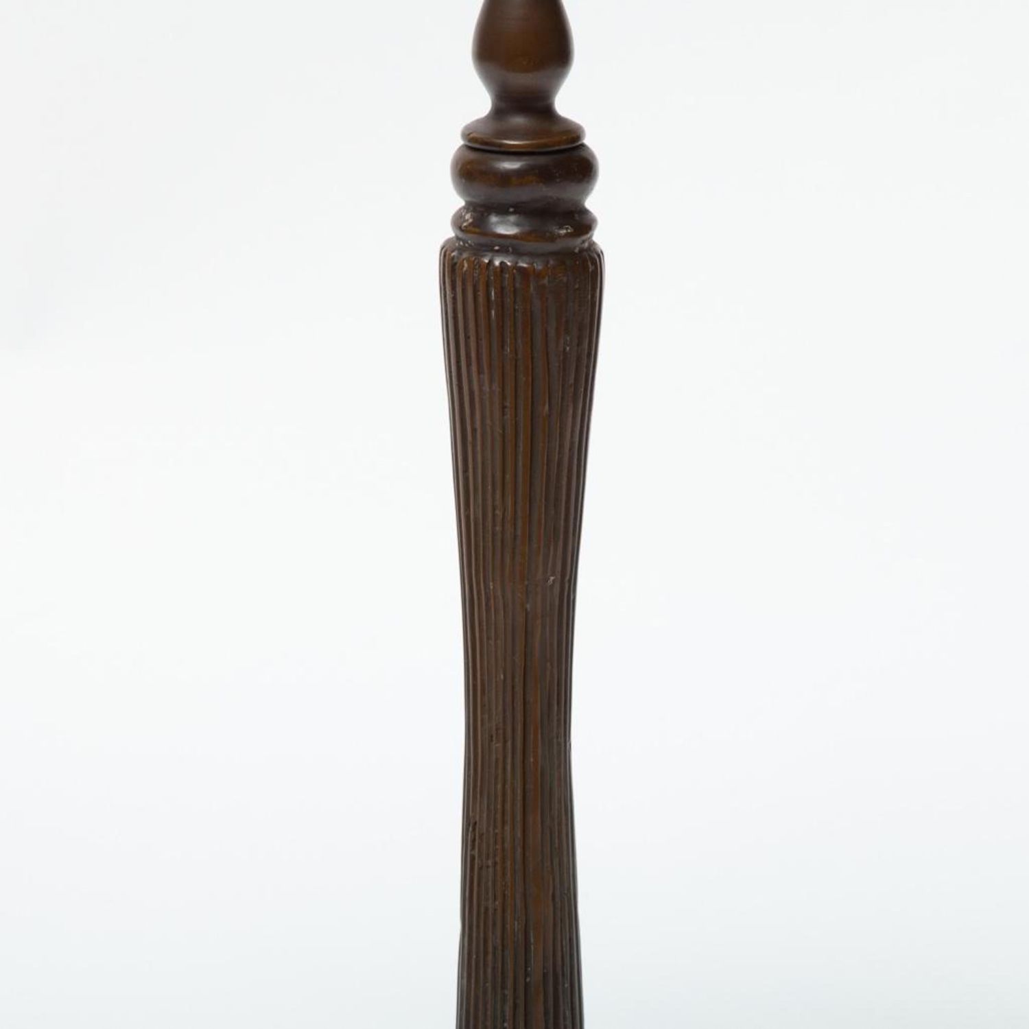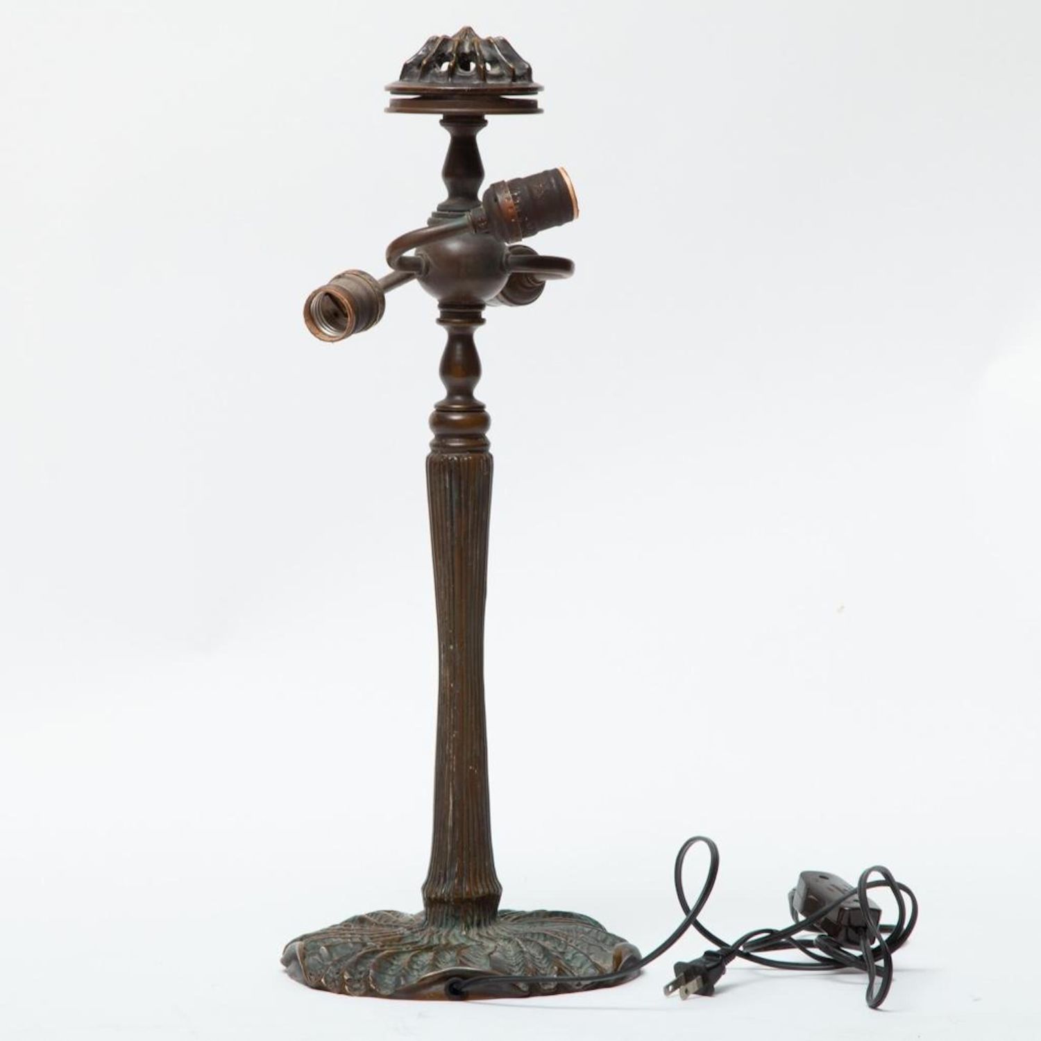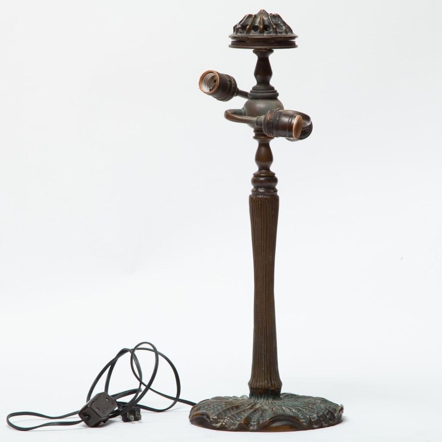 Excellent Art Nouveau Leaded Glass Table Lamp with spider web design and matching Bronze Base Lamp. Early 20th Century. Measures 21"H Approx. Shade has a 16"D and the base is 8" Great Lamp! Spider web Design. Looks like a Tiffany with an exceptional base and good patina, but no signature that we can find. Note:this is a vintage lamp and we know of no reproductions of this lamp or the base. good condition. Tag removed or Unsigned Tiffany???