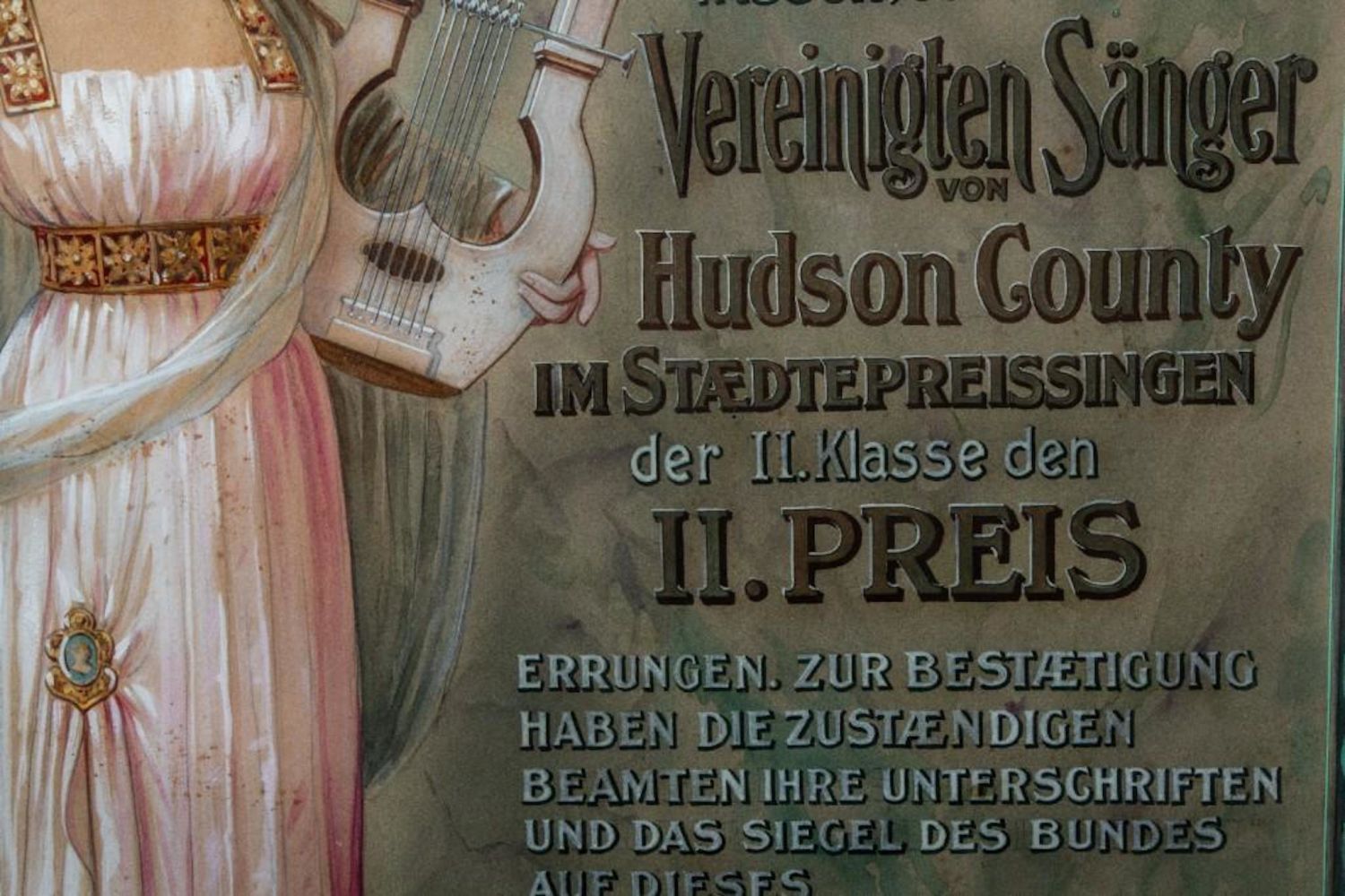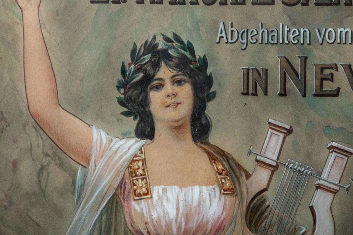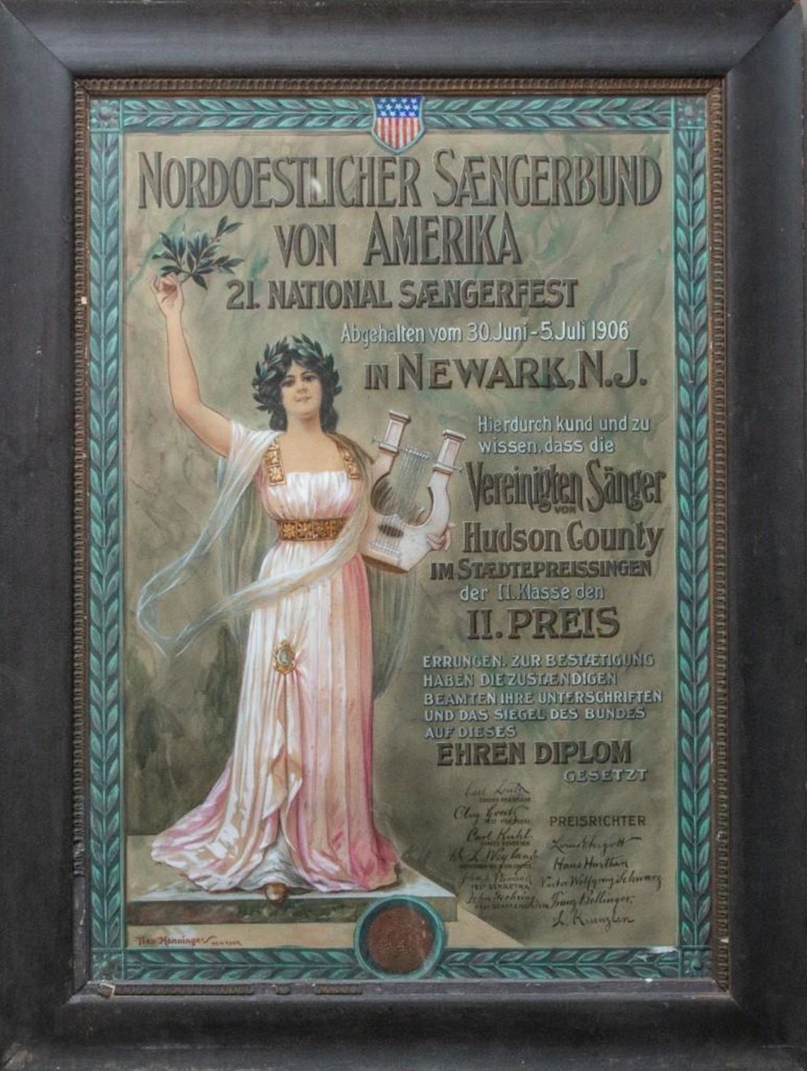 Theo Henninger Signed 1906 original watercolor and ink painting for a poster to advertise the"Sangerfest " in New Jersey Singing Festival 24"W x 34"H. Incredible Detail and draftmanship. in good condition