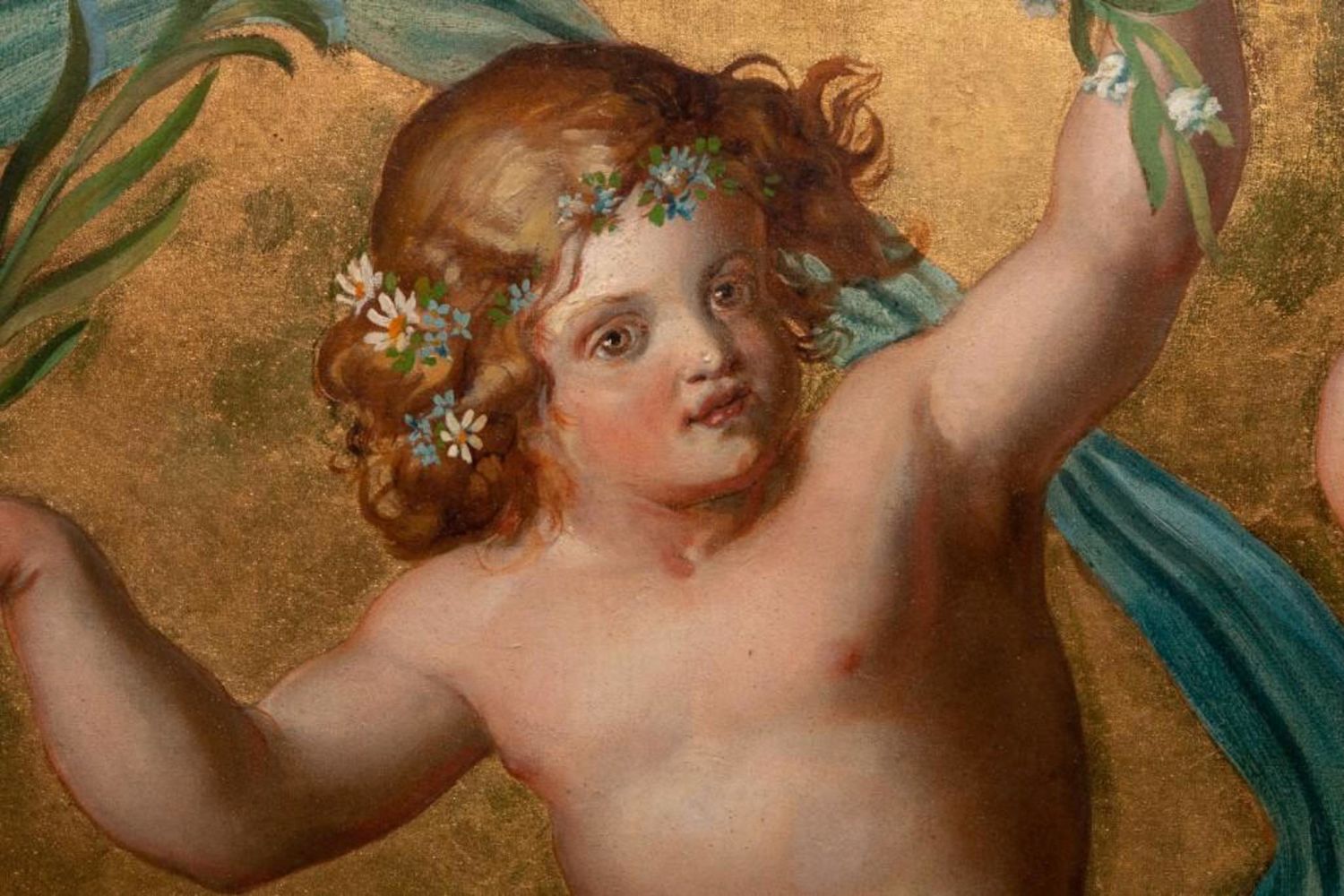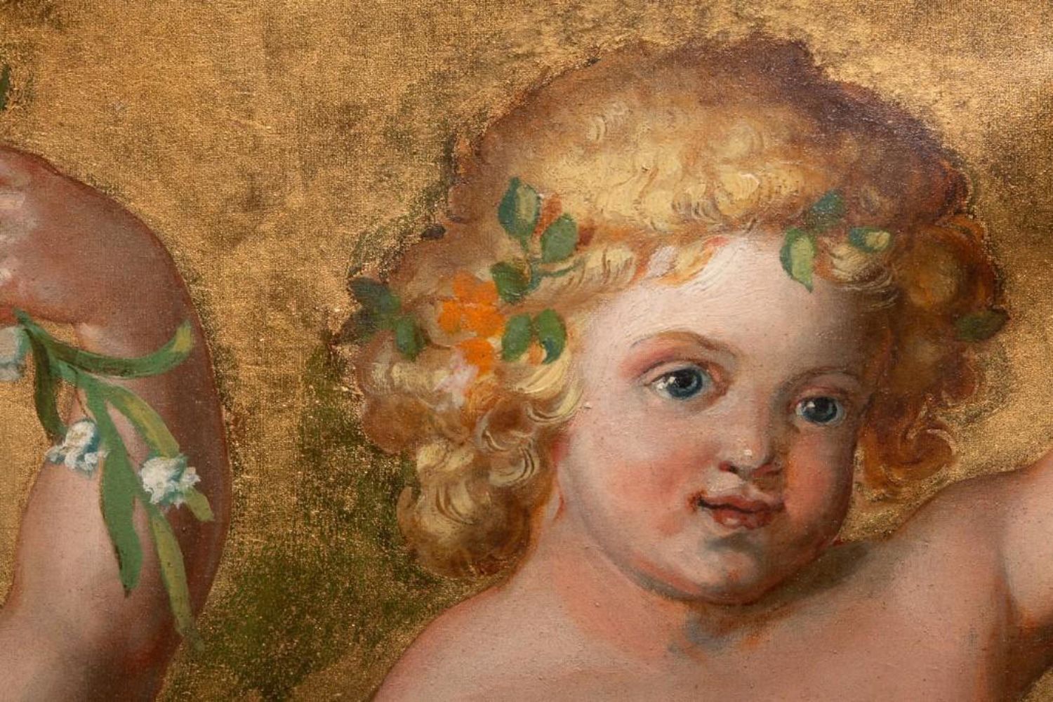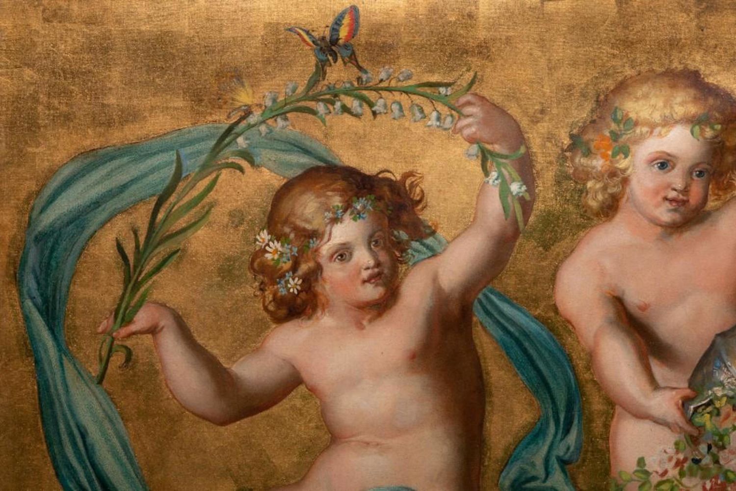 Hans Makart 19th century unsigned (Attrib) Architectural Oil painting on canvas, part of an Austrian ceiling fresco relined and mounted on stretchers. Cavorting Putti with Garlands of Fruits and Flowers. Applied gold leaf throughout. Unframed. 34"W x 40"HHans Makart (28 May 1840 – 3 October 1884) was a 19th-century Austrian academic history painter, designer, and decorator. He is best known for his influence on Gustav Klimt and other Austrian artists, but in his own era he was considered an important artist himself and a celebrity figure in the high culture of Vienna and attended with almost cult-like adulation.From the property of Zoullas Collection