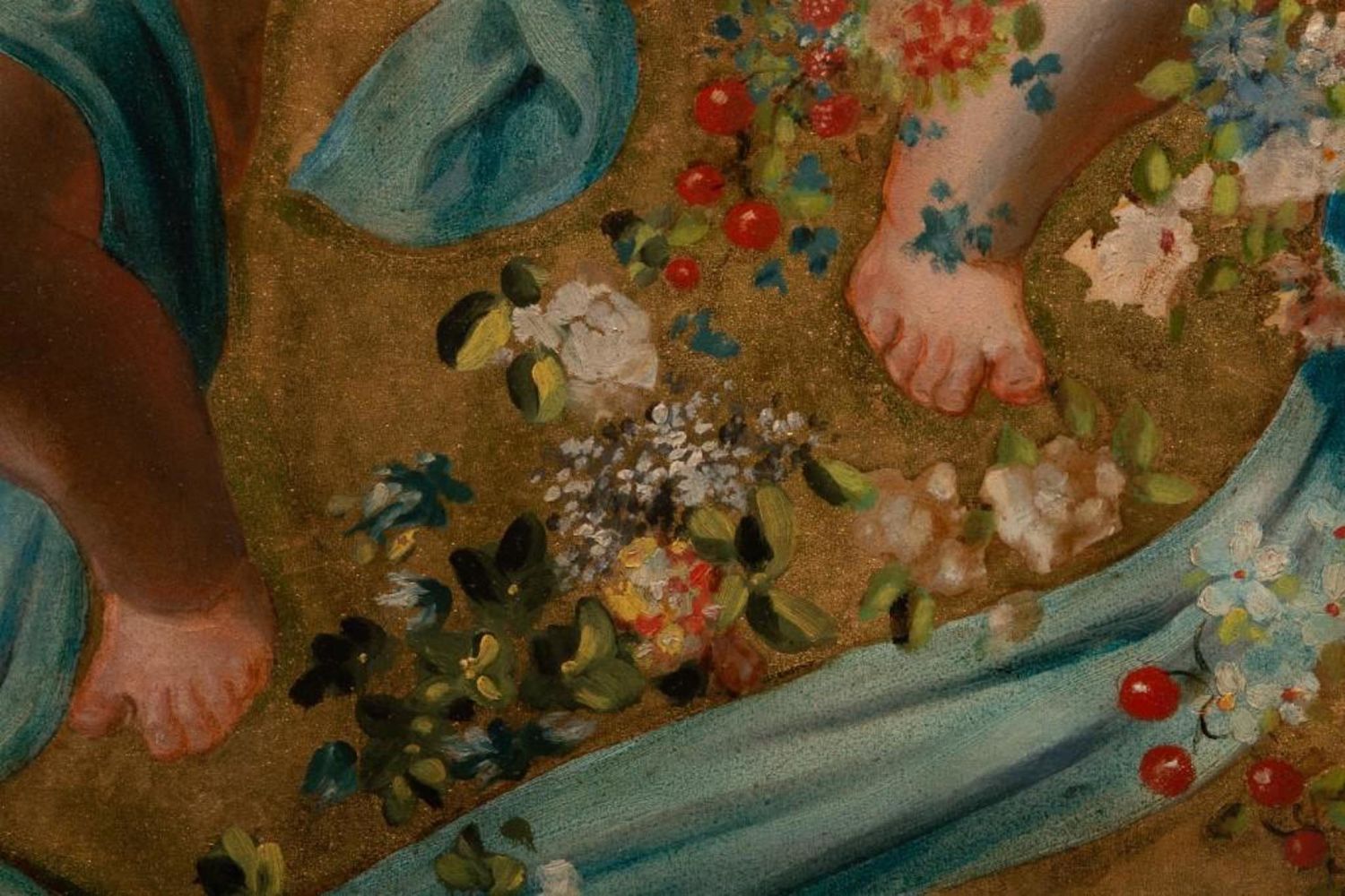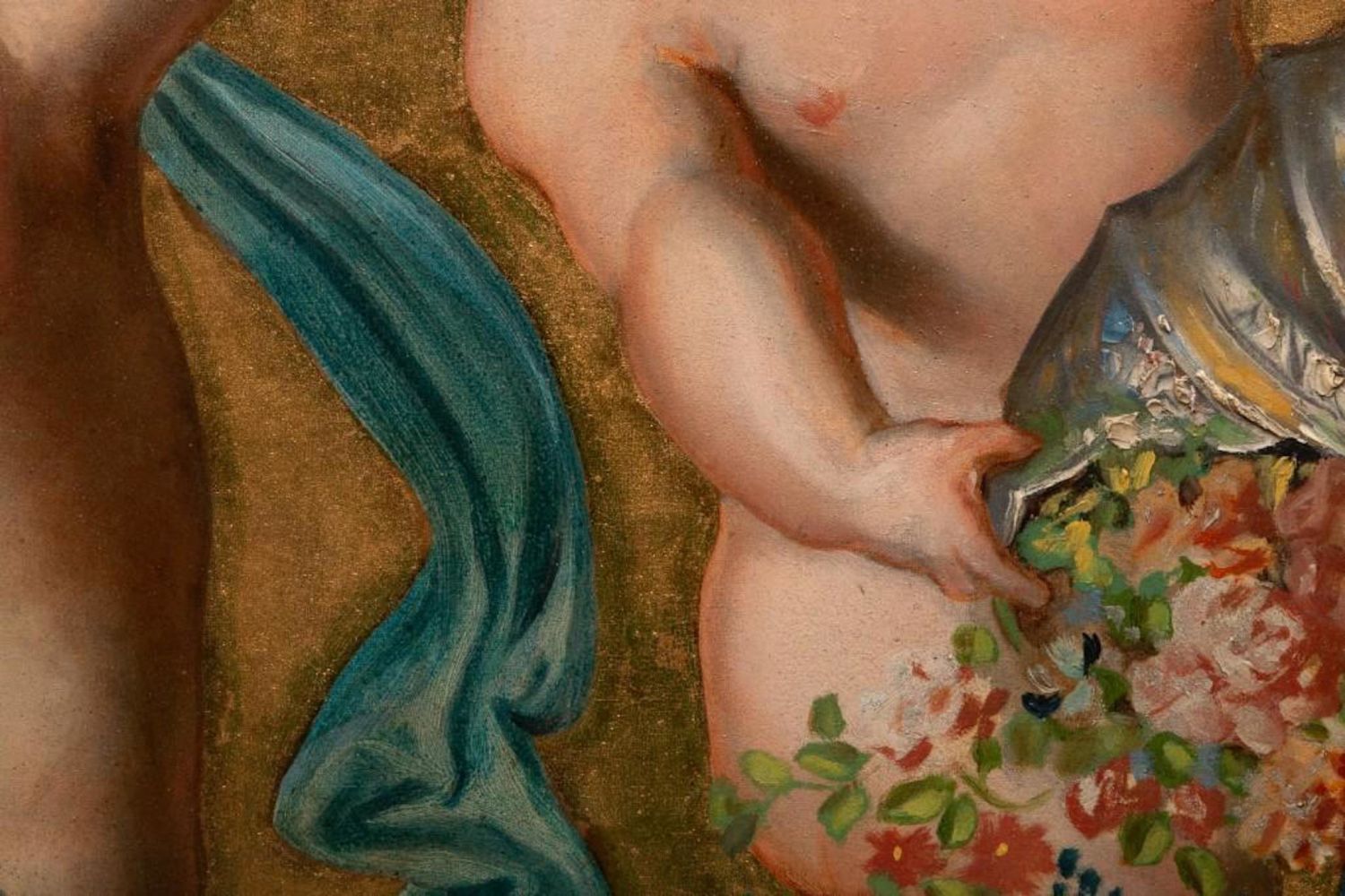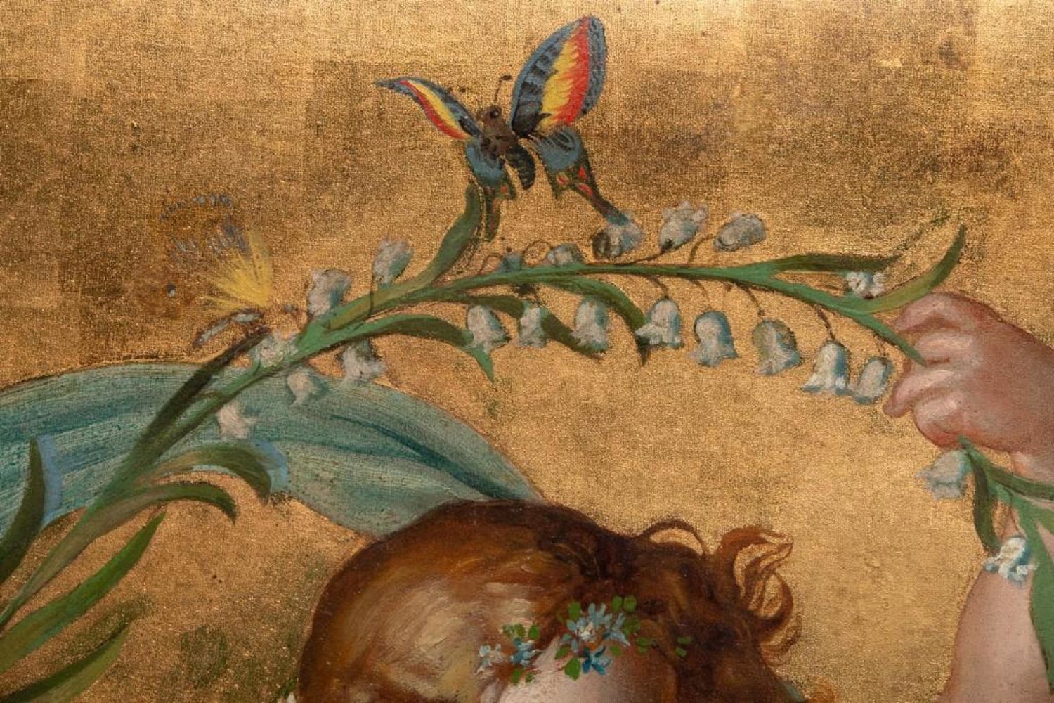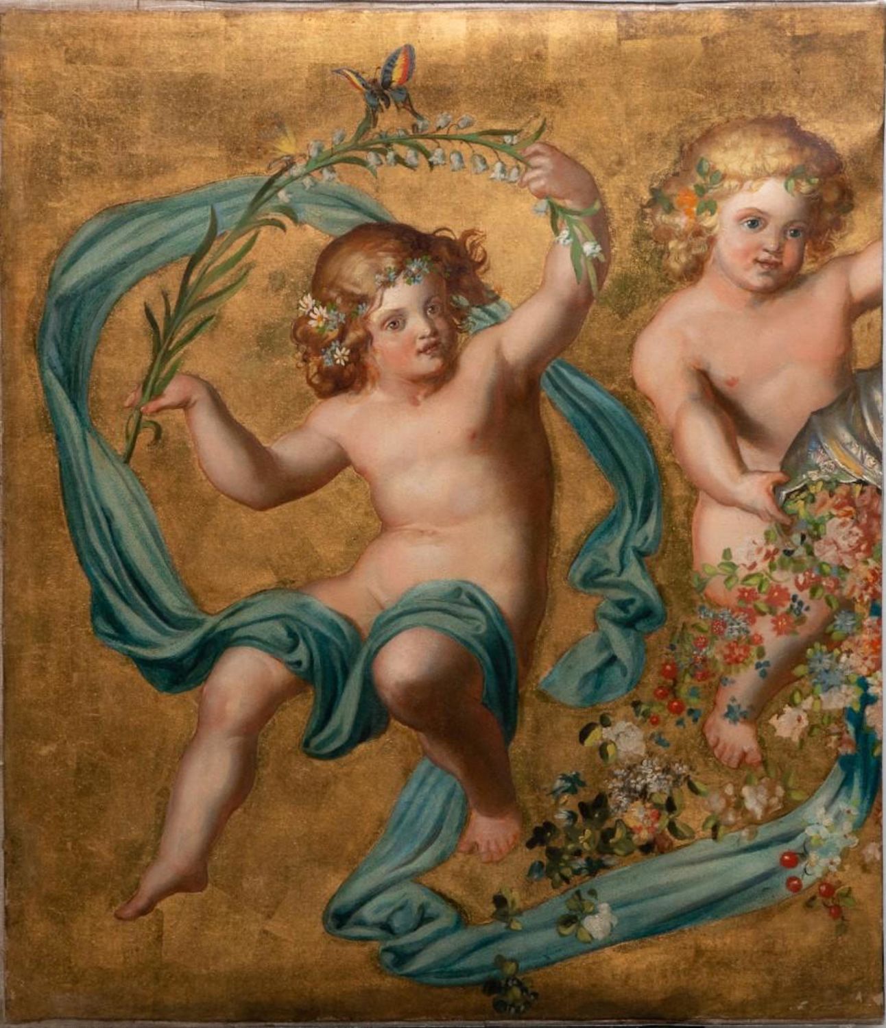 Hans Makart 19th century unsigned (Attrib) Architectural Oil painting on canvas, part of an Austrian ceiling fresco relined and mounted on stretchers. Cavorting Putti with Garlands of Fruits and Flowers. Applied gold leaf throughout. Unframed. 34"W x 40"HHans Makart (28 May 1840 – 3 October 1884) was a 19th-century Austrian academic history painter, designer, and decorator. He is best known for his influence on Gustav Klimt and other Austrian artists, but in his own era he was considered an important artist himself and a celebrity figure in the high culture of Vienna and attended with almost cult-like adulation.From the property of Zoullas Collection