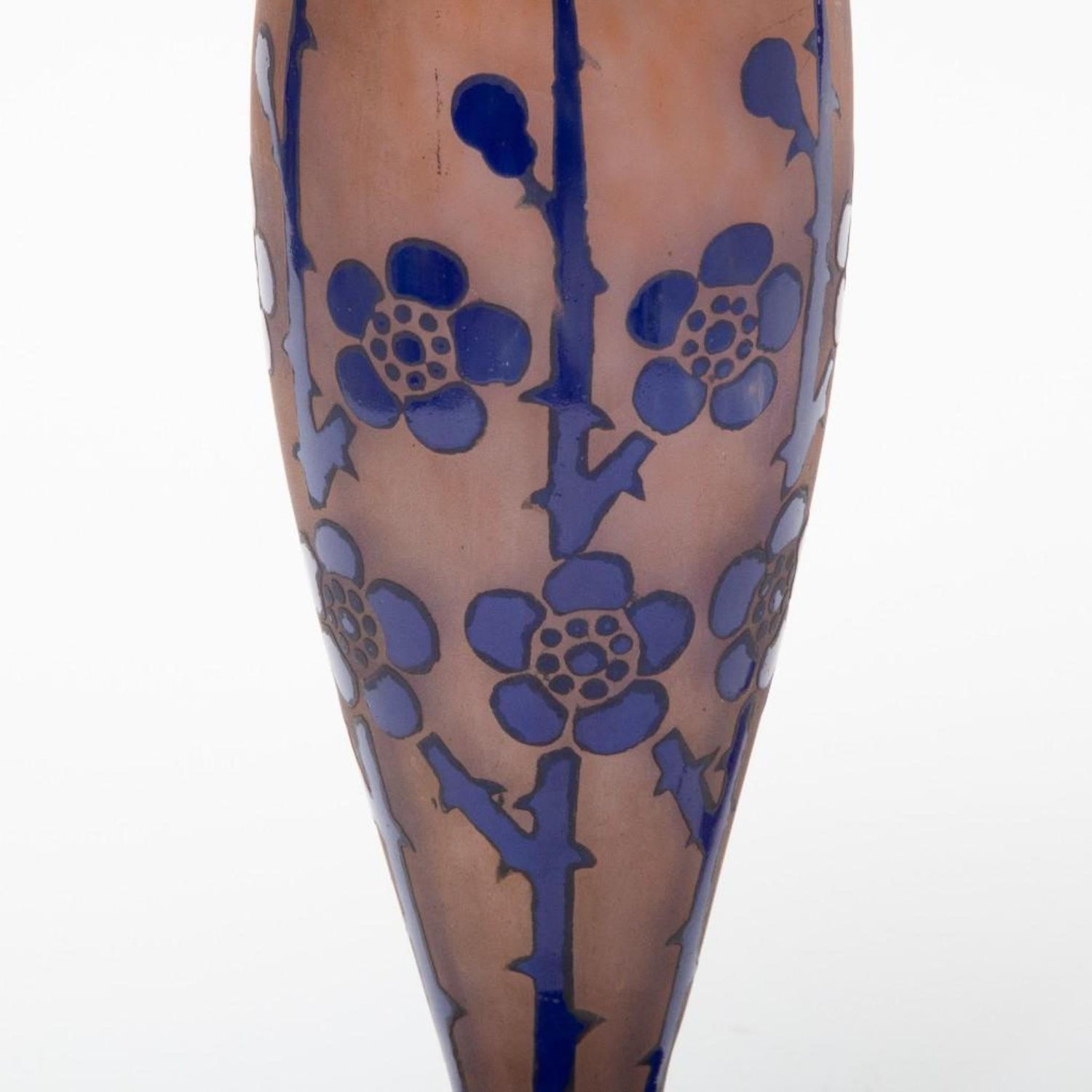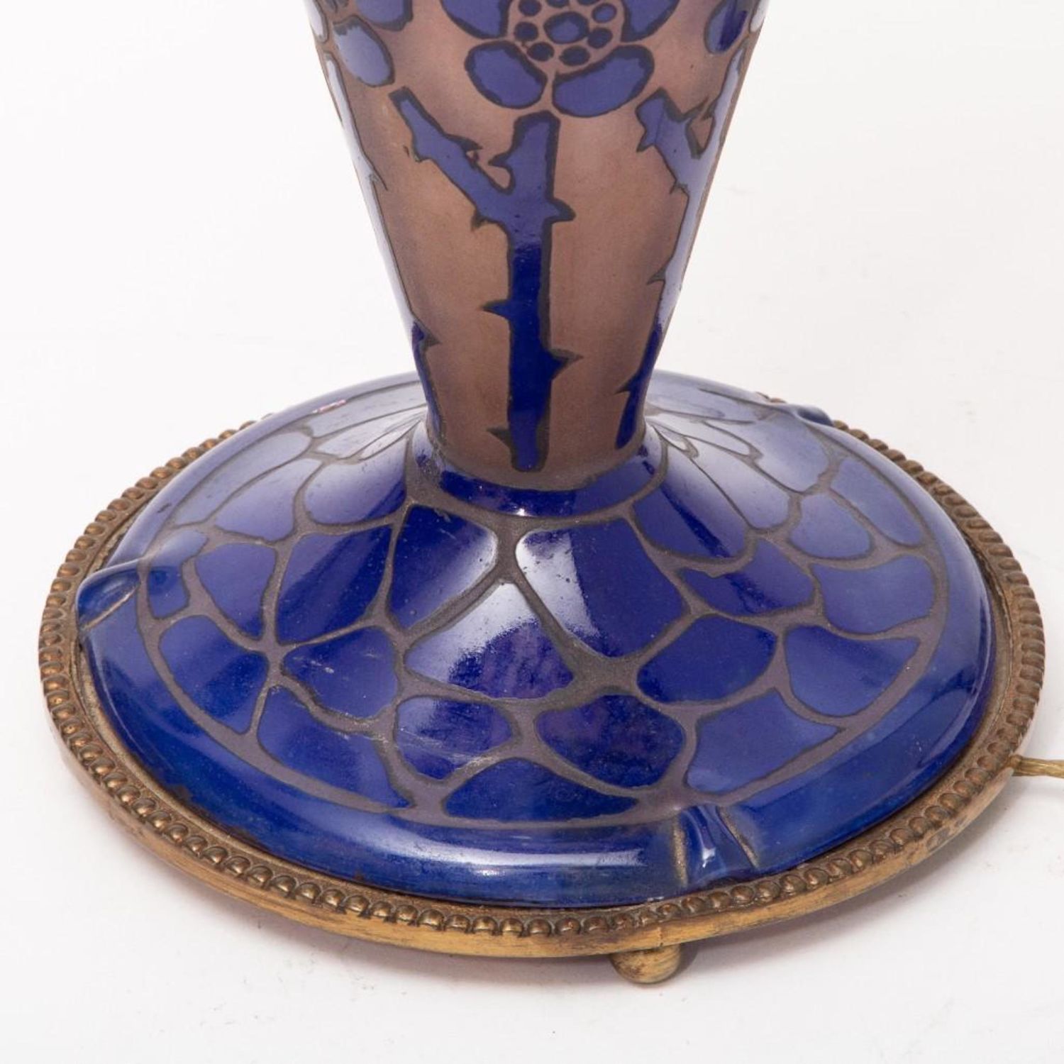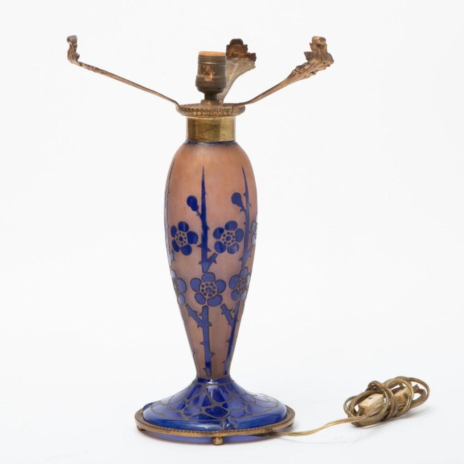 Schneider – Le Verre Francais signed antique French Cameo Glass Table Lamp, acid etched with with stylized flowers, height 23 inches overall. Circa 1920. has the candy cane early signature .Aubepines Pattern. The two brothers Charles and Ernst Schneider both worked for the factory Daum in Nancy in the beginning of the 20th century and there they learned the technique of blowing and etching the glass. In 1913, just before World War I, they founded a factory of themselves in Epinay sur Seine and started tot develop a new style with more firm lines and more clear colors. The vases of the factory Schneider had already more features of the Art Deco than of the Art Nouveau. They imported new forms and new colors in the world of glass industry that was those days dominated by Daum and Galle.Le Verre Francais-They developed two production lines in the glass factory with two different styles: glass with the signature “Le Verre Francais” and the other line with only the signature “Schneider”. The line of Le Verre Francais made cameo glass that existed out of several layers of etched glass. The motifs of the decorations were inspired by the nature, but were represented in a more abstract way and therefore the glass objects show a great difference with the style of the glass of the factory of Gallé or Daum. They created their own specific style that you can recognize on the very contrasting colors on the glass object. For example notice the contrast between orange and yellow on many pieces of the factory Schneider-Le Verre Francais. Therefore the colors make nowadays a more modern impression and the art objects of the factory Schneider can be placed easily in a complete modern interior.The vases of the line Le Verre Francais were produced in higher numbers than the art objects of the other line of this factory. These glass objects with only the signature “Schneider” are more rare to find and therefore rather expensive. Signatures and Originality-There are different signatures: Le Verre Francais on the foot of the vase and Charder (=Charles Schneider) in the middle of the vase. Sometimes both the signatures are represented on the vase. In the early vases of the factory there is no signature at all except for the small glass candy cane stick melted into the glass object with the three colors of the flag of France, the so-called “Berlingot flag”. When a vase has a small Berlingot flag than it is an early one made just after World War I. Reference:: Charles Schneider, Le Verre Francais- Charder Schneider by Marie-Christine Joulin and Gerold Maier, Augsburg, 2004. There are very good copies on the market nowadays but this is not one of them. good condition