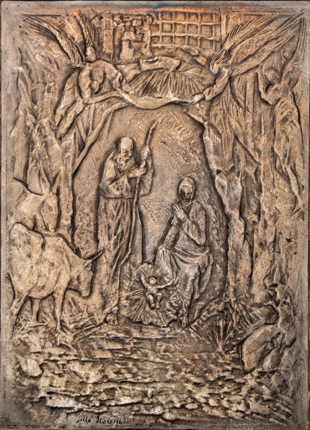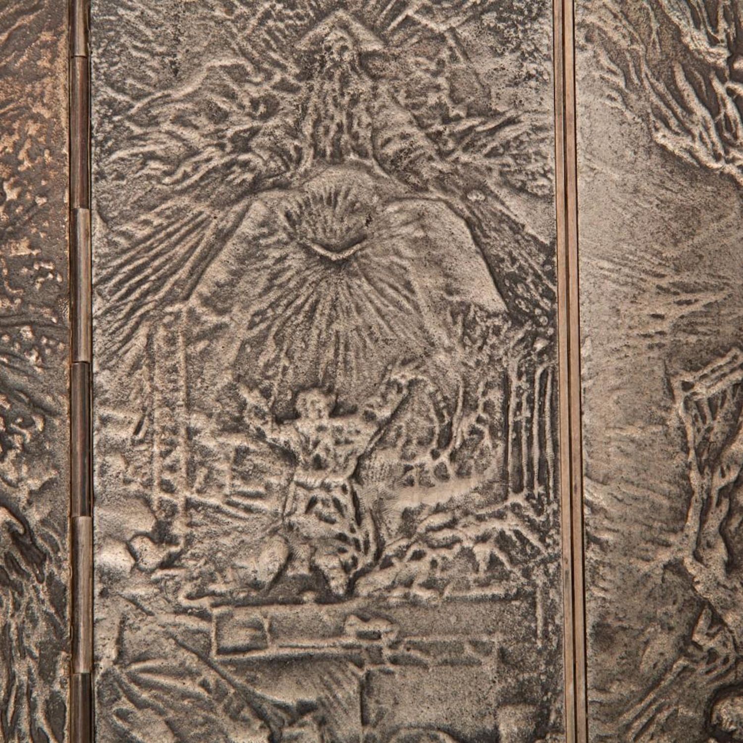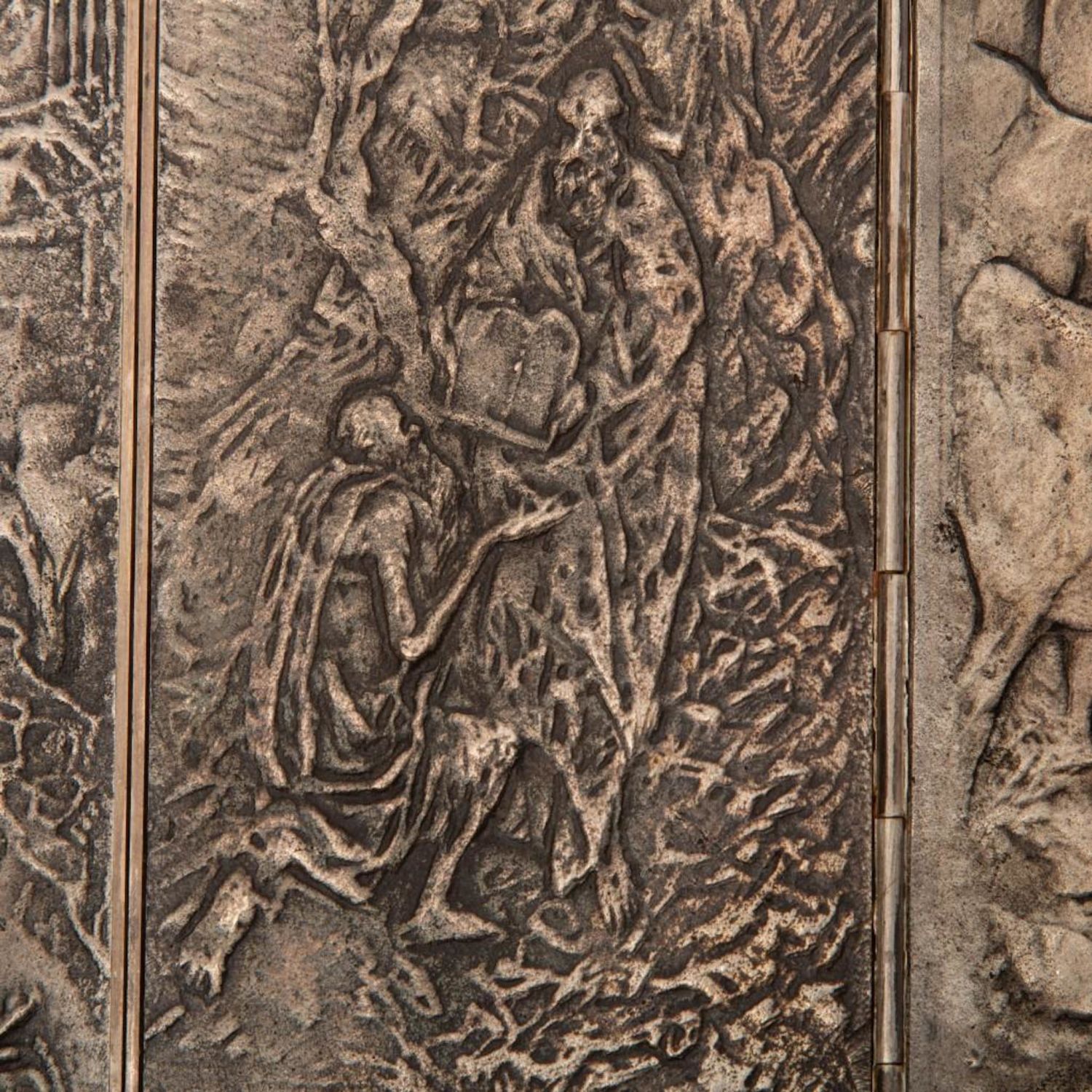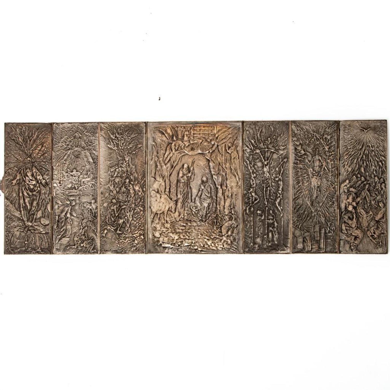 Lello Scorzelli signed 20th century PAPAL Seven Panel Silver Sculpted Folding Travel icon inset with silver on reverse. Papal Coat of Arms he seal reads "IN NOMINE DOMINI" The center panel depicts the nativity, flanked on each side by three smaller panels from old testament on one side and from the new testament on the other Measures 6 1/2"H x 18 3/8" W fully extended. Folded it measures 4 5/8"W approx. Marked "800" Silver. IN GOOD CONDITION. Weighs 52 Troy ounces