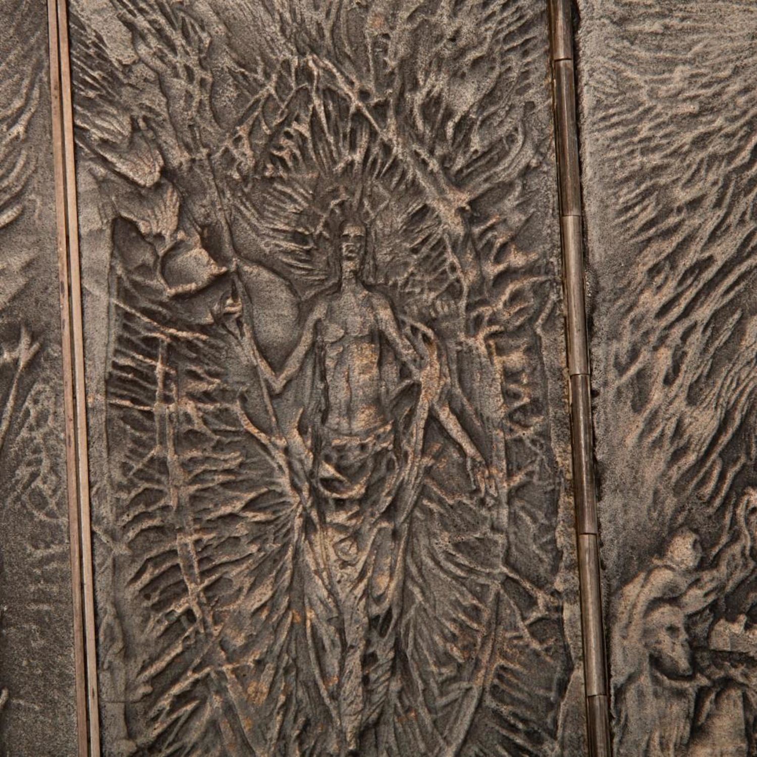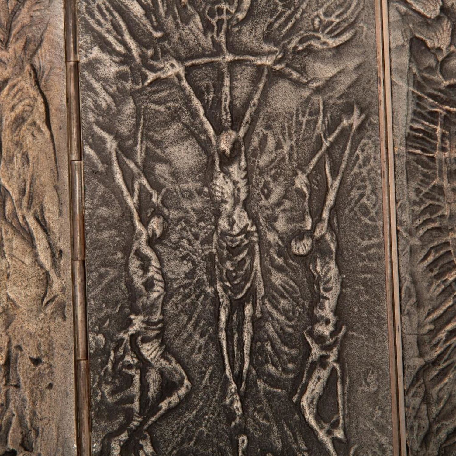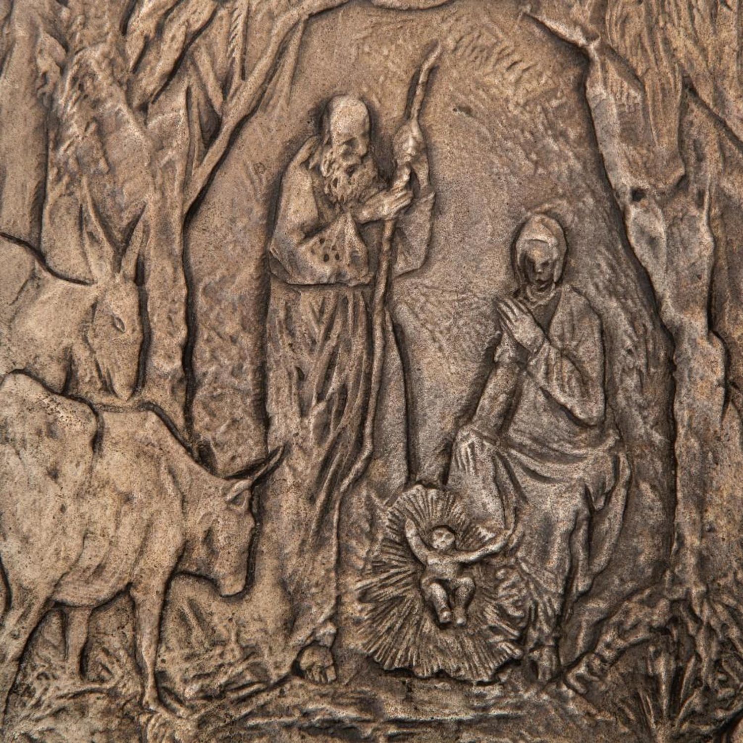 Lello Scorzelli signed 20th century PAPAL Seven Panel Silver Sculpted Folding Travel icon inset with silver on reverse. Papal Coat of Arms he seal reads "IN NOMINE DOMINI" The center panel depicts the nativity, flanked on each side by three smaller panels from old testament on one side and from the new testament on the other Measures 6 1/2"H x 18 3/8" W fully extended. Folded it measures 4 5/8"W approx. Marked "800" Silver. IN GOOD CONDITION. Weighs 52 Troy ounces