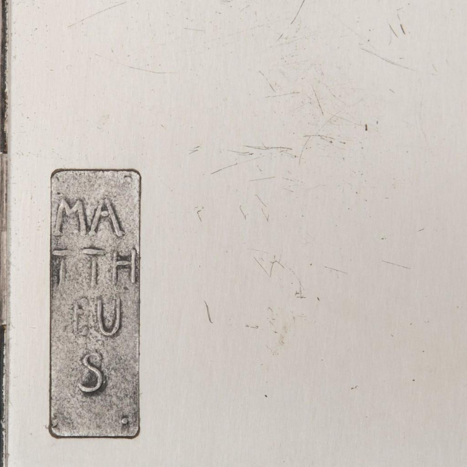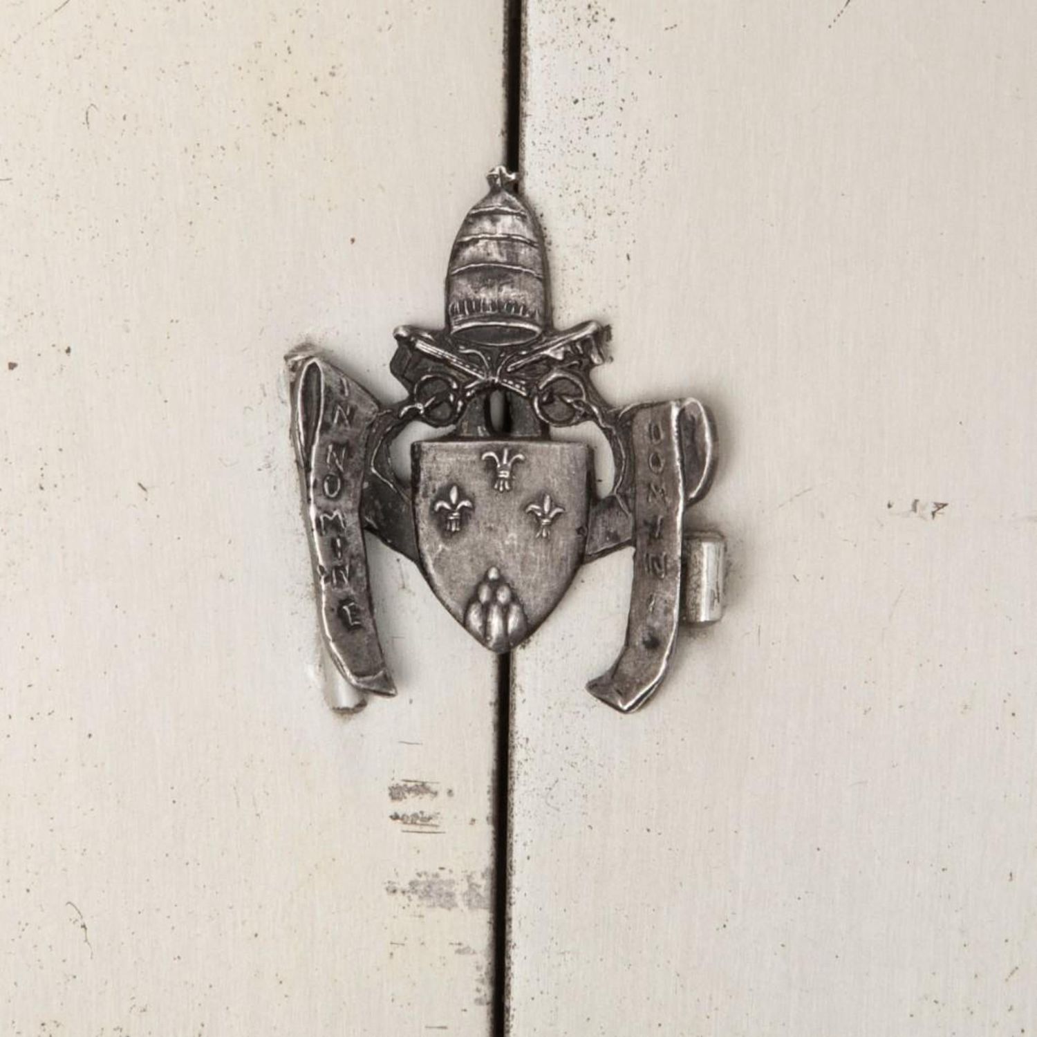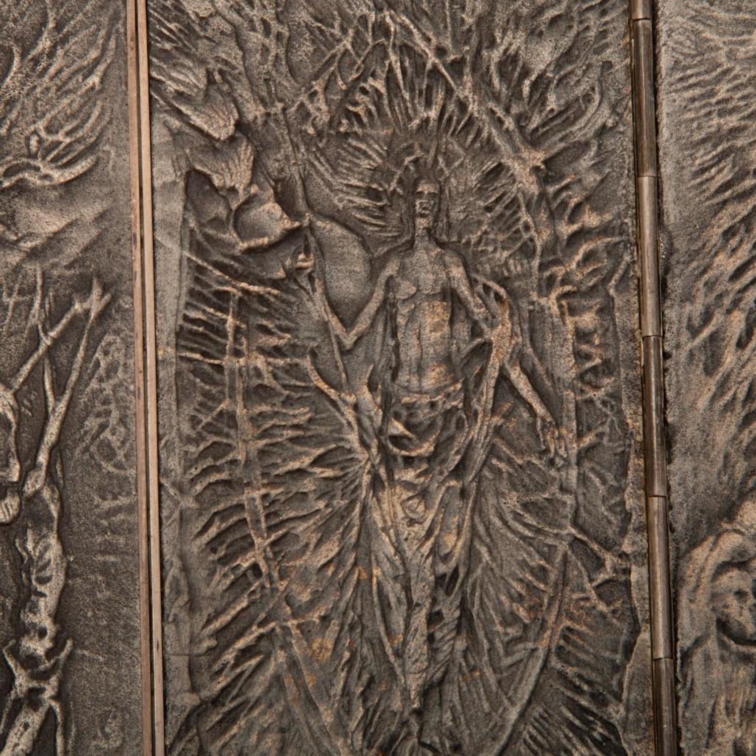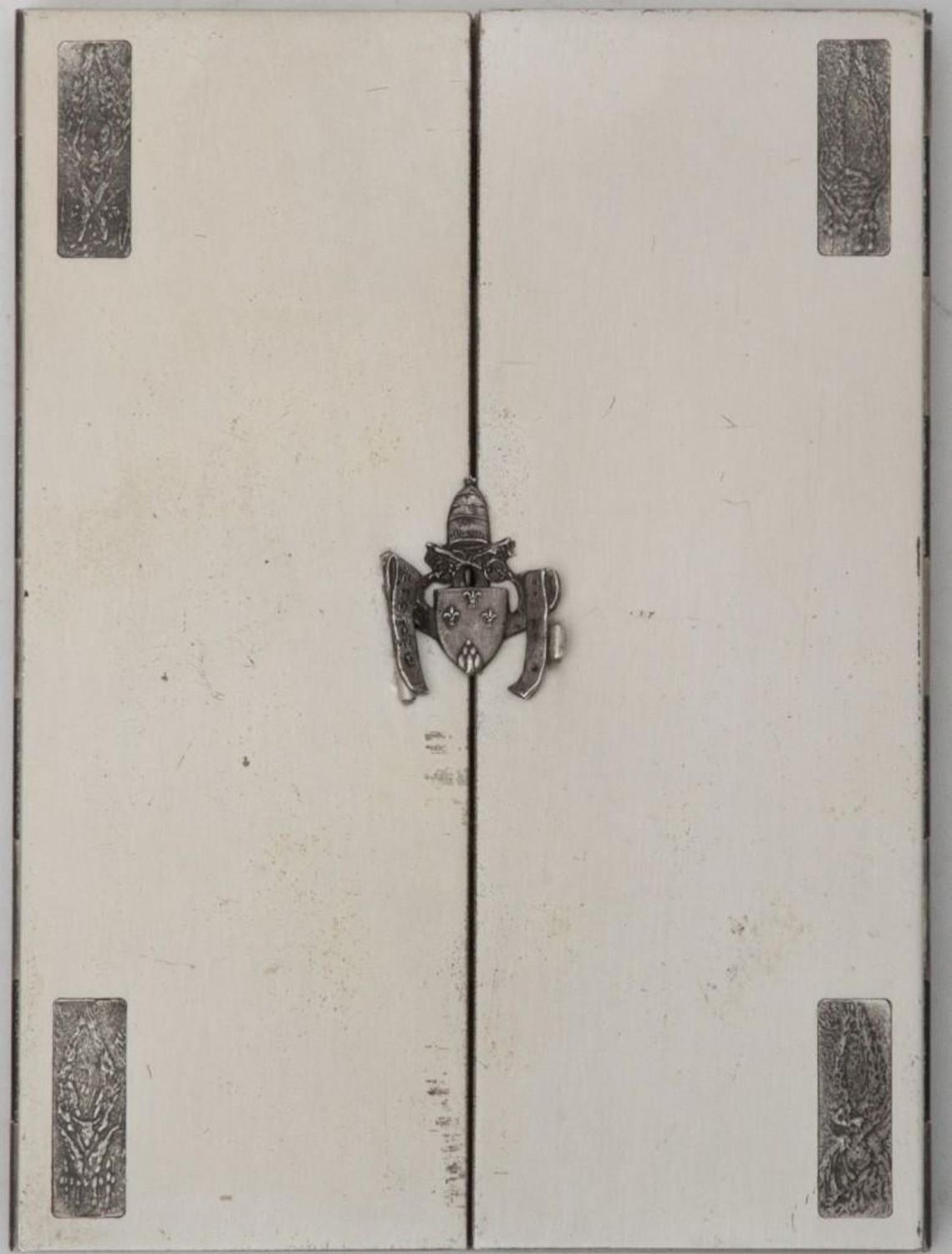 Lello Scorzelli signed 20th century PAPAL Seven Panel Silver Sculpted Folding Travel icon inset with silver on reverse. Papal Coat of Arms he seal reads "IN NOMINE DOMINI" The center panel depicts the nativity, flanked on each side by three smaller panels from old testament on one side and from the new testament on the other Measures 6 1/2"H x 18 3/8" W fully extended. Folded it measures 4 5/8"W approx. Marked "800" Silver. IN GOOD CONDITION. Weighs 52 Troy ounces