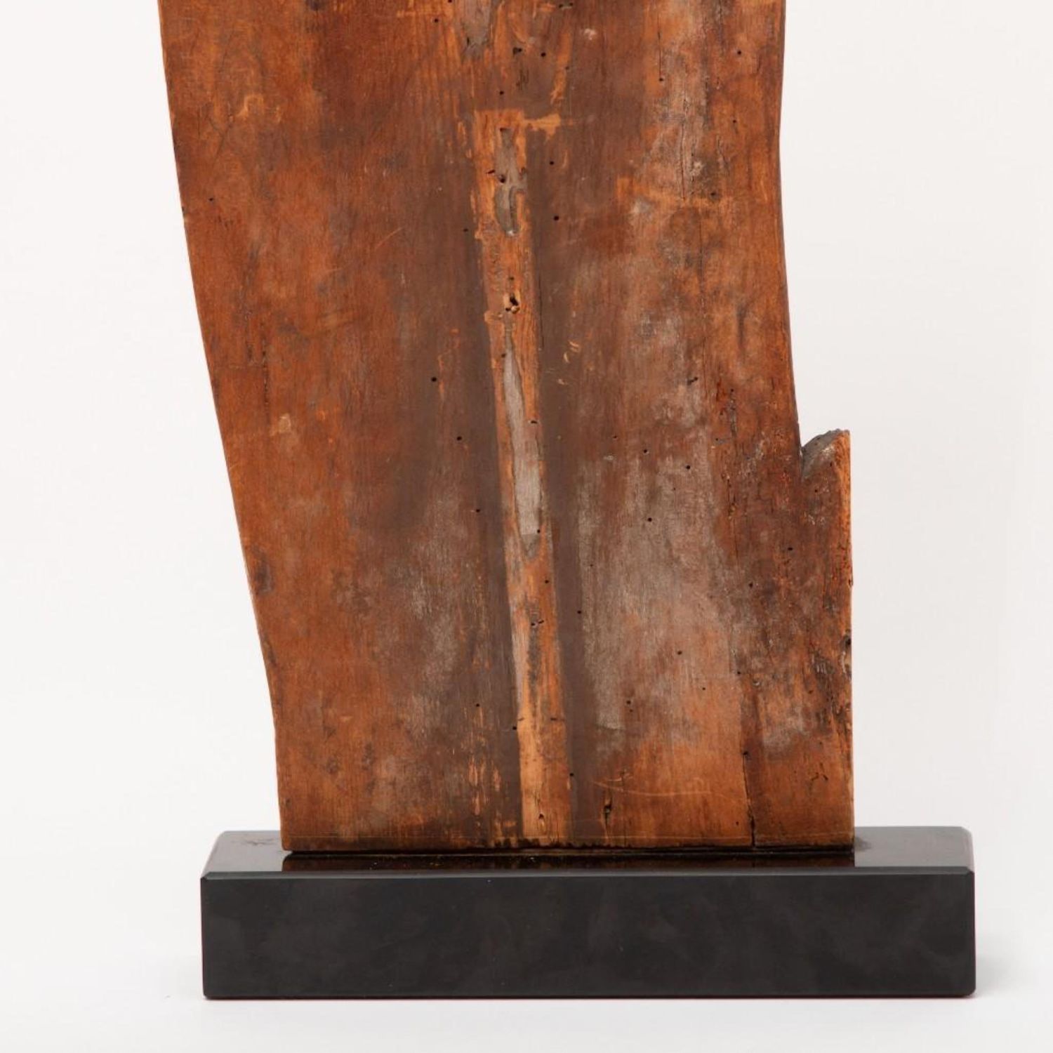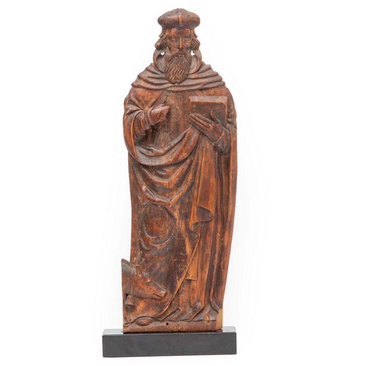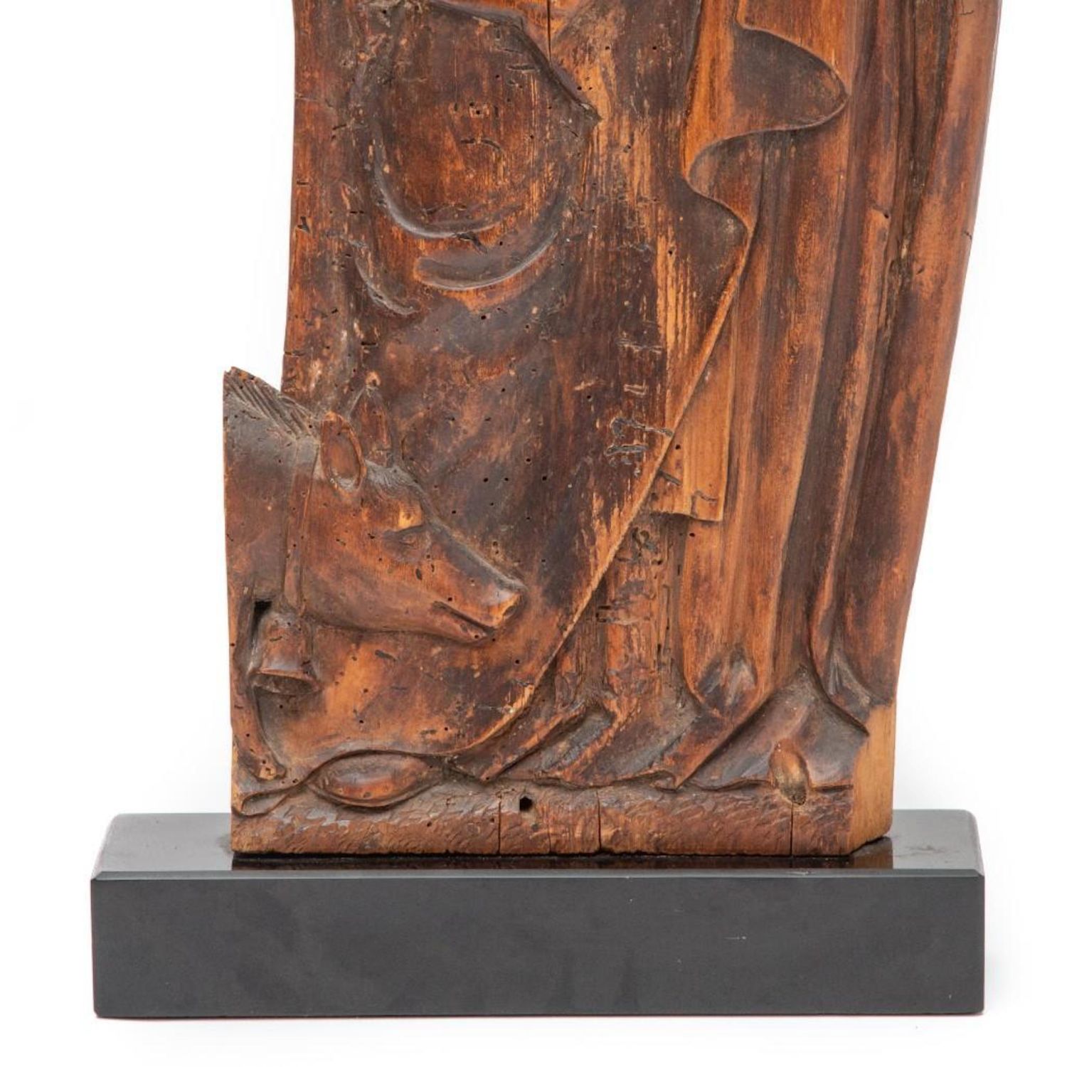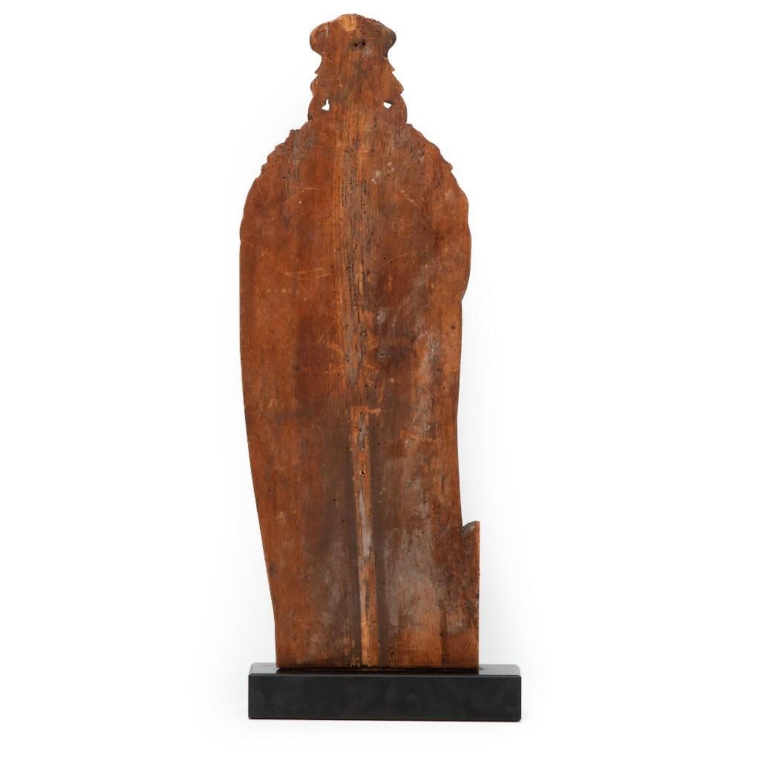 Antique German Mediaeval-style Wood Carving on marble base. Measures 31"H x 12"W x 2.25"D approx. some old wear and damage restoration but in good condition considering its very old age