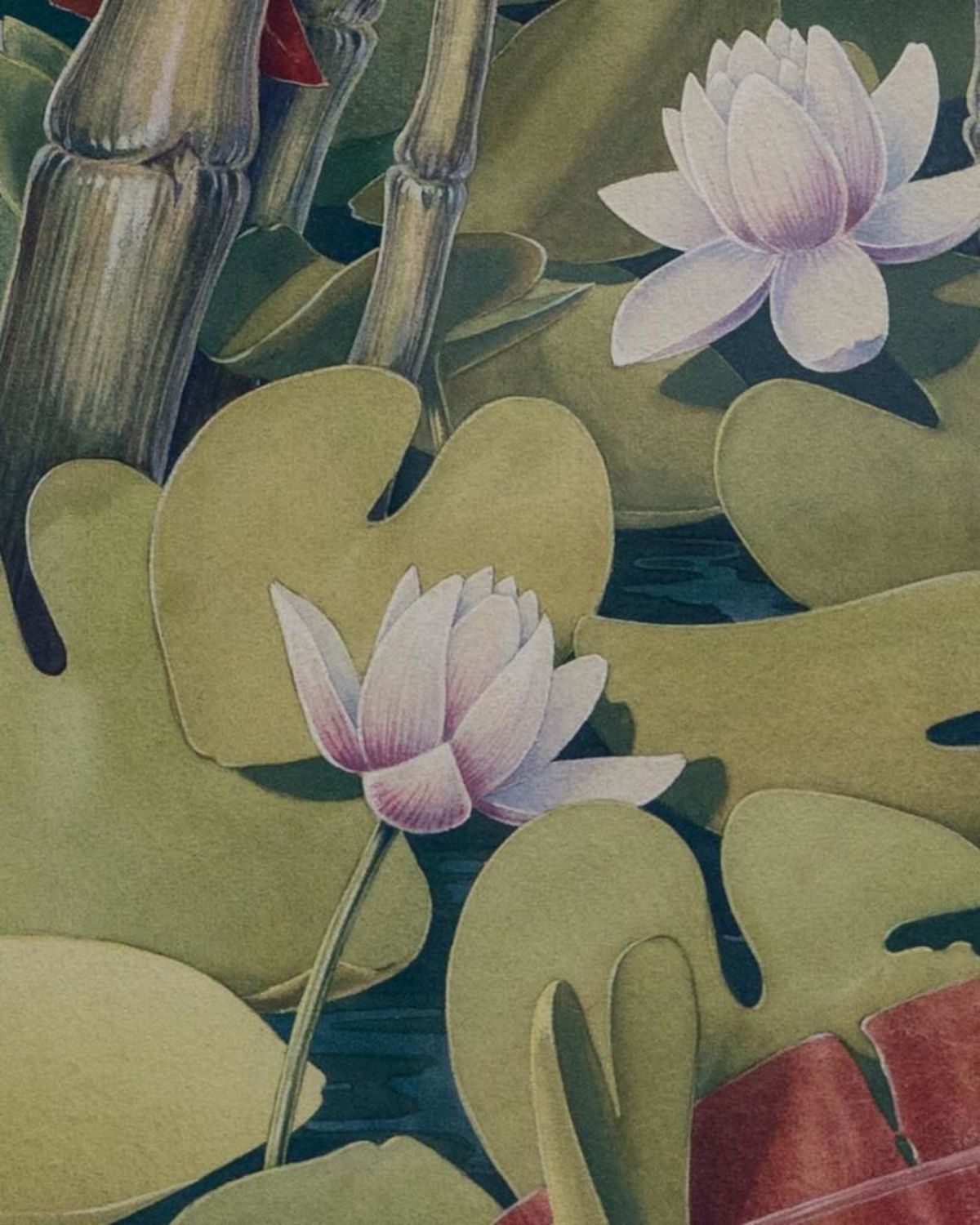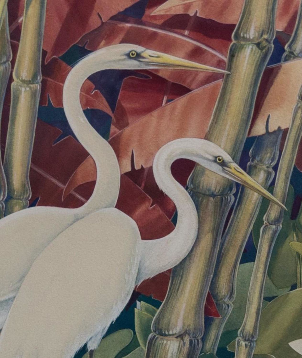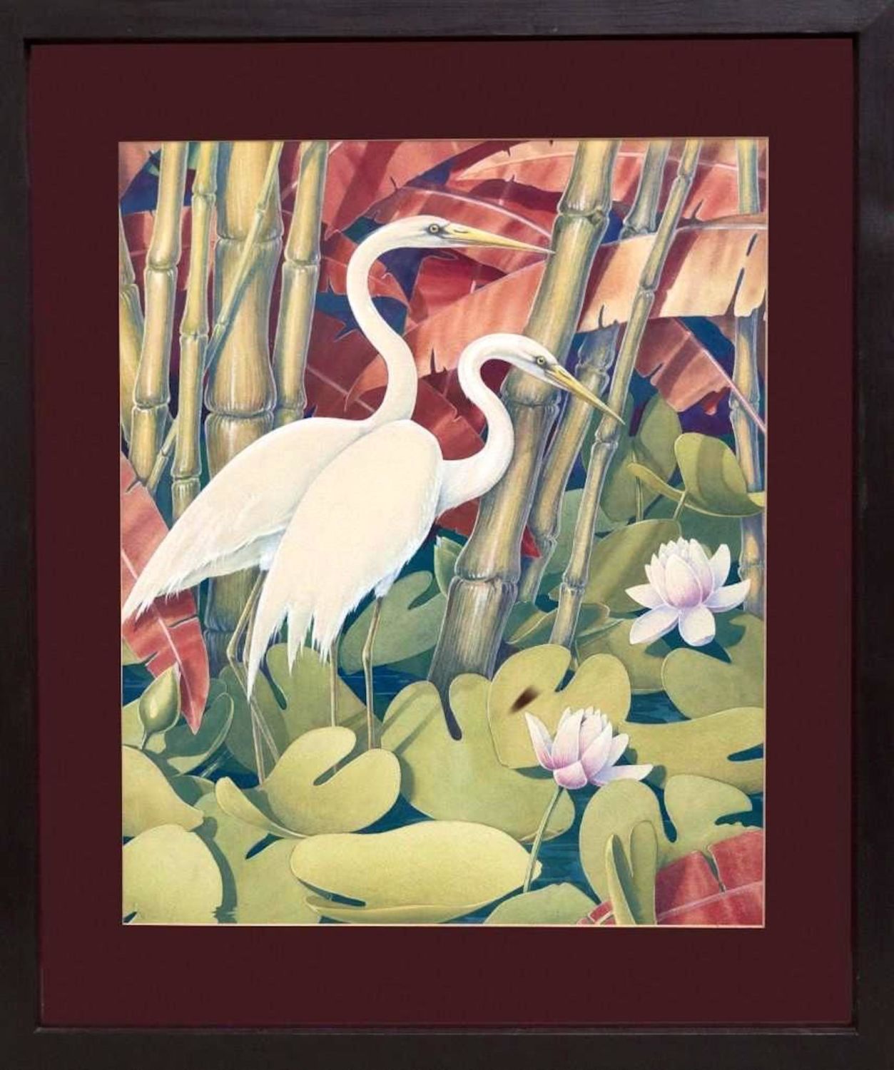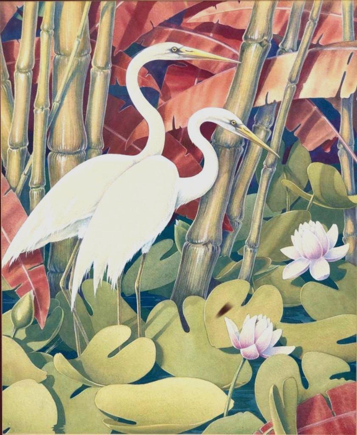 Jessie Hazel Arms Botke (attrib) Gouache of Cranes. Measures 23.5”W x 28”H Framed. 16 3/4"W x 20 3/8"H Art approx. During the height of her career, Jessie Arms Botke was proclaimed by critics as the greatest decorative painter of the West. The art world consisted primarily of male artists in the early twentieth century, yet Botke quickly earned a name for herself through a strong work ethic and an undeniable talent. She is primarily remembered for her ornate depictions of exotic birds, especially pelicans, geese, ducks, cockatoos, and peacocks, as well as her elegant paintings of tropical flowers, which inspired her to a high level of artistry. IN GOOD CONDITION