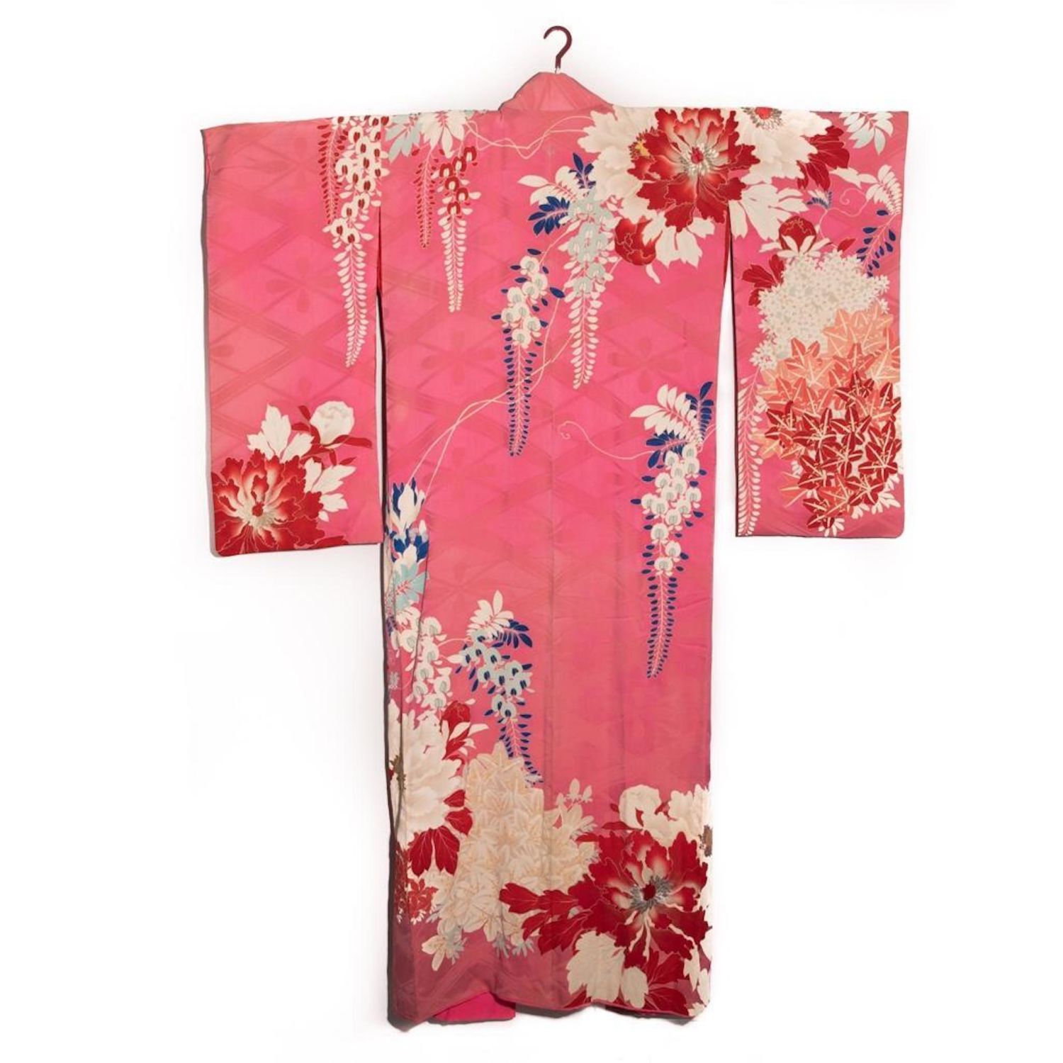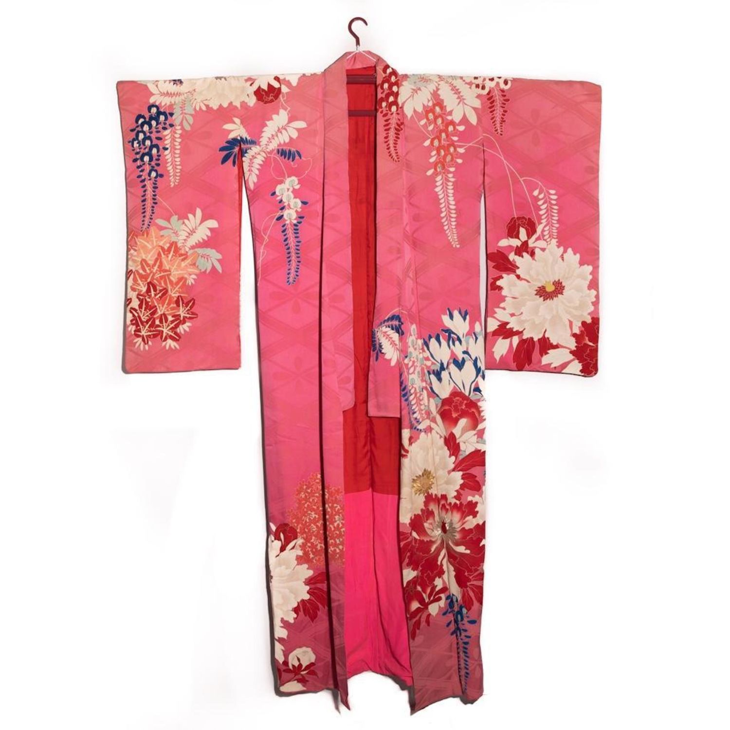 Japanese 1920’s Japanese handwoven silk damask formal crested kimono, hand decorated with yuzen resist dyed design, surihaku metallic platinum leaf and metallic gold and metallic silver thread embroidery accents. This vibrant pink shippo pattern damask silk kimono features peony, hibiscus and botanical motifs rendered in off-white, platinum, red, sapphire and light blue. A metallic silver embroidered kamon crest is presented to the center of back. It is lined in red and hot pink silk in good condition. 48.5" sleeve span, 61" overall length. We are not kimono experts and will be limited with what we can answer.