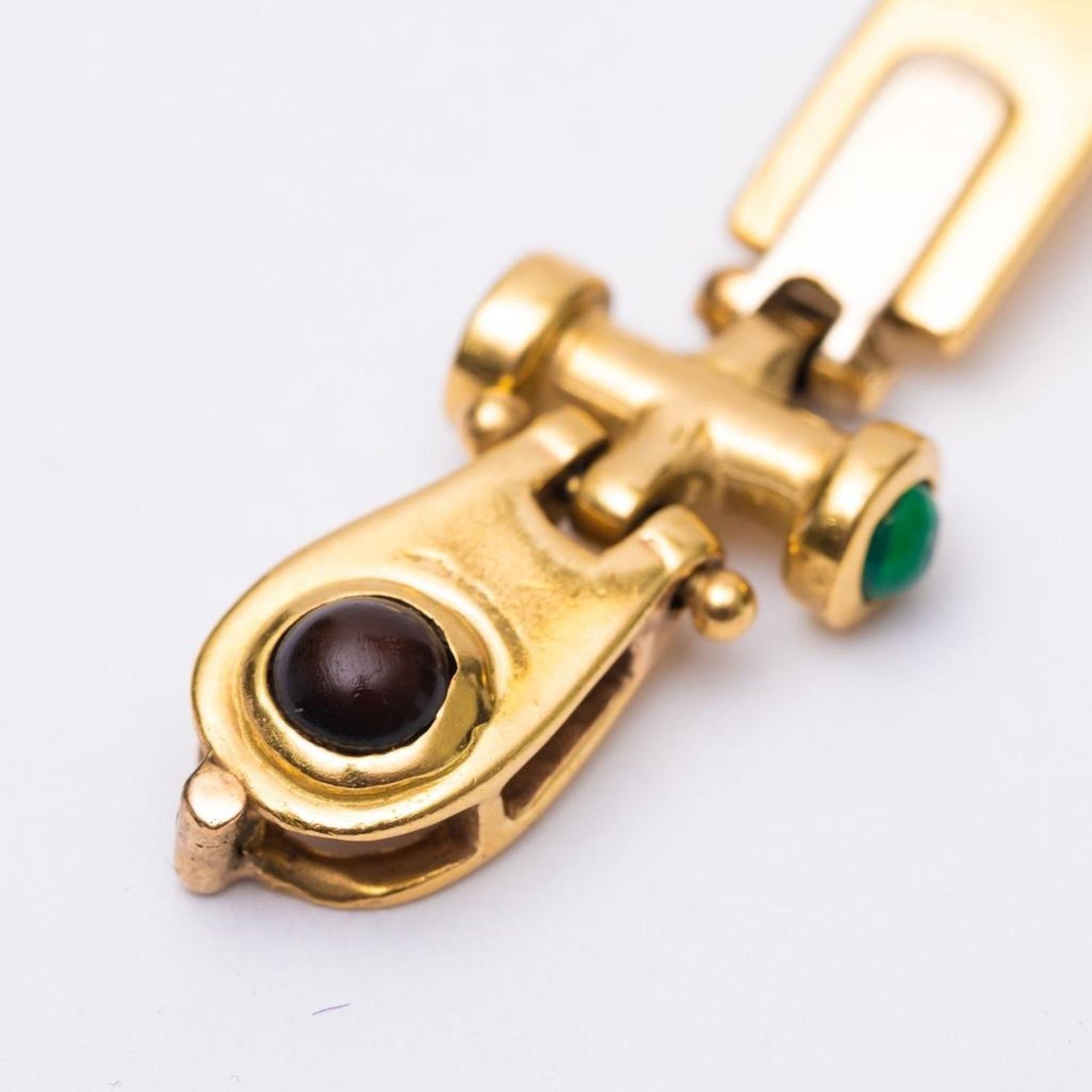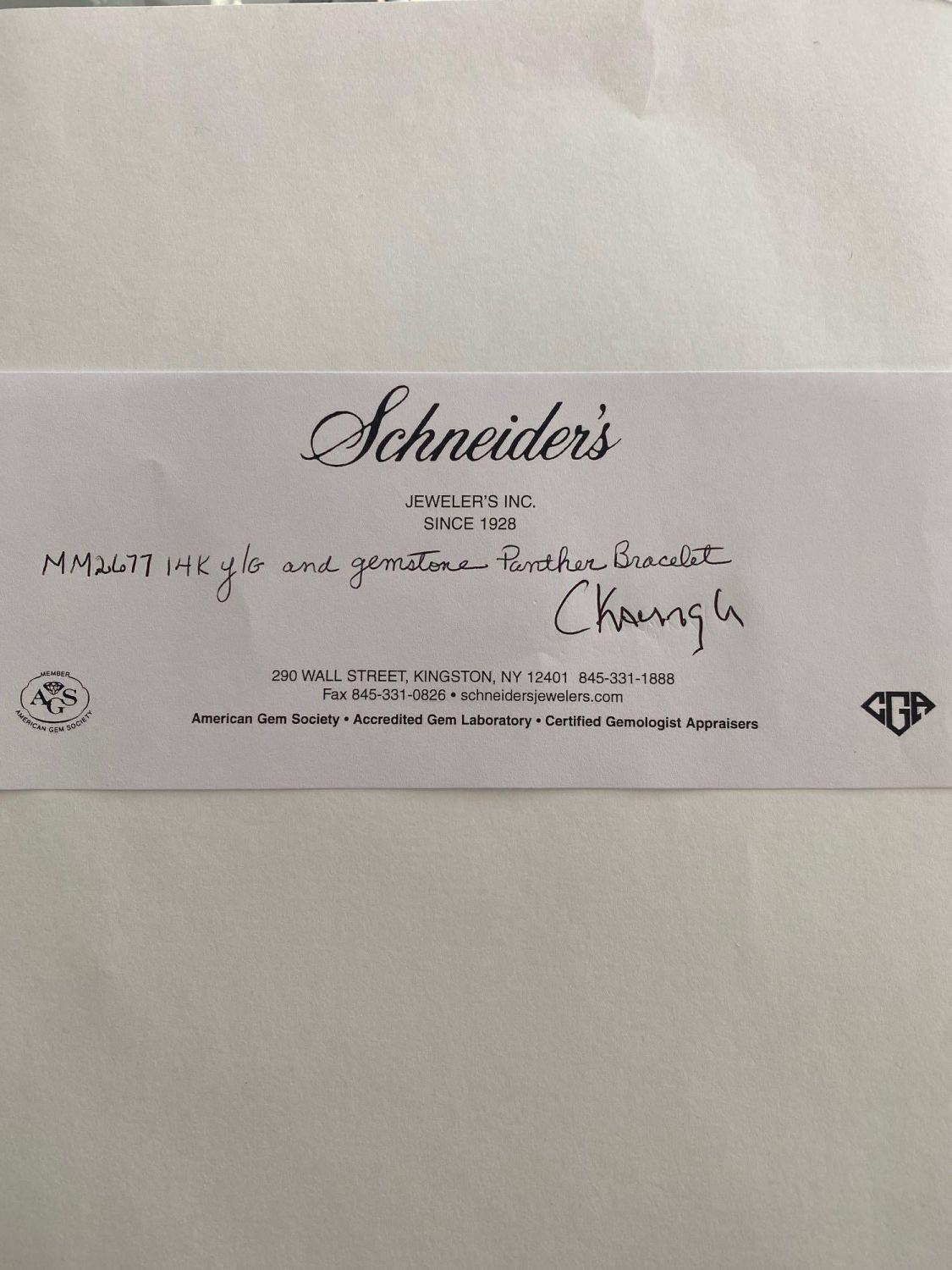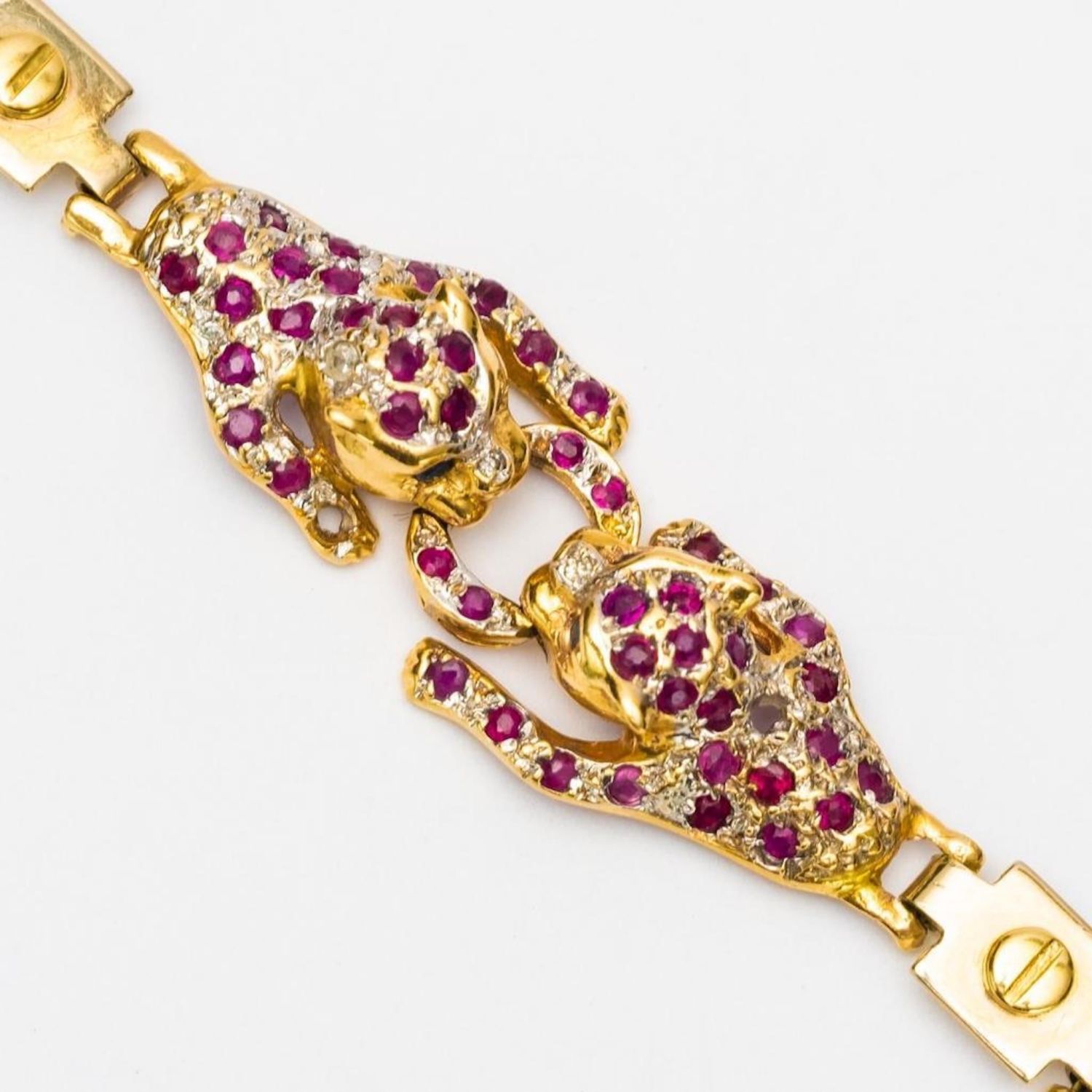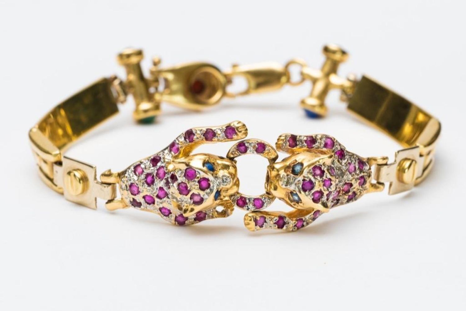 Vintage panther 14K karat gold and gem-set bracelet designed as Cartier style panthers set with circular-cut rubies, sapphires, emeralds, diamonds, weighs 15.8 grams, Measures 7"L and in good condition.