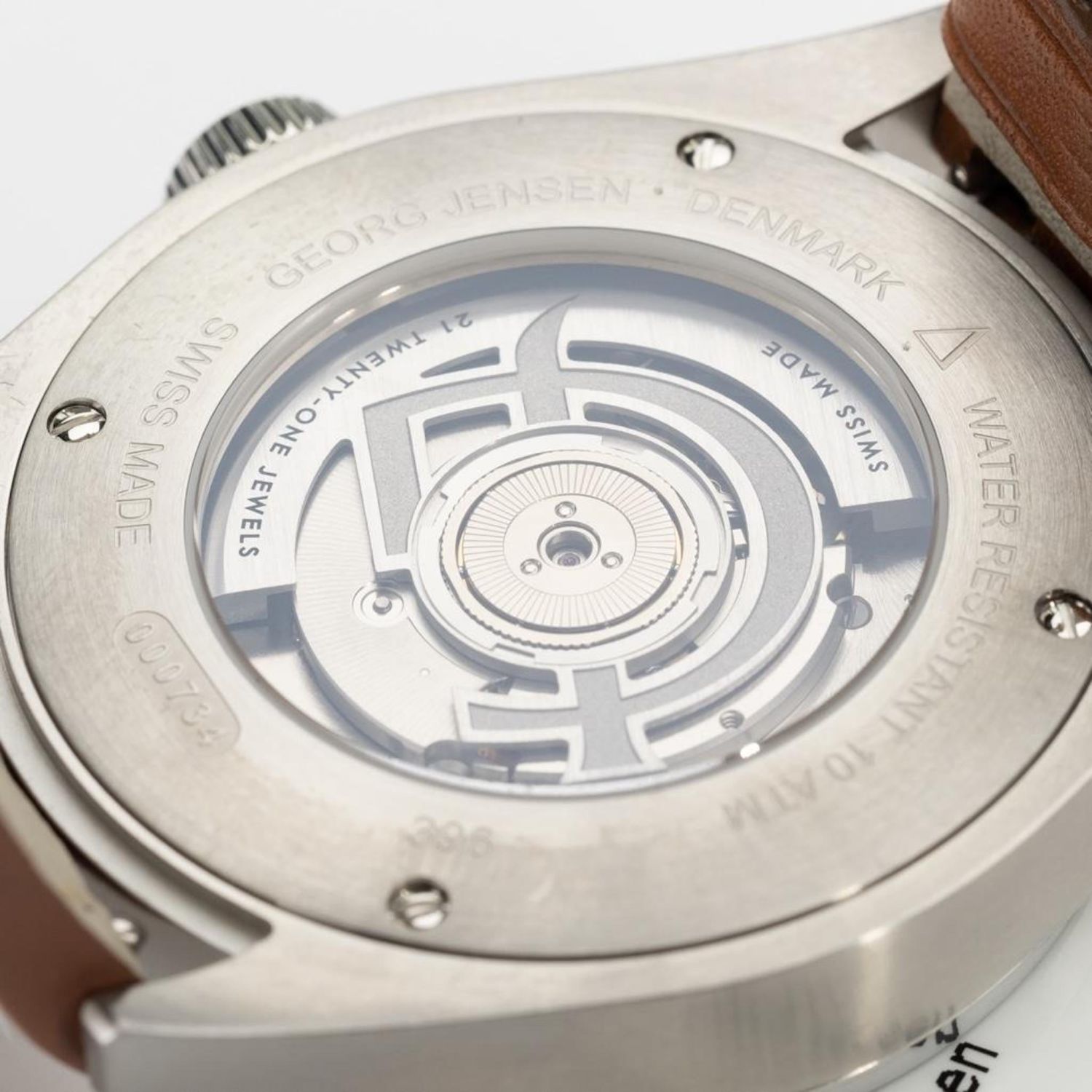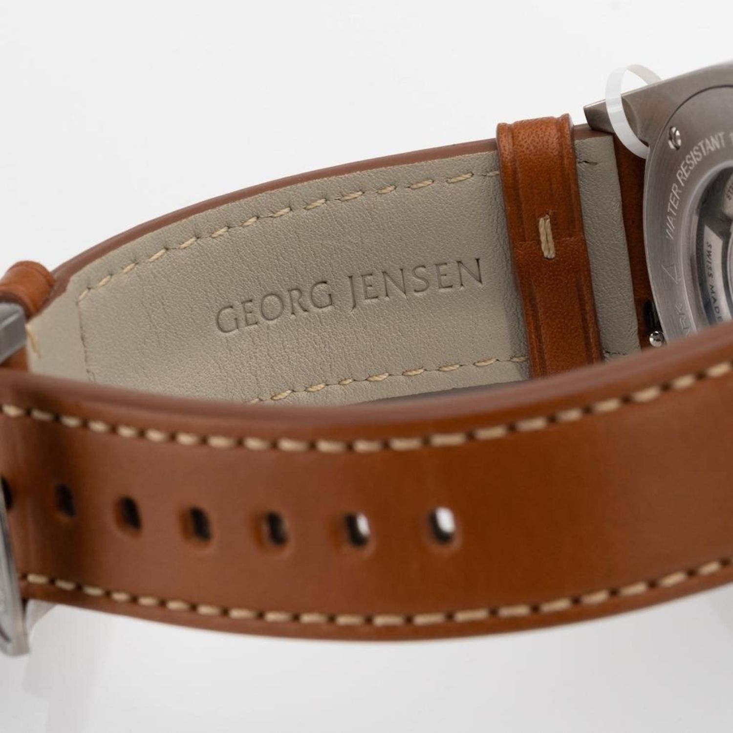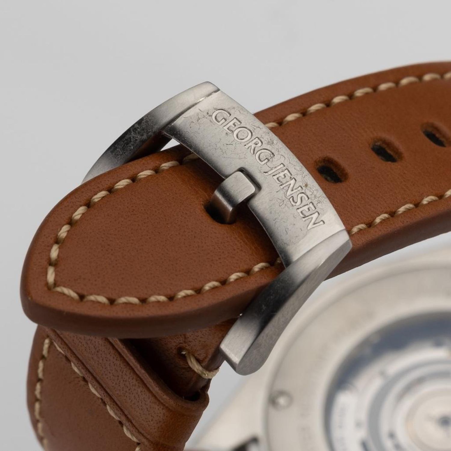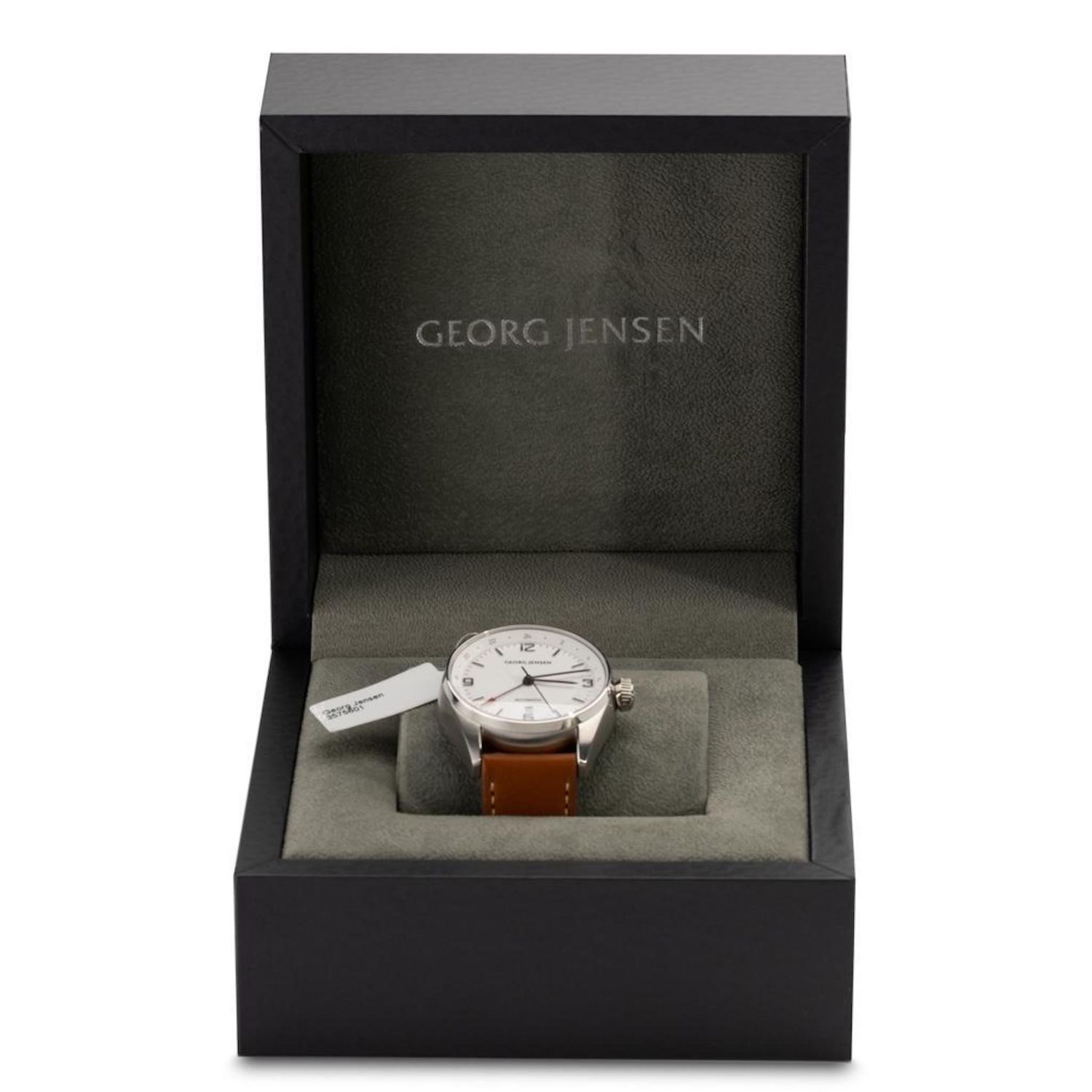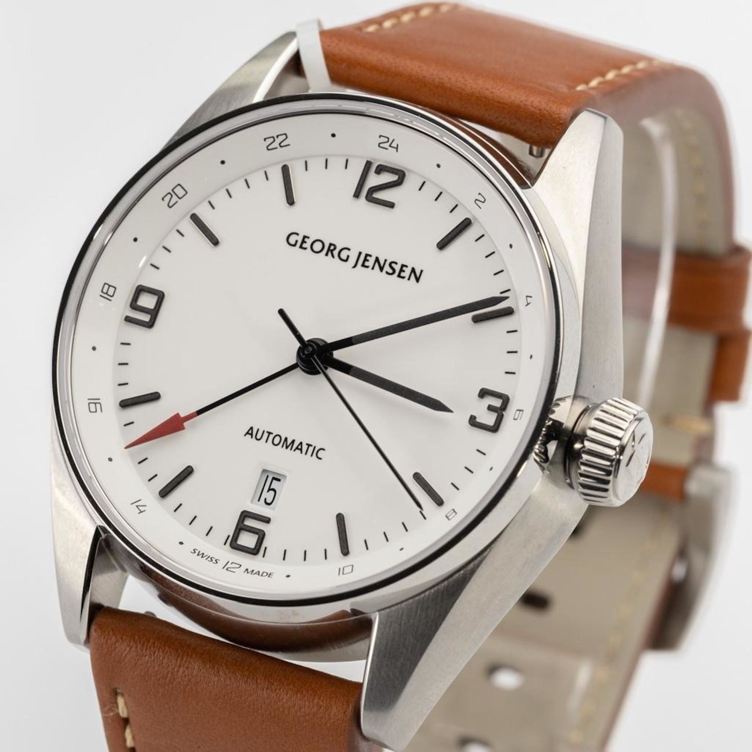 Georg Jensen Delta GMT automatic watch, Brand New..featuring full size brown leather band with GJ buckle. White dial with black markers, center second hand. Working order.. Comes with box. Case 42mm. . Retails for $2650. running when examined, not guaranteed in terms of function or accuracy..