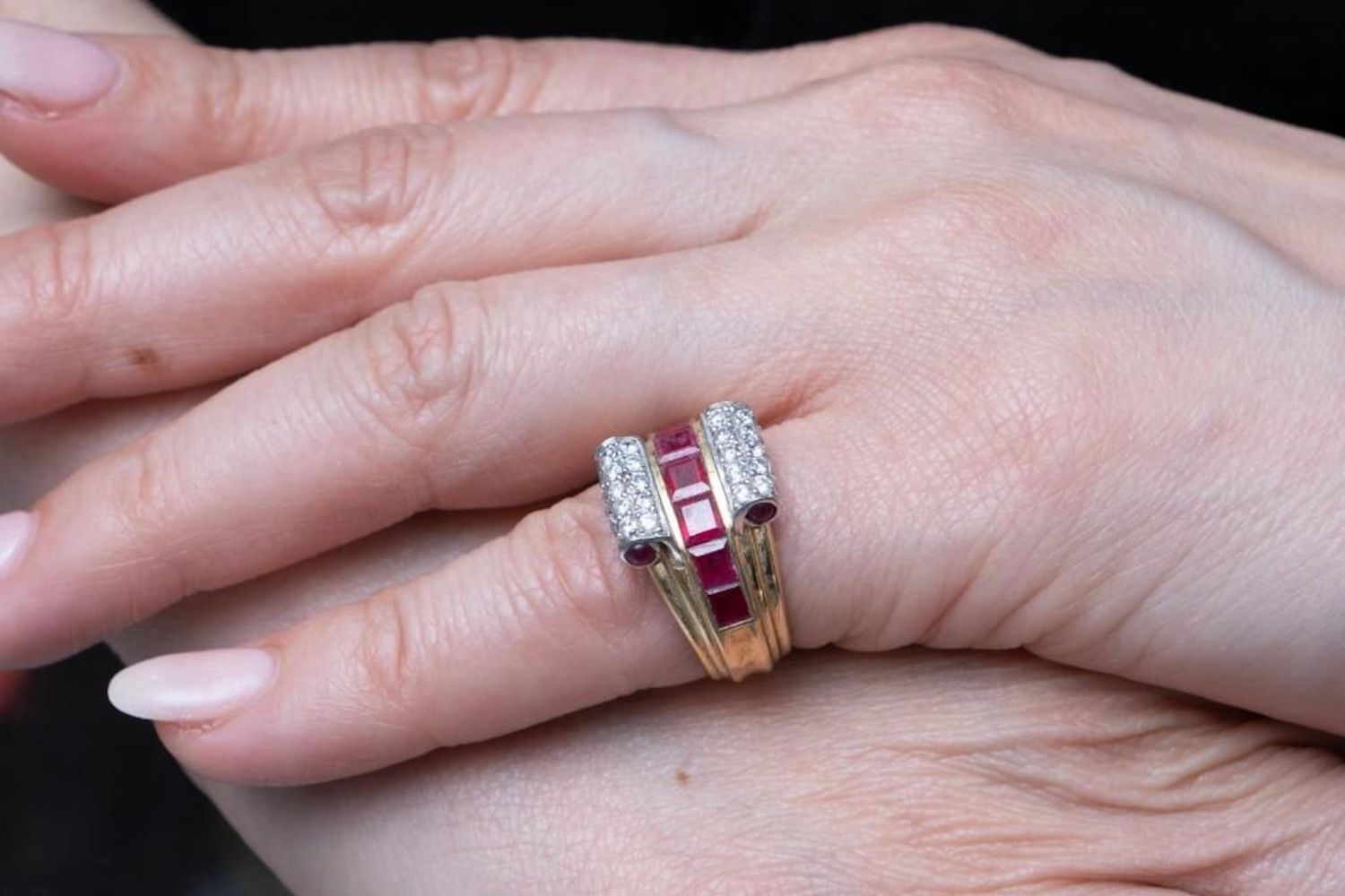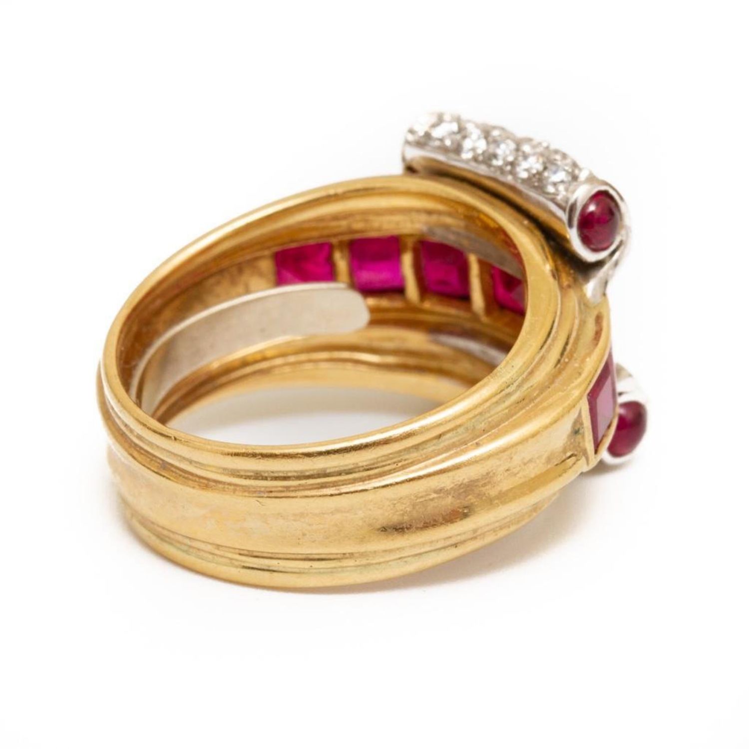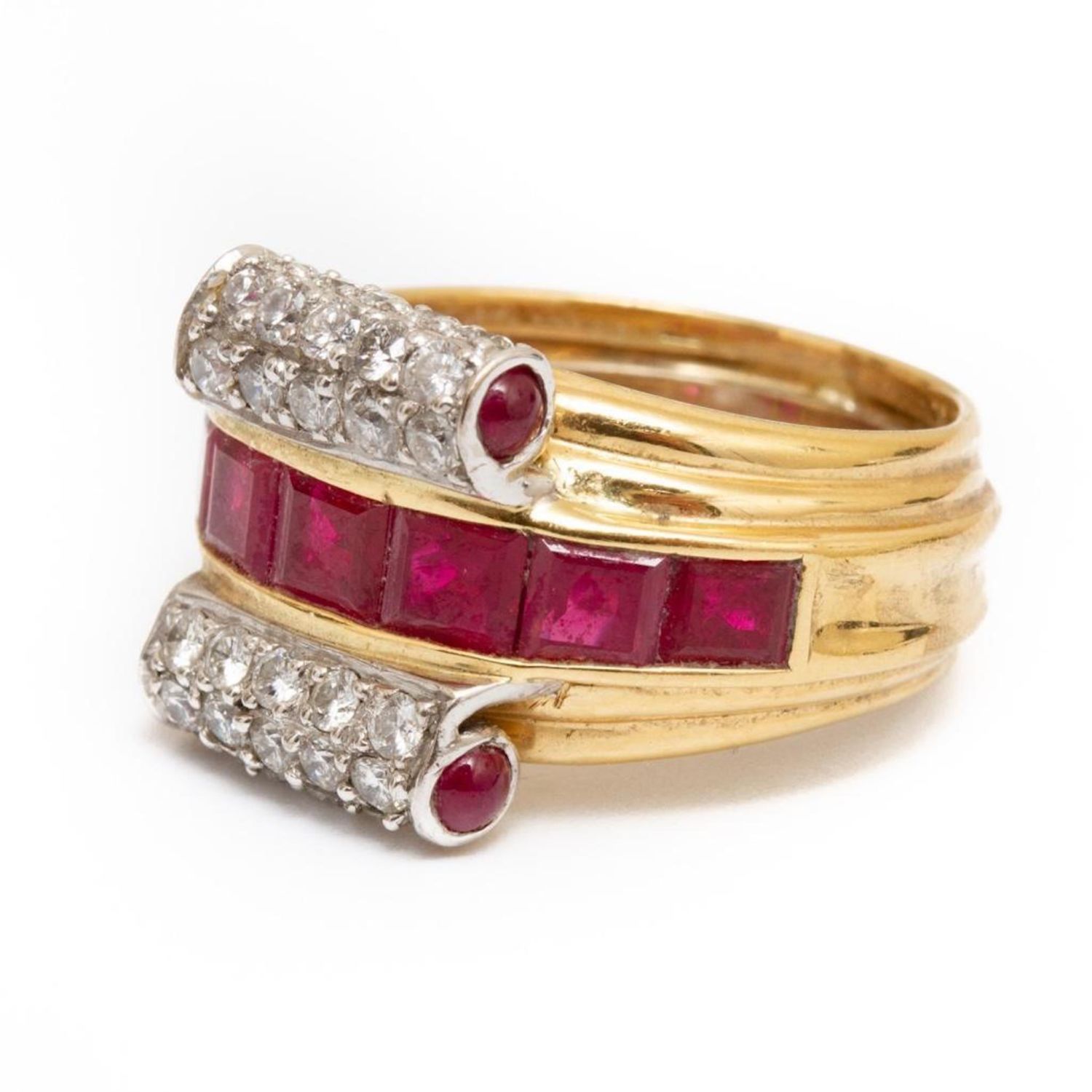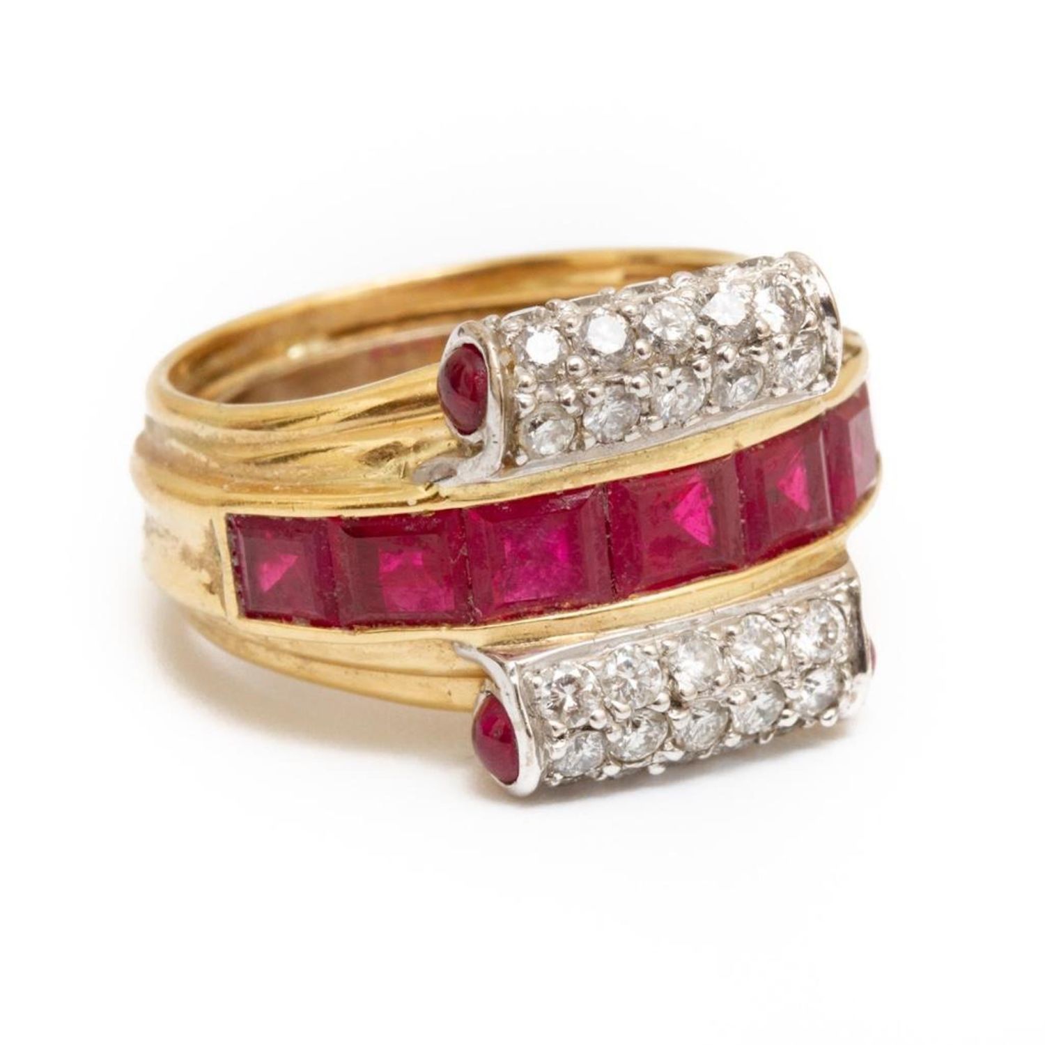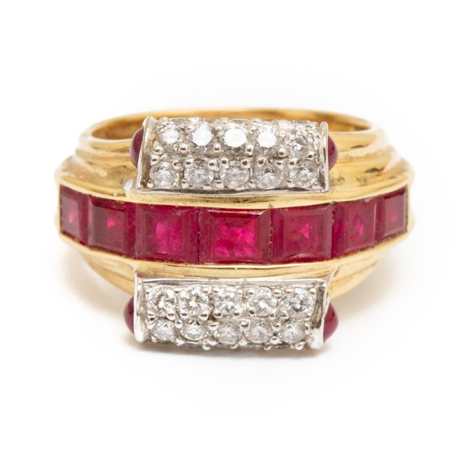 Vintage 14k Ruby RING SIZE 7 square-cut rubies ap. 1.65 cts., 30 round diamonds ap. .75 ct. APPROX 6.6 DWT size 6.5-7 . Ring has Stabilizer d estate noted jewelry collector Park Avenue New York in good condition