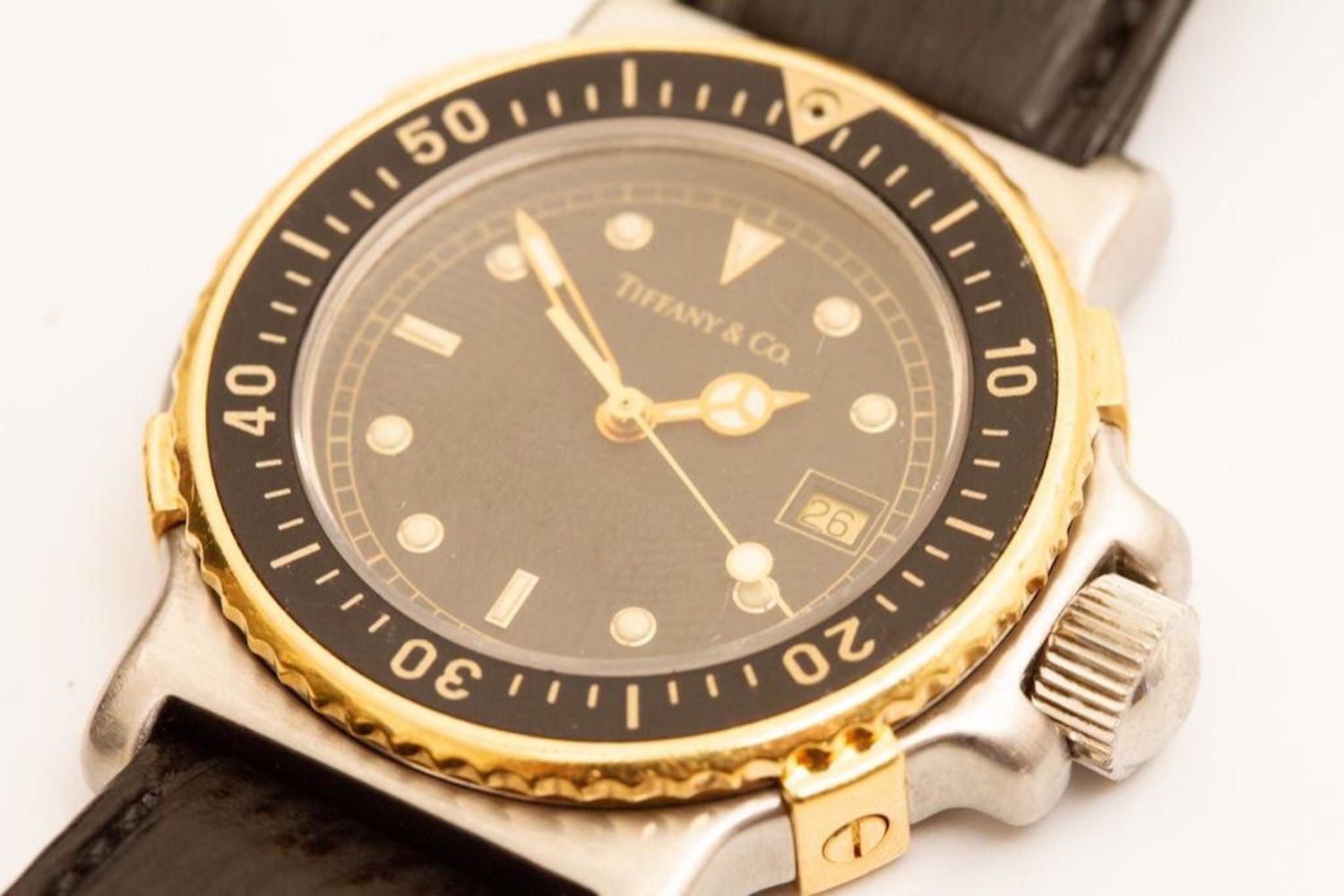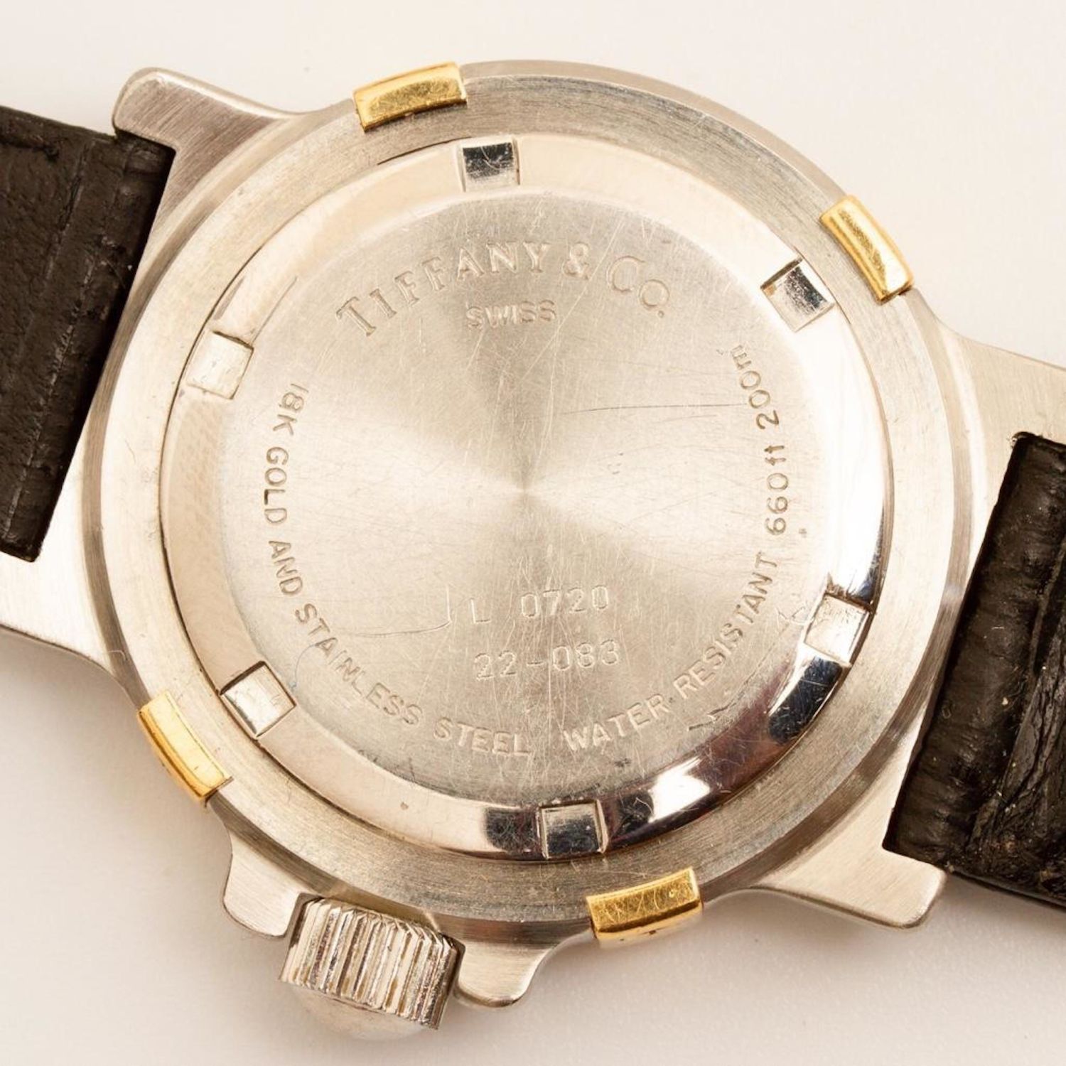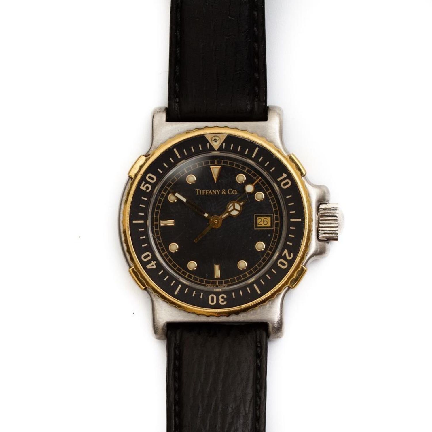 Vintage Tiffany & Co 18K Gold and Stainless Steel Diver Wristwatch. running at time of evaluation, but not functionality not guaranteed . Watch face measures 1 1/8". Measures 8.25"L. Movement ETA Cal. 956.412,
