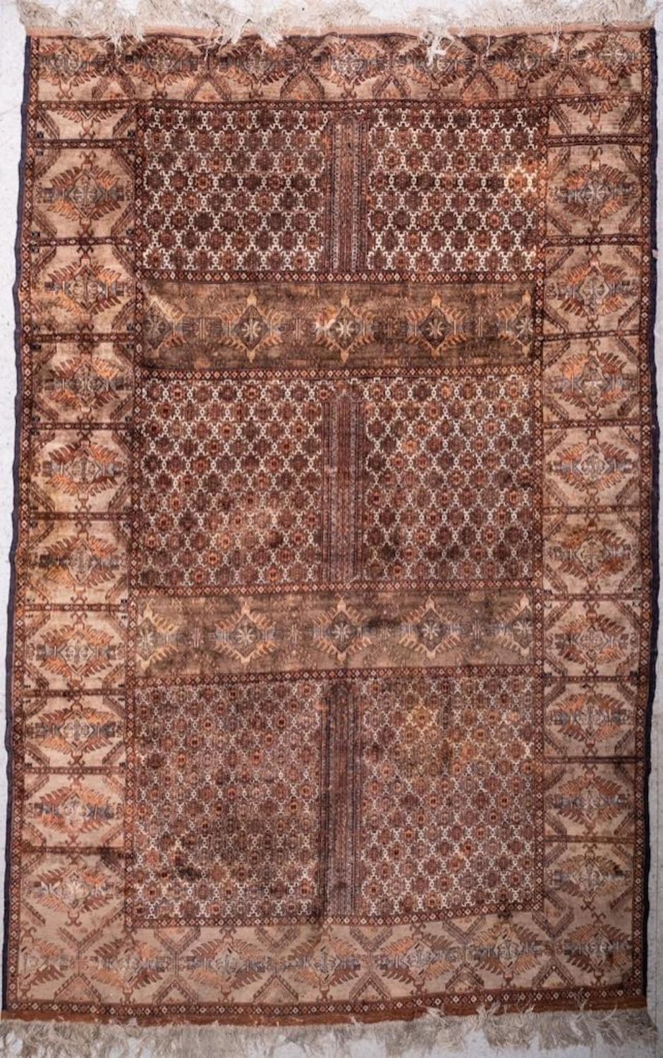 Rare and Magnificent ANTIQUE Caucasian silk carpet, tiny knots Dimensions: 105" x 67" (8’9" x 5’7"). Possibly a museum piece, it’s extremely rare to see a large silk carpet on the second hand market, that is from the turn of the century(c.1890) that isn’t worn OR threadbare. Silk as a rule, does not last very well after 75 or 100 years, and this carpet is in fantastic condition, considering its age .There is minimal damage, and minimal wear. Another strange and wonderful aspect of this carpet is the design. I can say in my lifetime I have never seen a Caucasian style silk rug, of this size and quality. The silk carpets tended to be Tabriz or Kerman style, and the nomadic weavers in the Caucasian mountains tended for a coarser thicker wool, something that would last through the cold months of winter. Silk was for the wealthy urban villages, the palaces and mansions, often hung on the wall, for its fragile nature. Another shocking aspect of this carpet is the knots. They seem to be microscopic. See the photos. Mary Kaplan collection, NYC. Columbia University Press published a book on the Kaplan family collection in 1981(The Alice M Kaplan Collection, cataloged by Linda Bantel and published by the Advisory Council of the Dept of Art History and Archaeology, Columbia University, 1981.Printed by the Steinhour Press, Distributed by Columbia University Press.).The collection includes museum quality paintings and drawings by Edgar Degas, Egon Schiele, Ammi Phillips. Giorgio Morandi and John Peto, as well as other 20th century masters. Mary Kaplan is the daughter of Alice Kaplan.